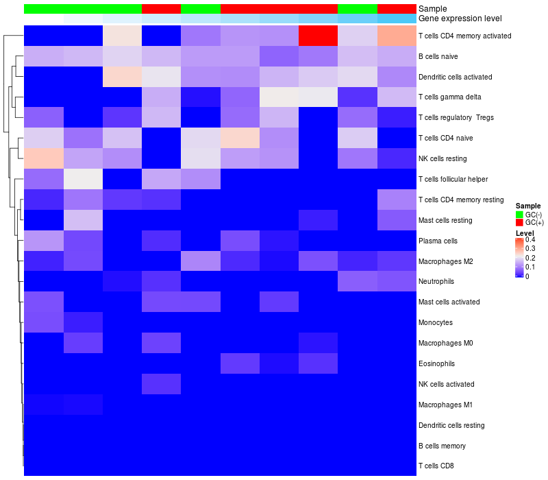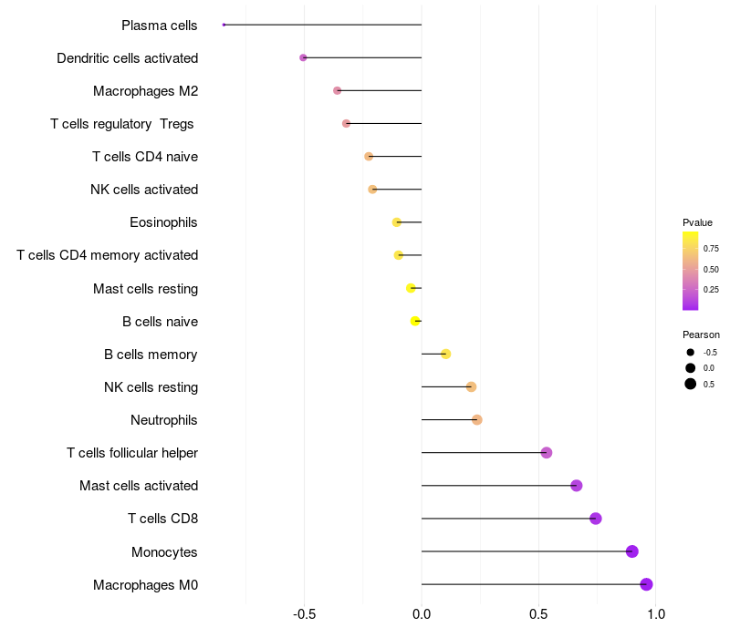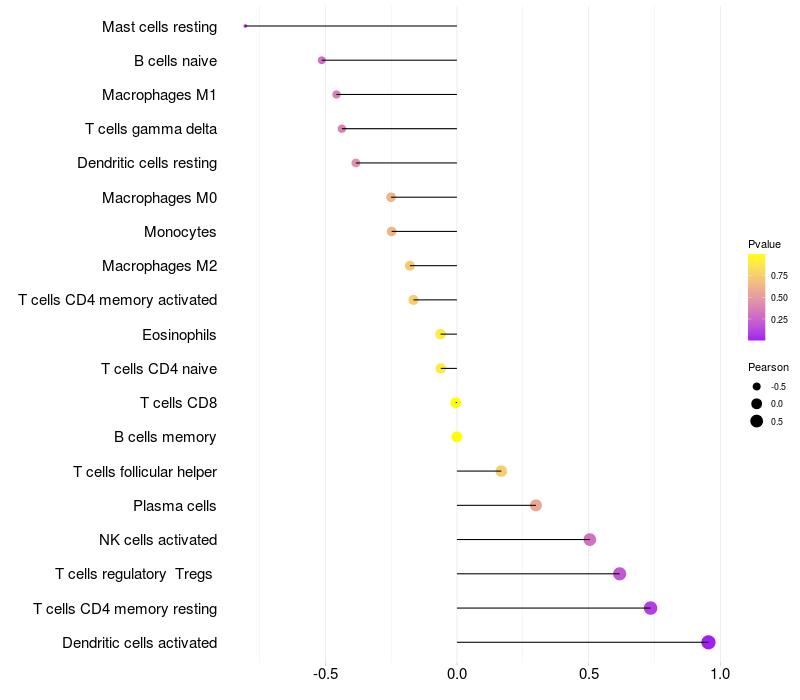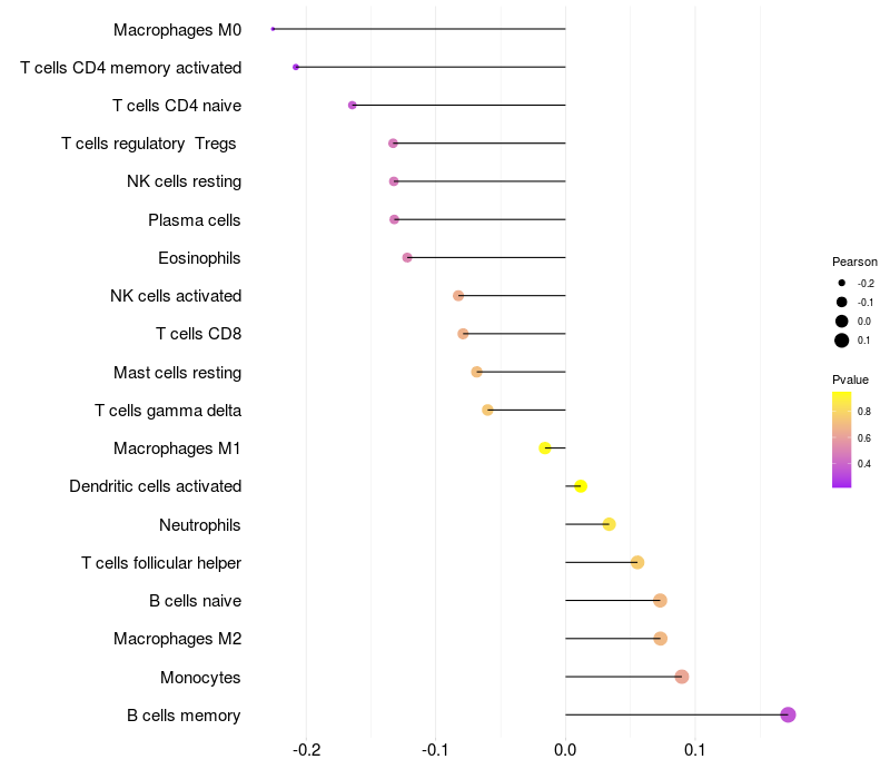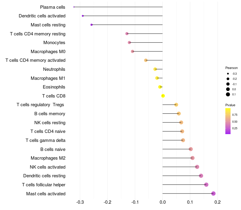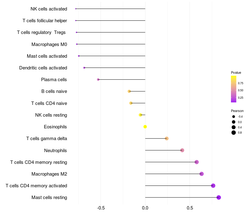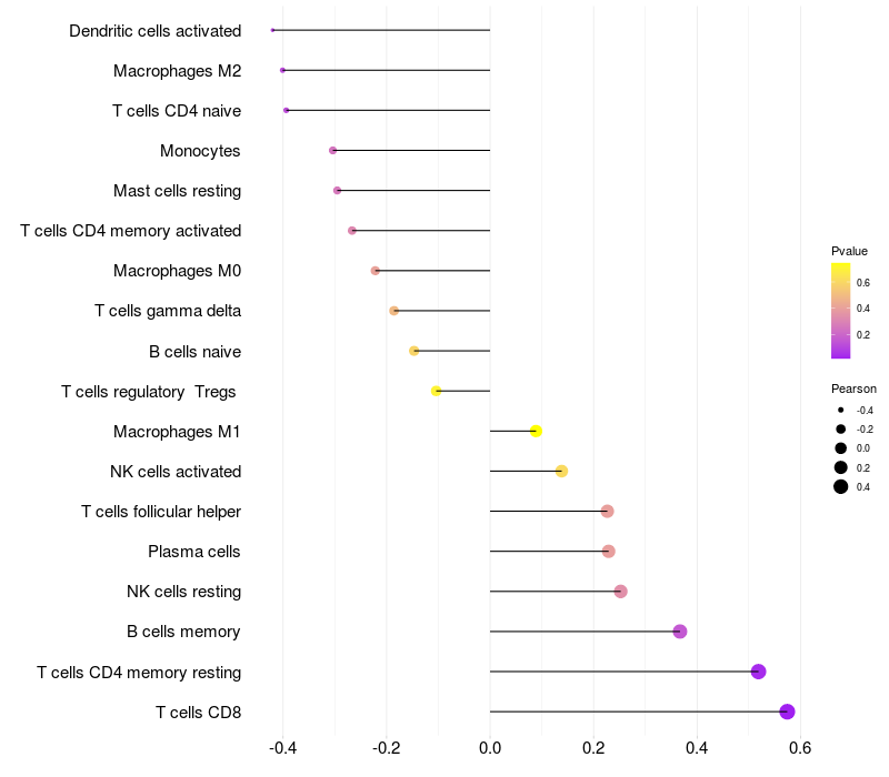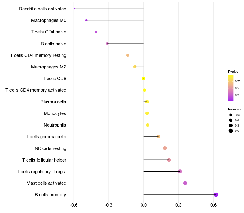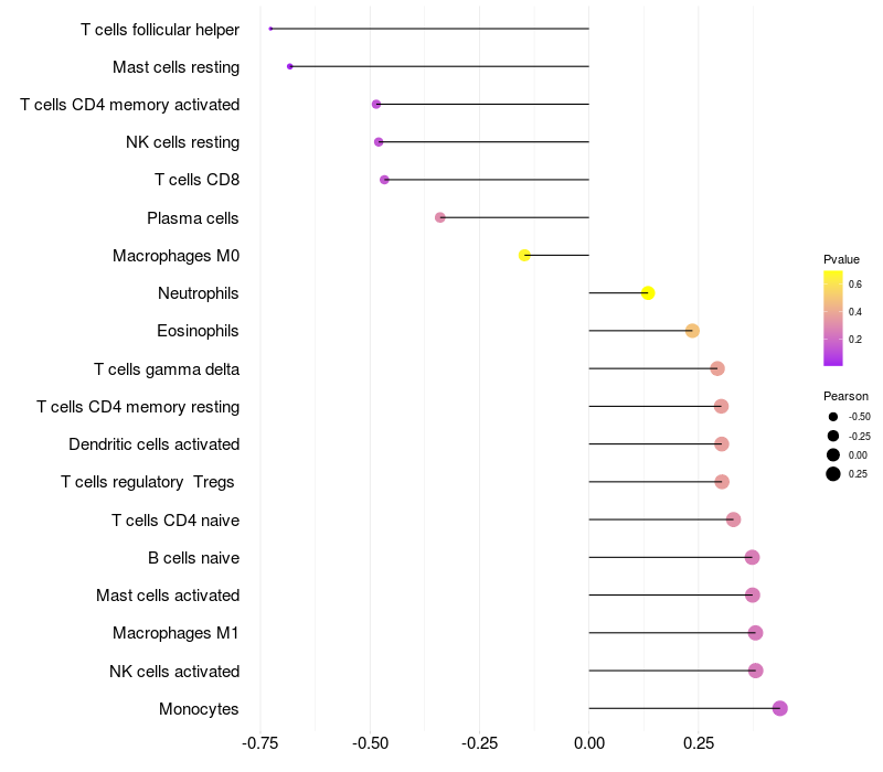 Lollipop of KHDRBS2 expression and immune infiltrating cell level correlation result in EBV+ samples
