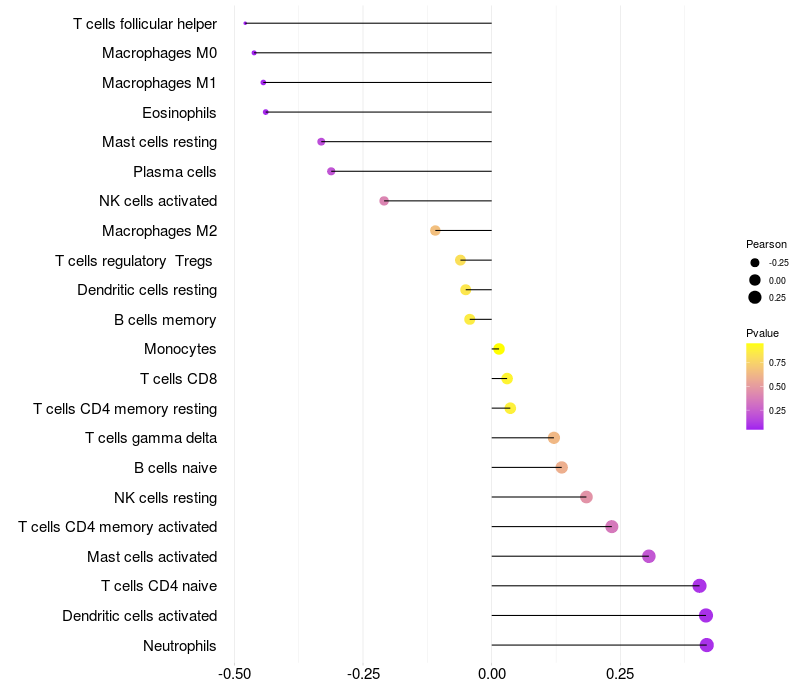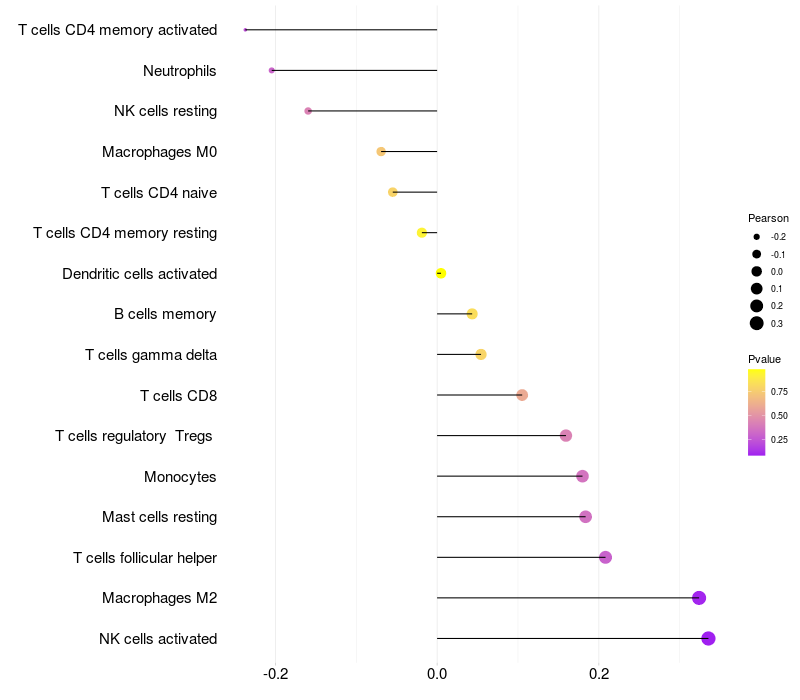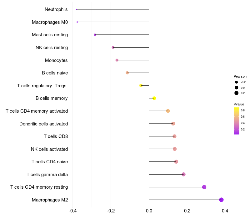 Lollipop of KIAA1586 expression and immune infiltrating cell level correlation result in HTLV1+ samples