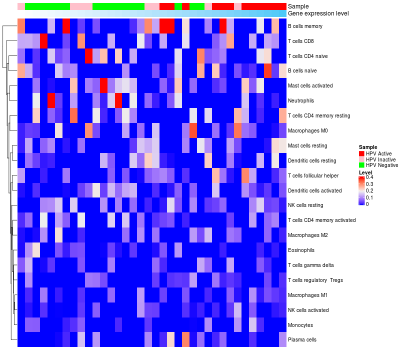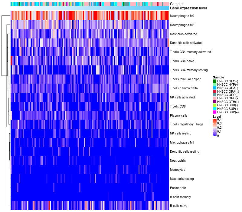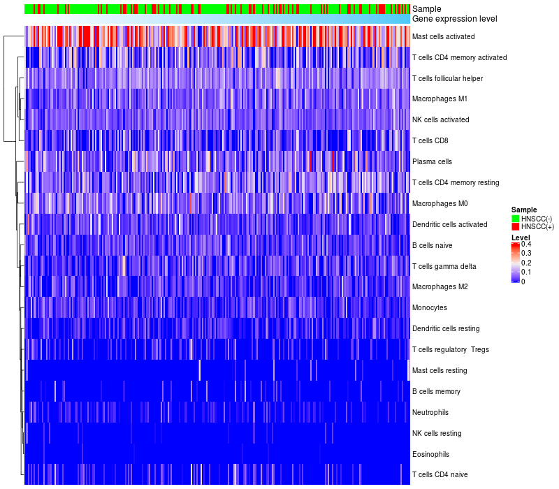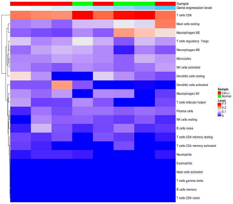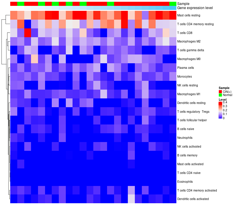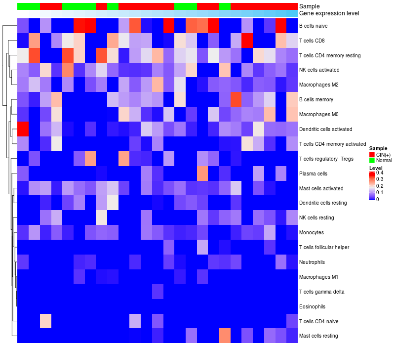 • Left: Heatmap of target gene expression and the level of various types of immune cells (cell type fractions) in all samples based on CIBERSORT method.