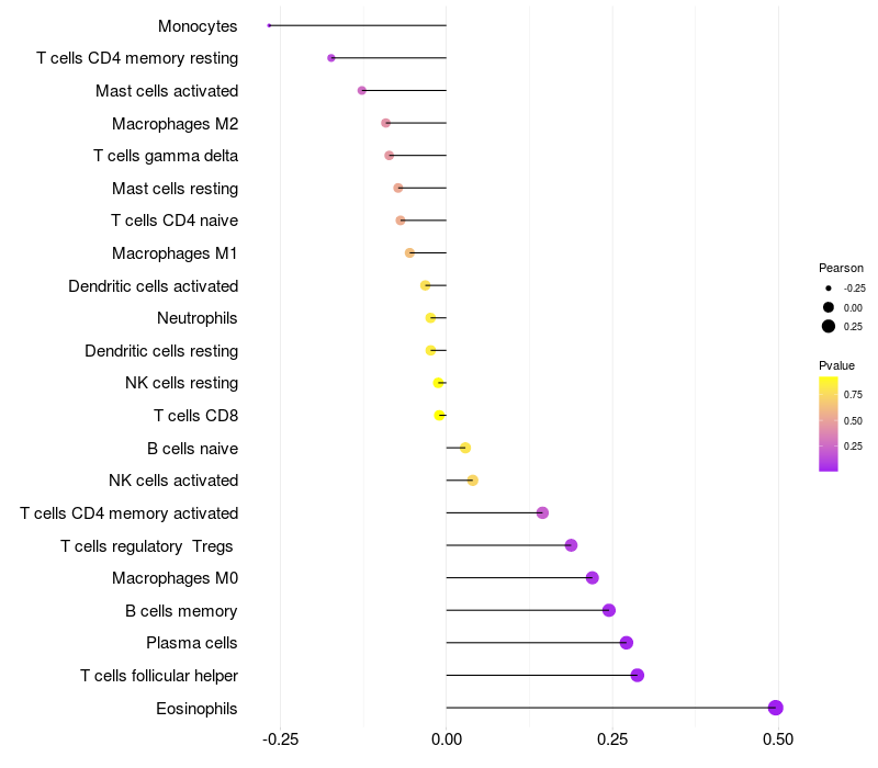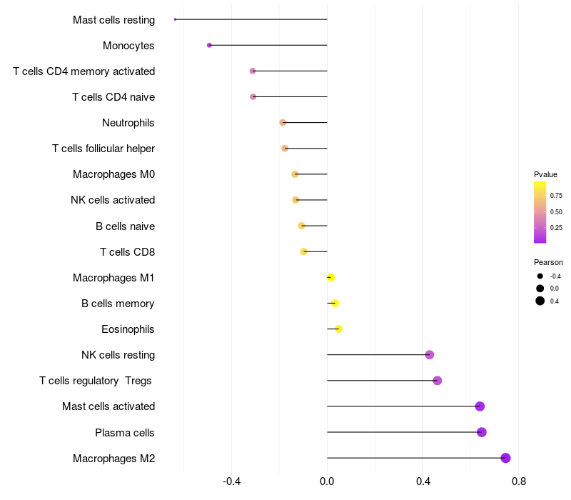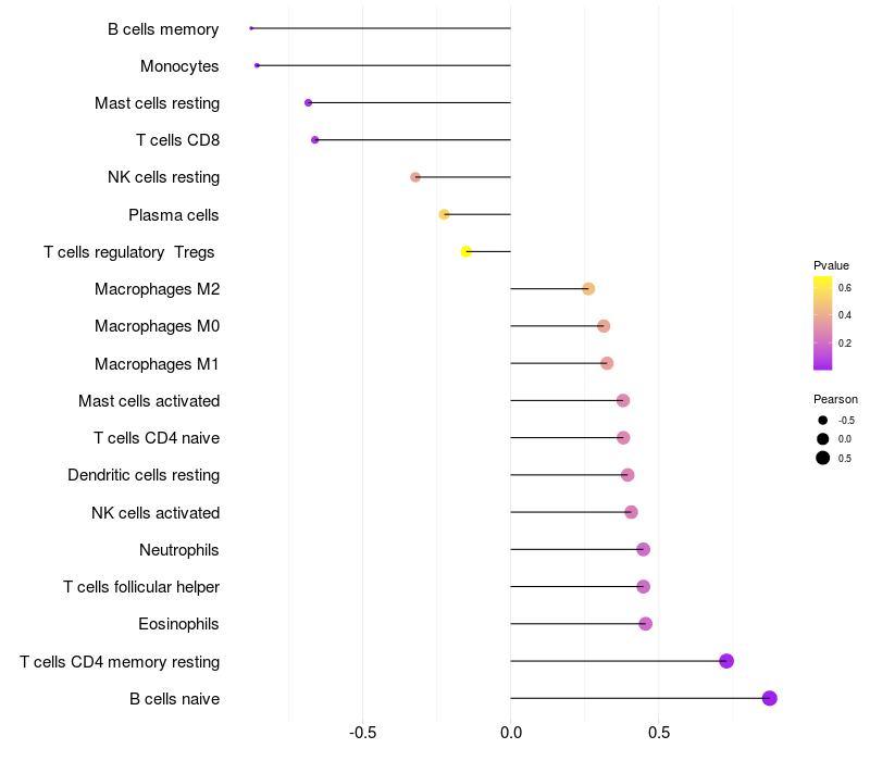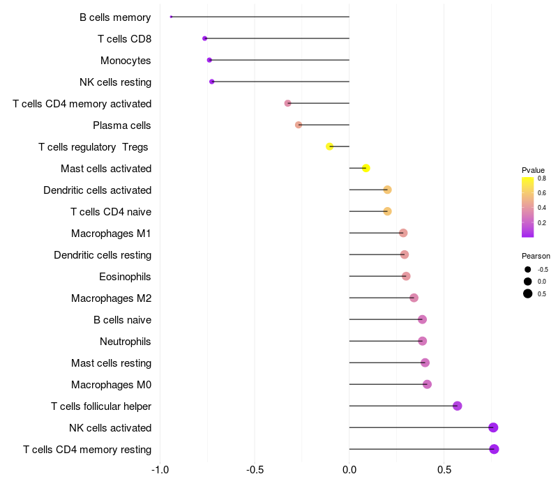 Lollipop of KLC3 expression and immune infiltrating cell level correlation result in HBV+ Chronic HBV (CHB) infection samples
