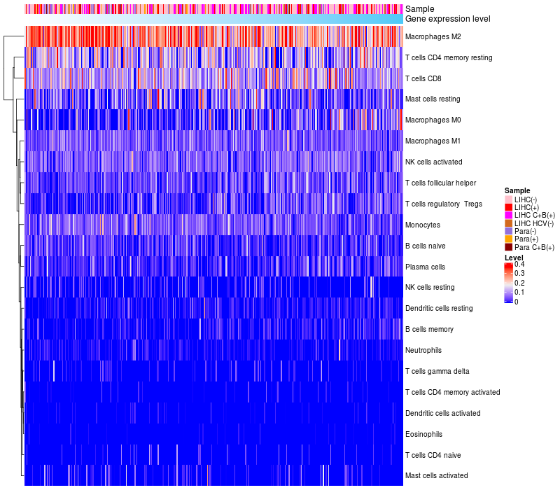 Liver hepatocellular carcinoma HCV (HBV+)(86), Liver hepatocellular carcinoma HCV (HBV-)(19), Liver hepatocellular carcinoma (HBV+)(209), Liver hepatocellular carcinoma (HBV+)(60), Paracancerous HCV (HBV+)(4), Paracancerous (HBV-)(28), Paracancerous (HBV+)(18) |