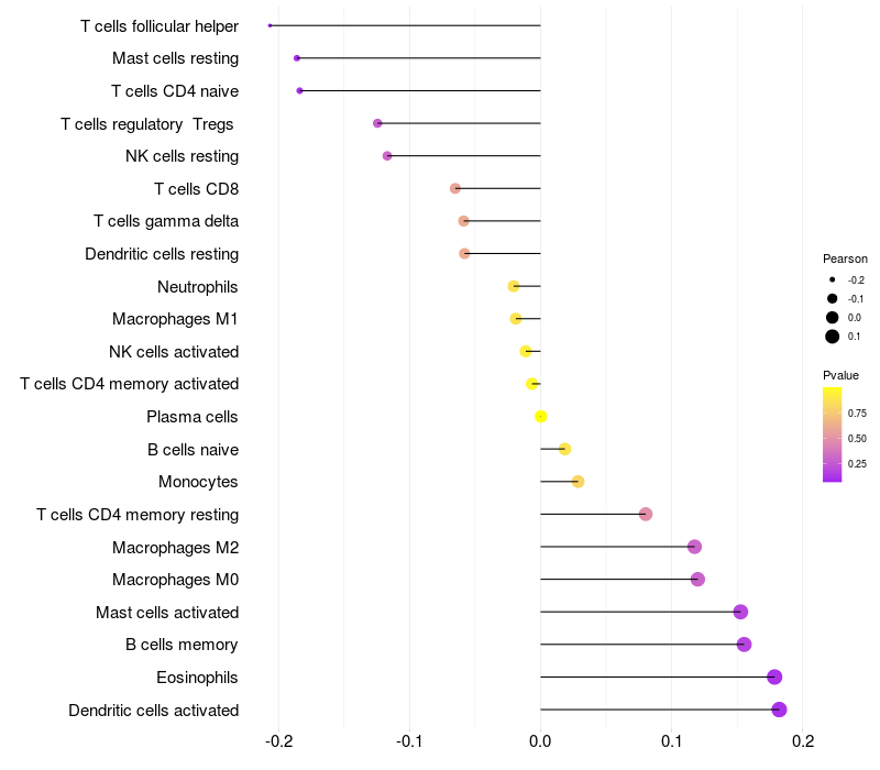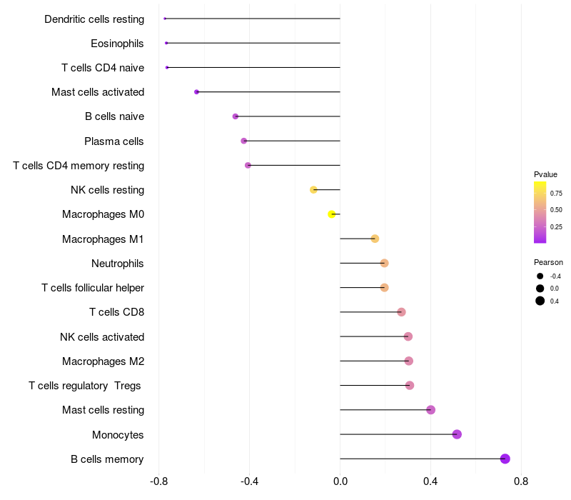 Lollipop of KLF7 expression and immune infiltrating cell level correlation result in HBV+ Liver cirrhosis samples