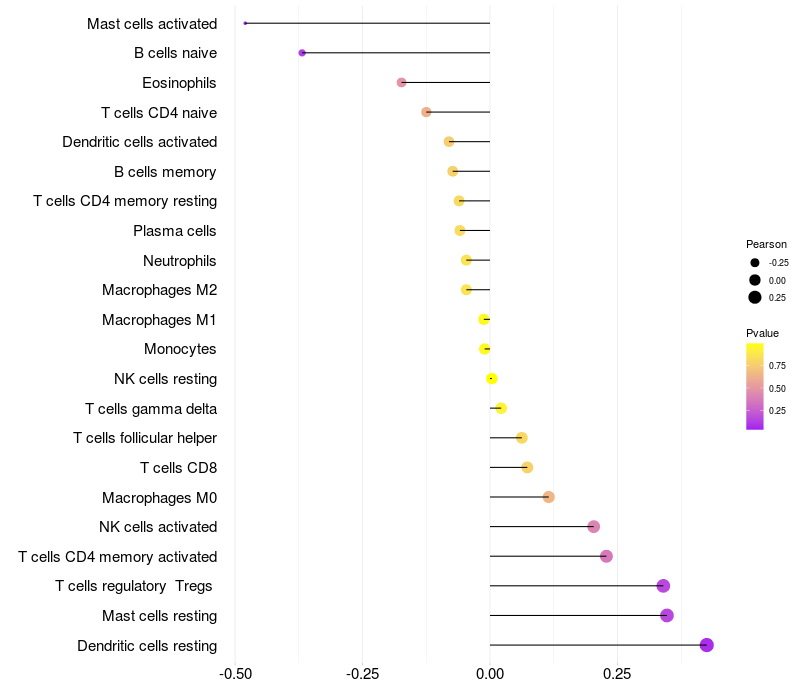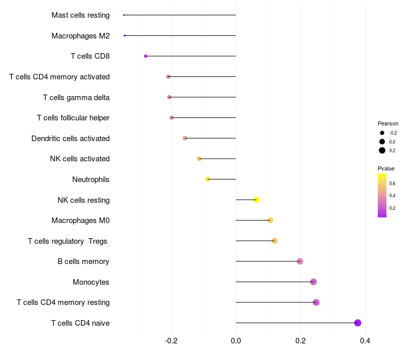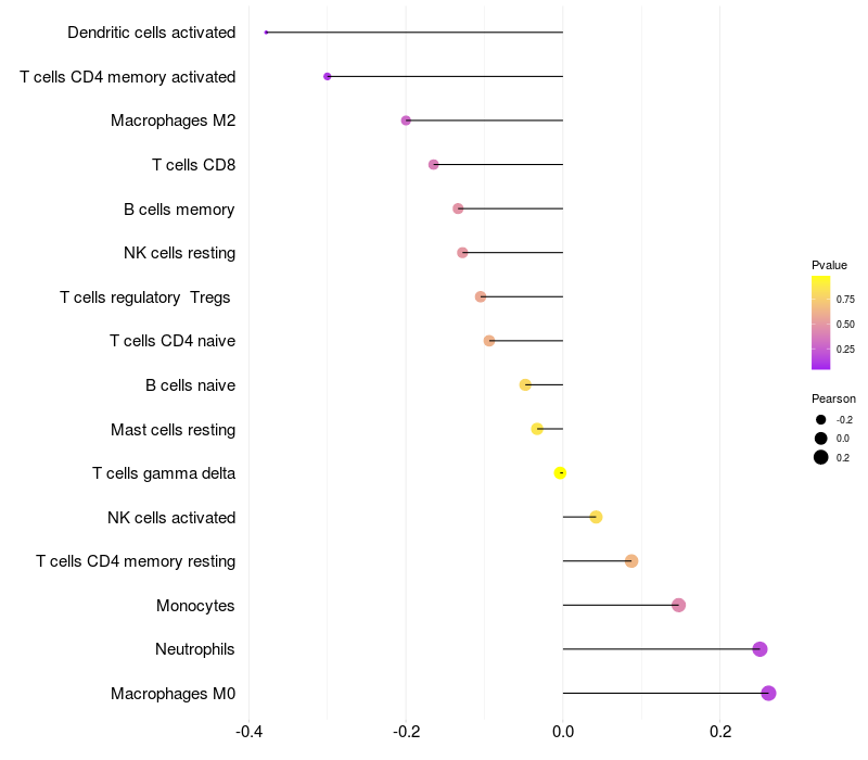 Lollipop of KNDC1 expression and immune infiltrating cell level correlation result in HTLV1+ samples