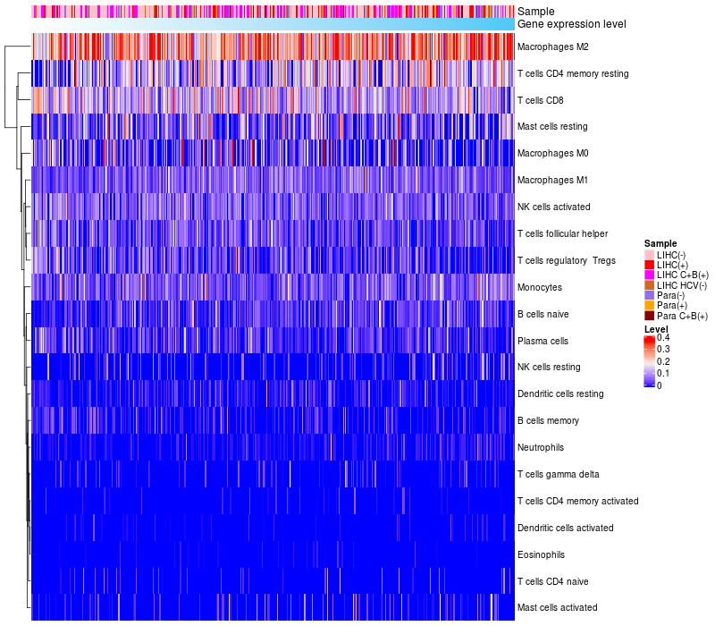 Liver hepatocellular carcinoma HCV (HBV+)(86), Liver hepatocellular carcinoma HCV (HBV-)(19), Liver hepatocellular carcinoma (HBV+)(209), Liver hepatocellular carcinoma (HBV+)(60), Paracancerous HCV (HBV+)(4), Paracancerous (HBV-)(28), Paracancerous (HBV+)(18) |