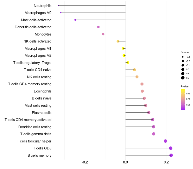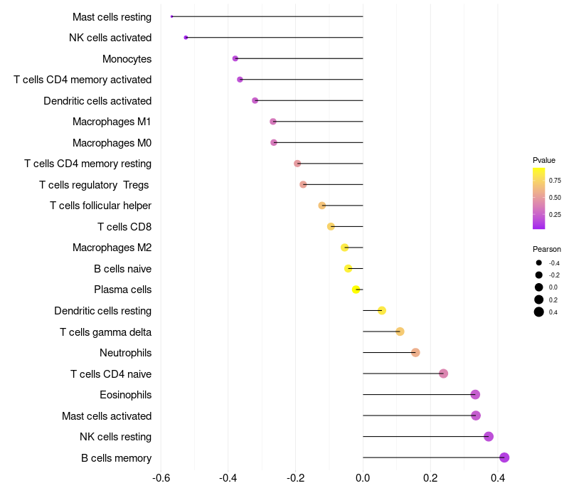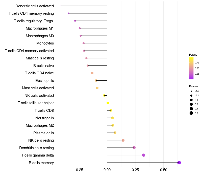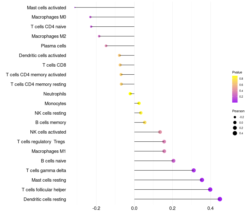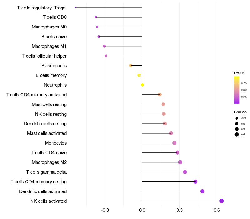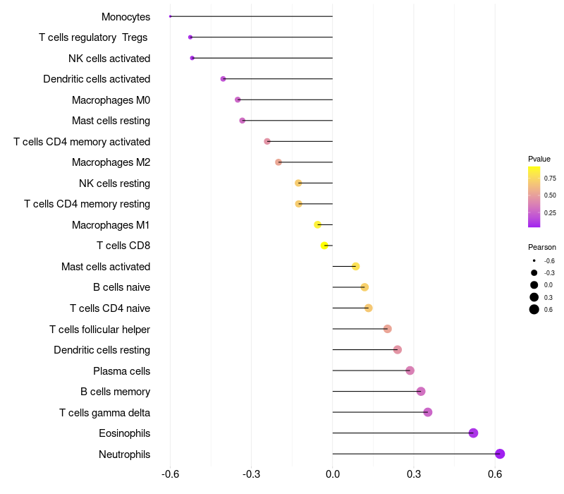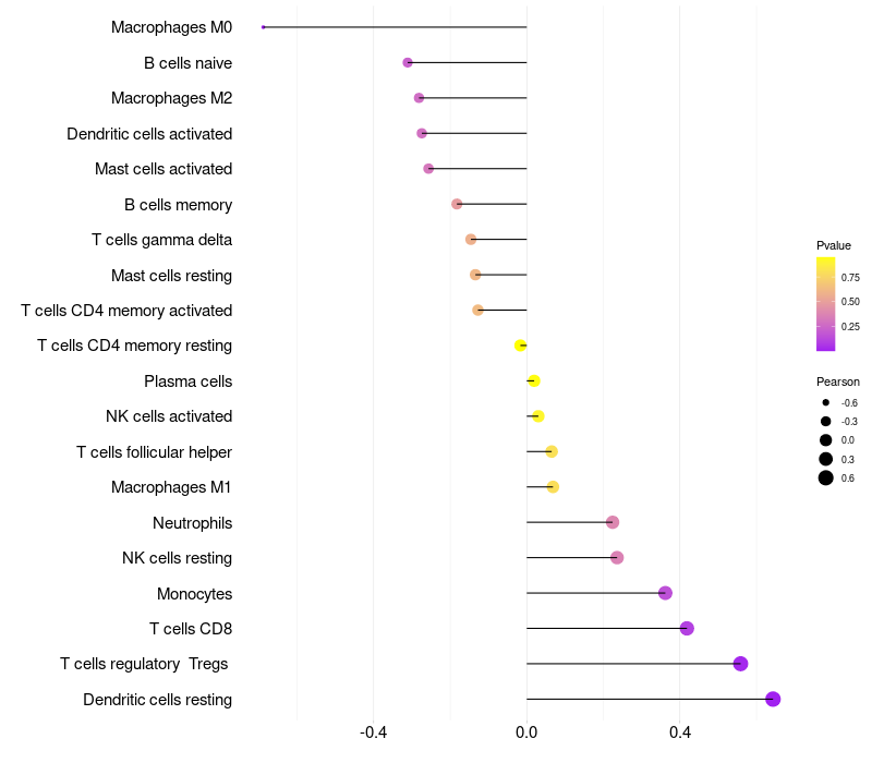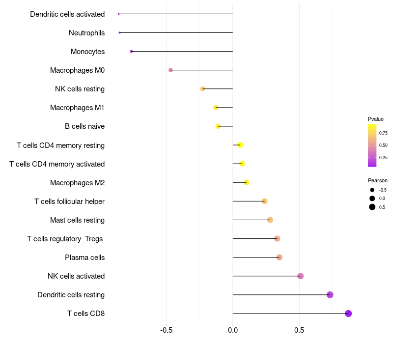 Lollipop of KRCC1 expression and immune infiltrating cell level correlation result in HPV+ samples