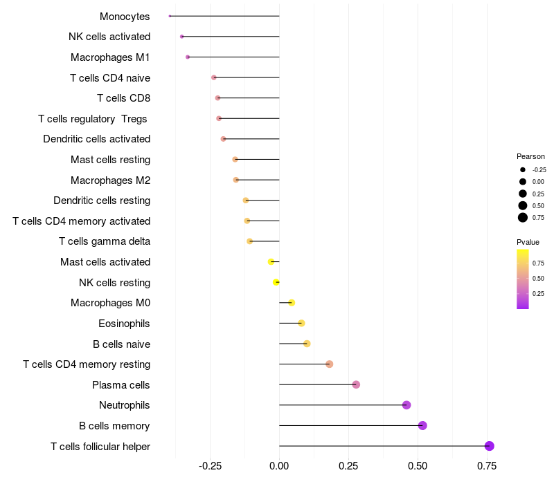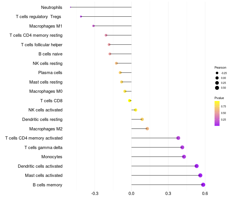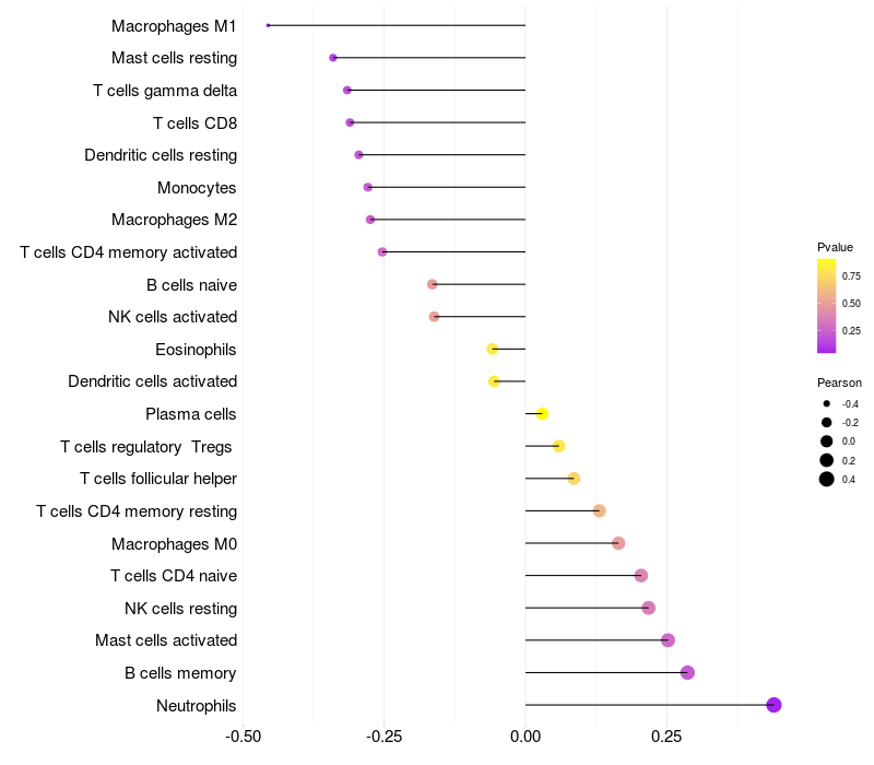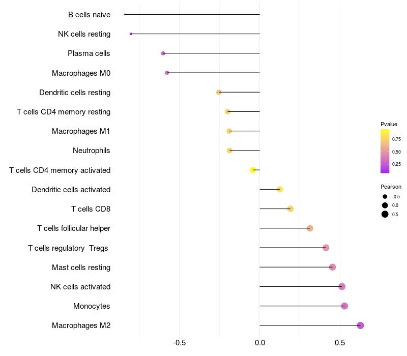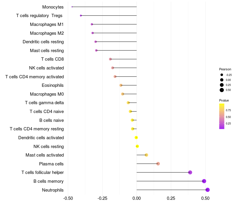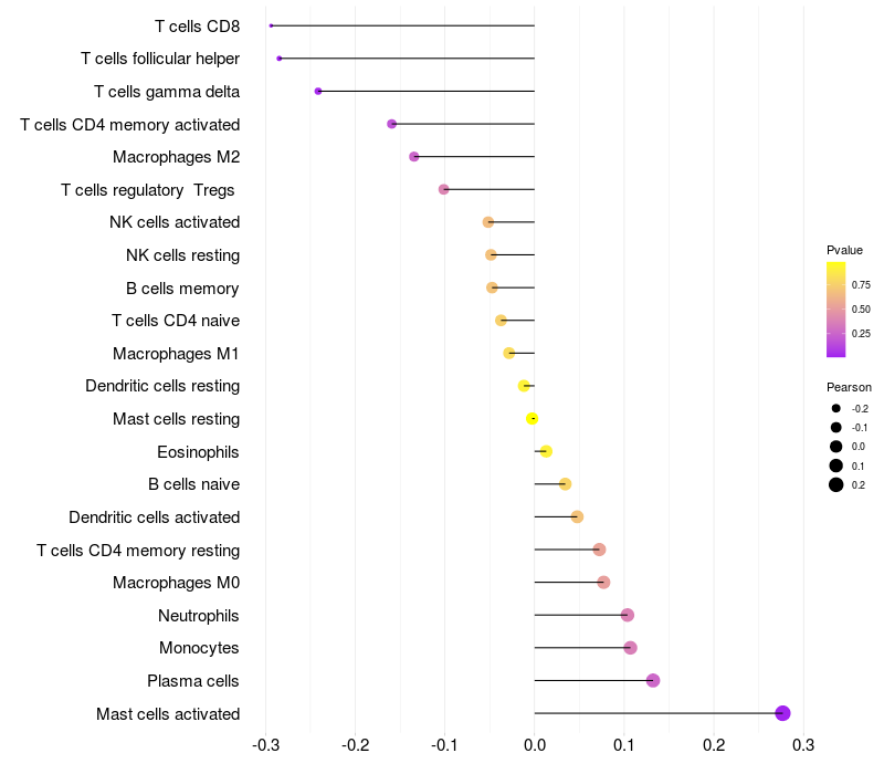 Lollipop of L1CAM expression and immune infiltrating cell level correlation result in HPV+ samples