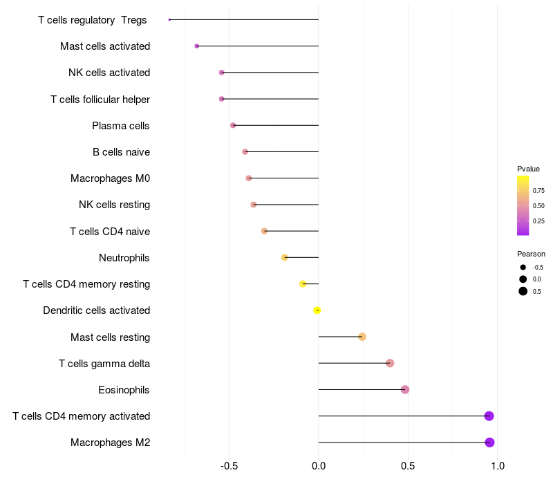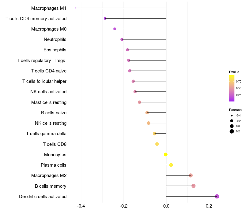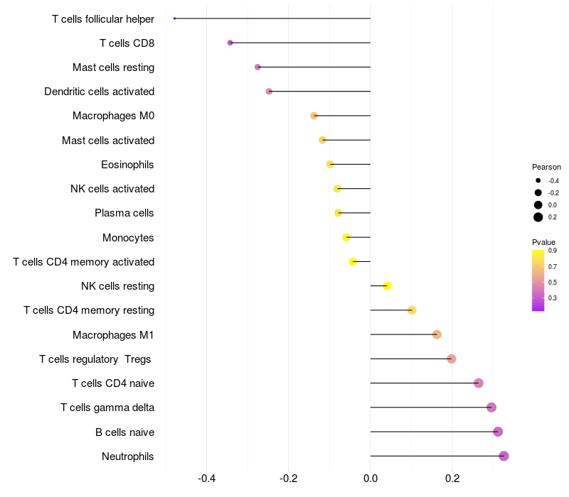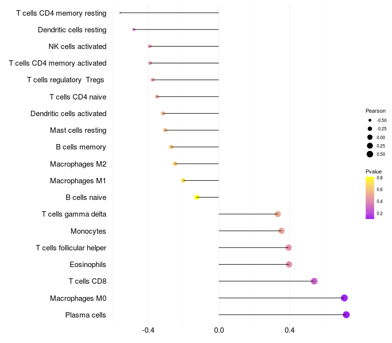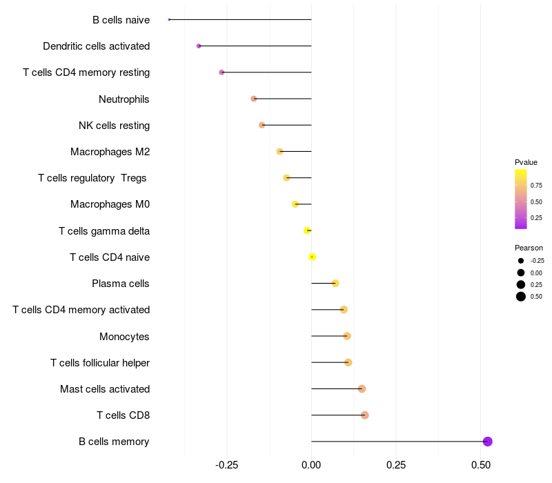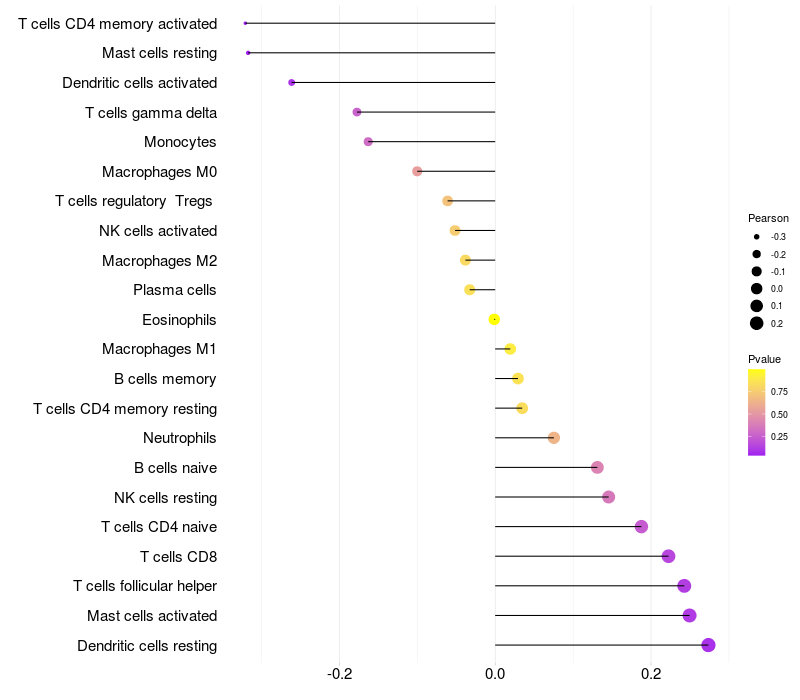 Lollipop of LDB3 expression and immune infiltrating cell level correlation result in EBV+ samples