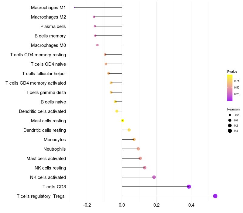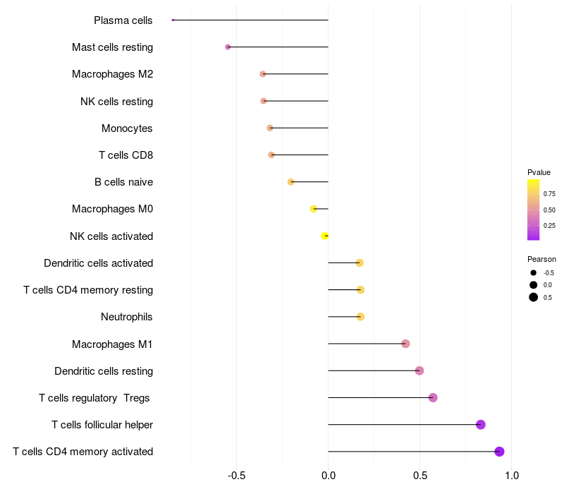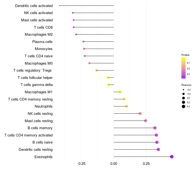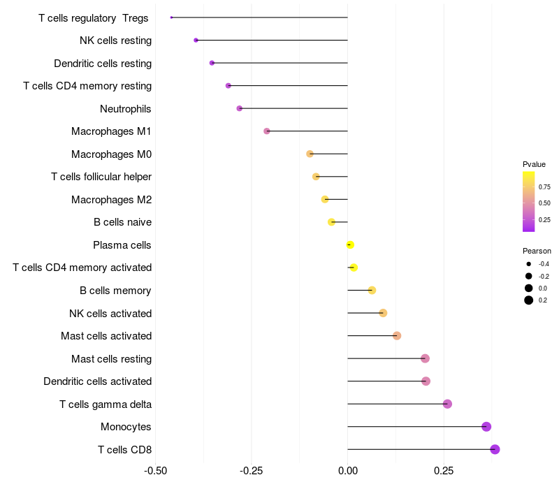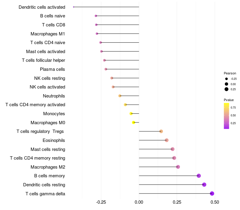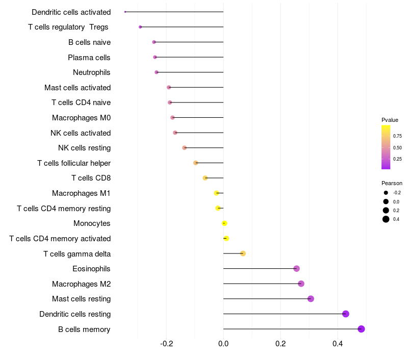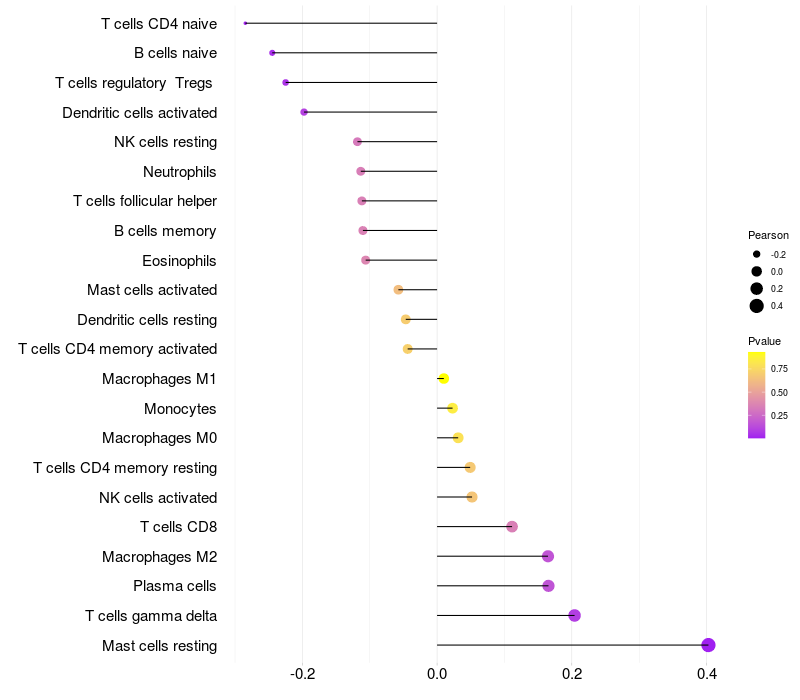 Lollipop of LEFTY2 expression and immune infiltrating cell level correlation result in HPV+ samples