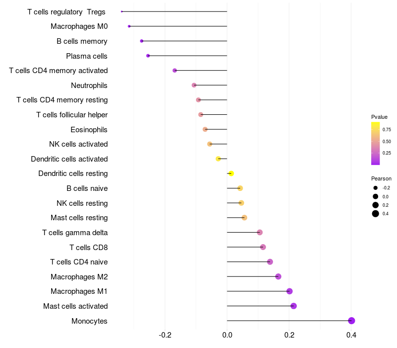 Lollipop of LEPR expression and immune infiltrating cell level correlation result in HBV+ samples