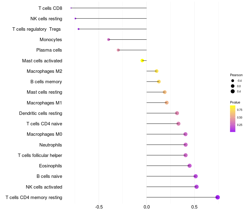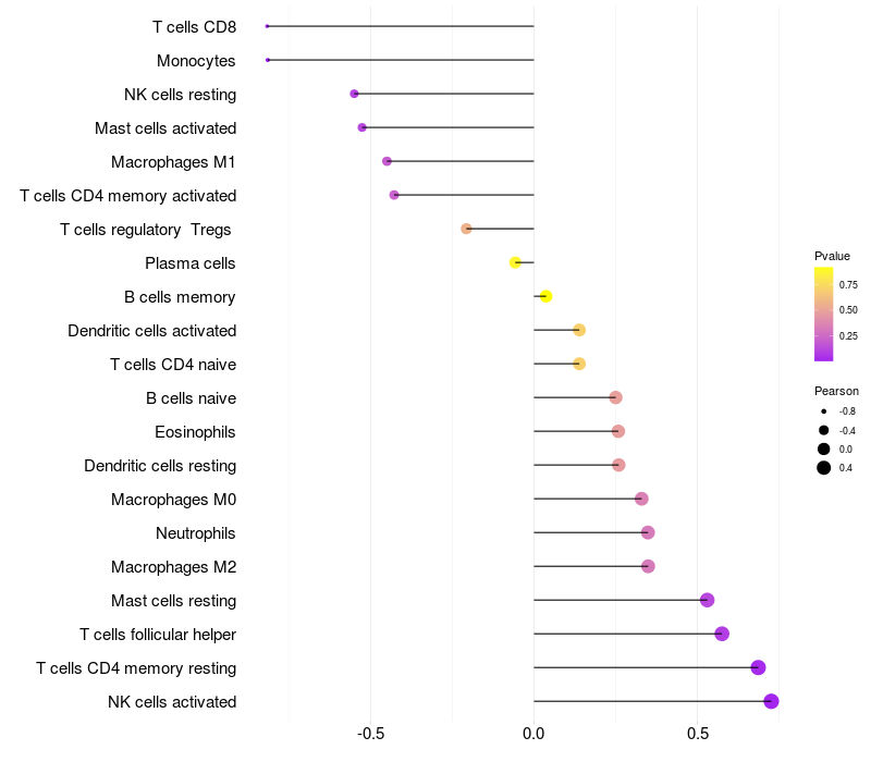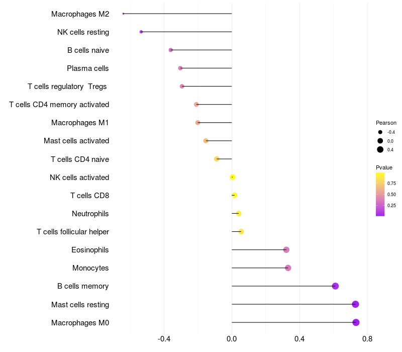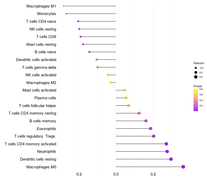 Lollipop of LHFPL2 expression and immune infiltrating cell level correlation result in HBV+ Liver cirrhosis samples