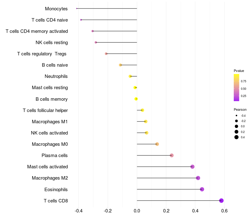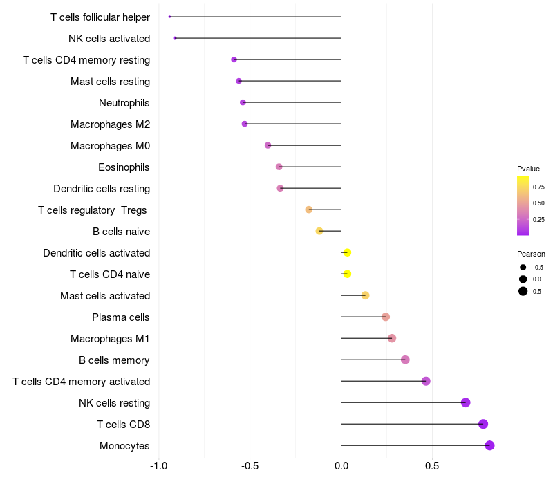 Lollipop of LHPP expression and immune infiltrating cell level correlation result in HBV+ Chronic HBV (CHB) infection samples