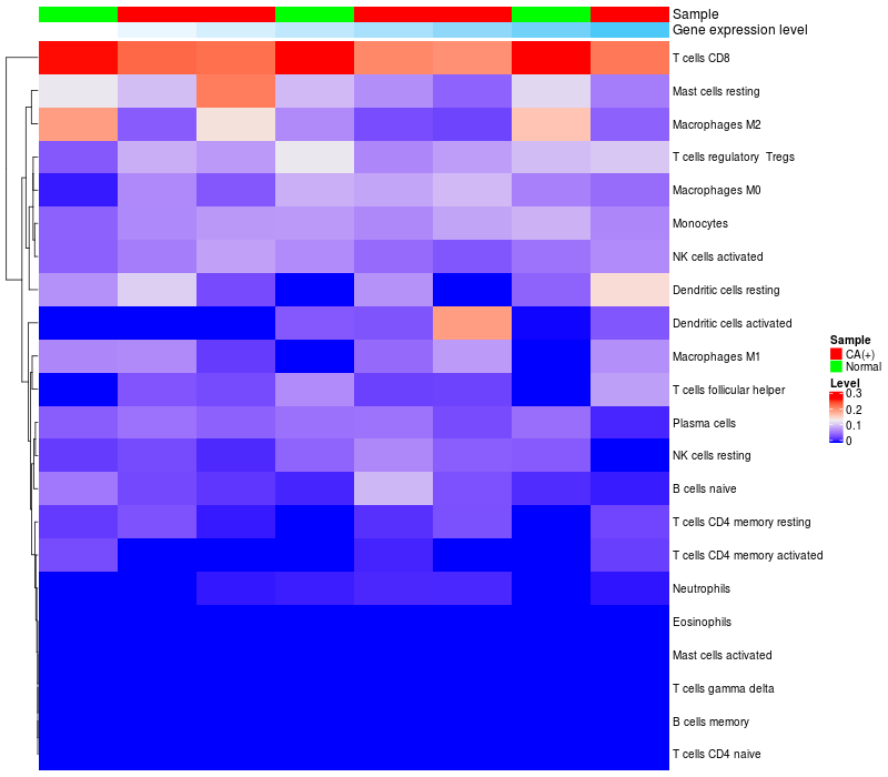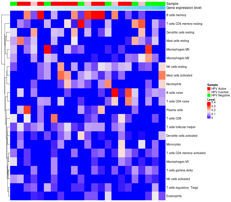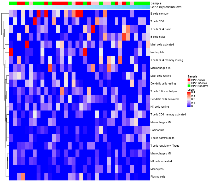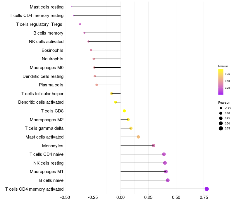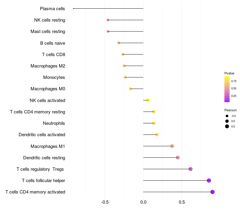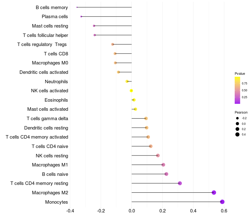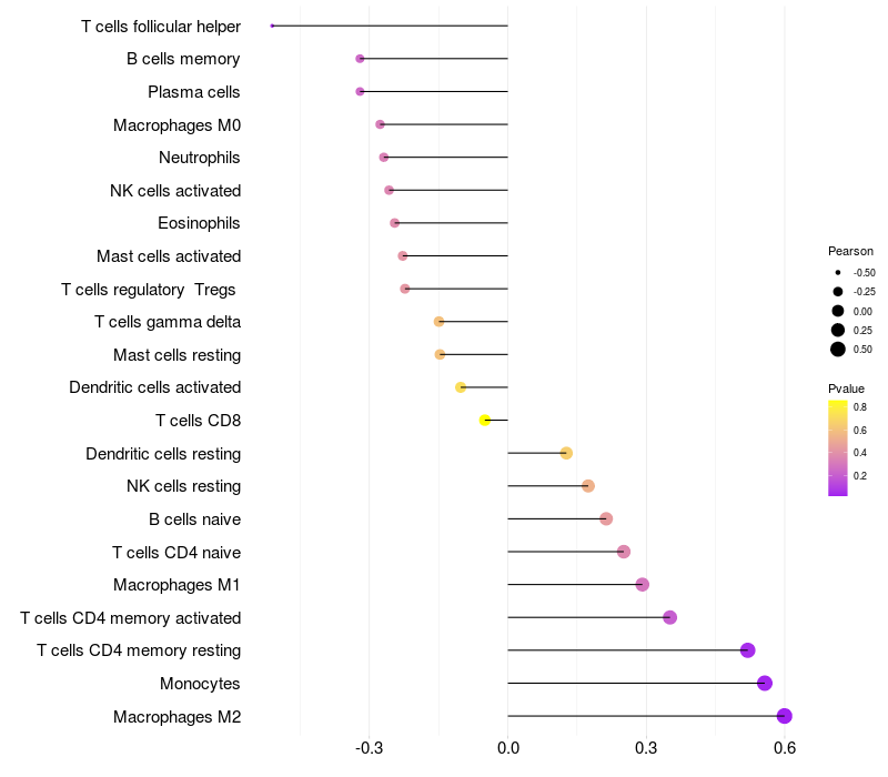 Lollipop of LINC00111 expression and immune infiltrating cell level correlation result in HPV+ samples