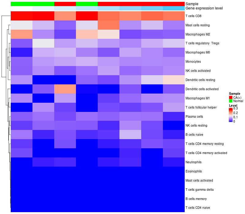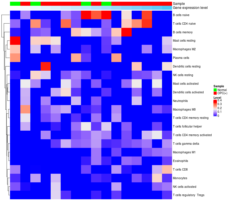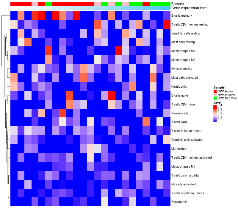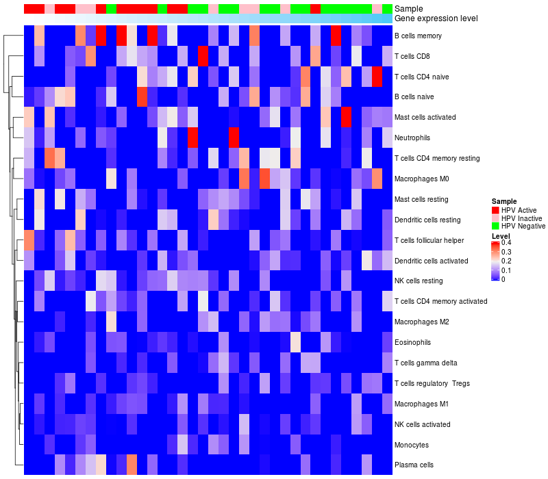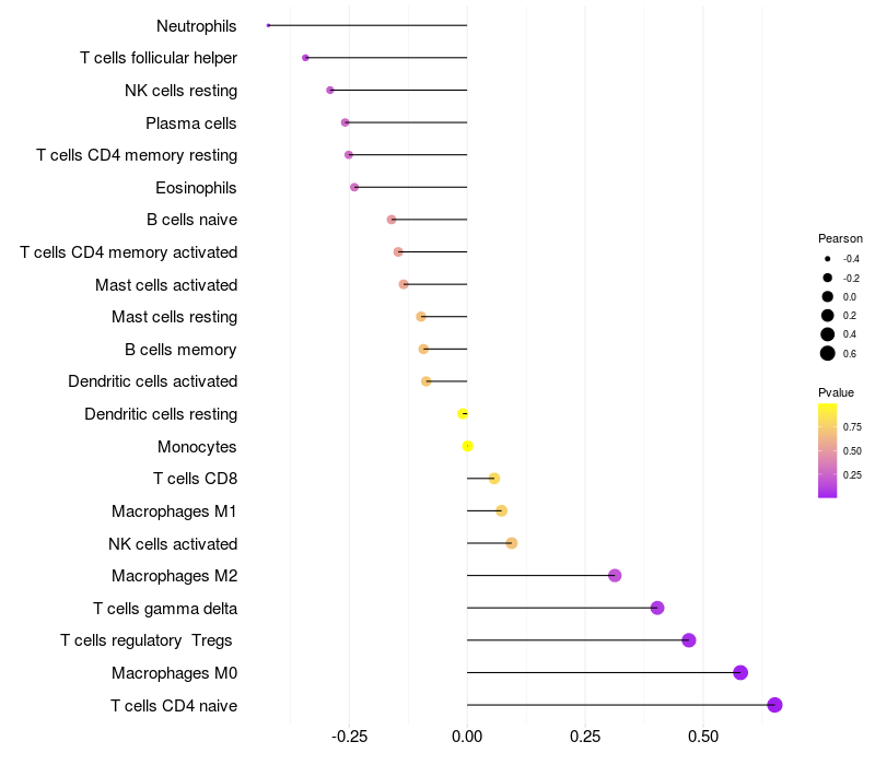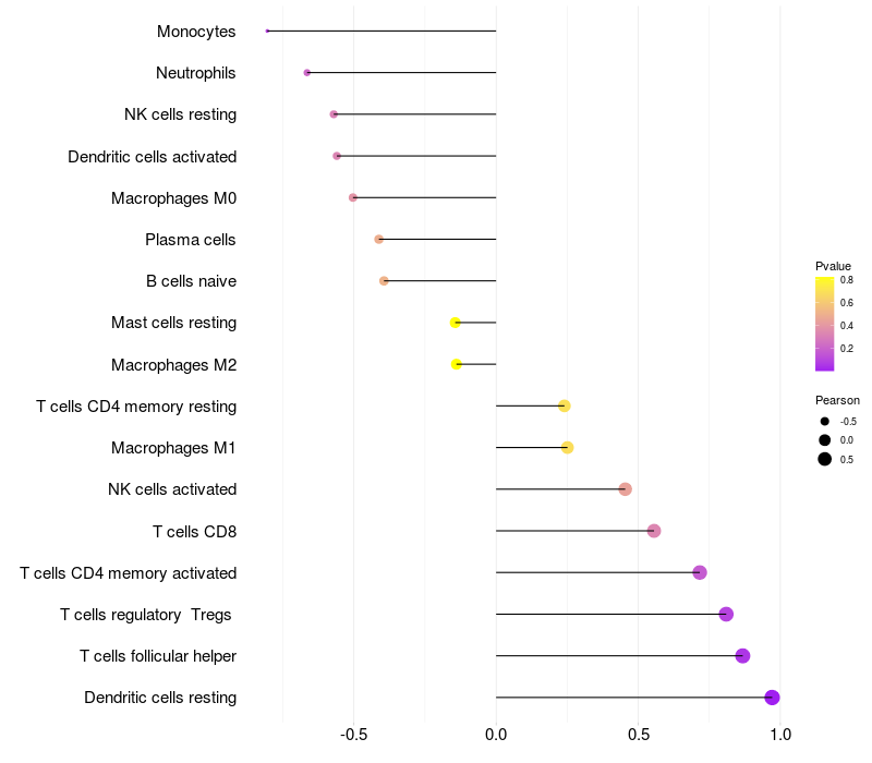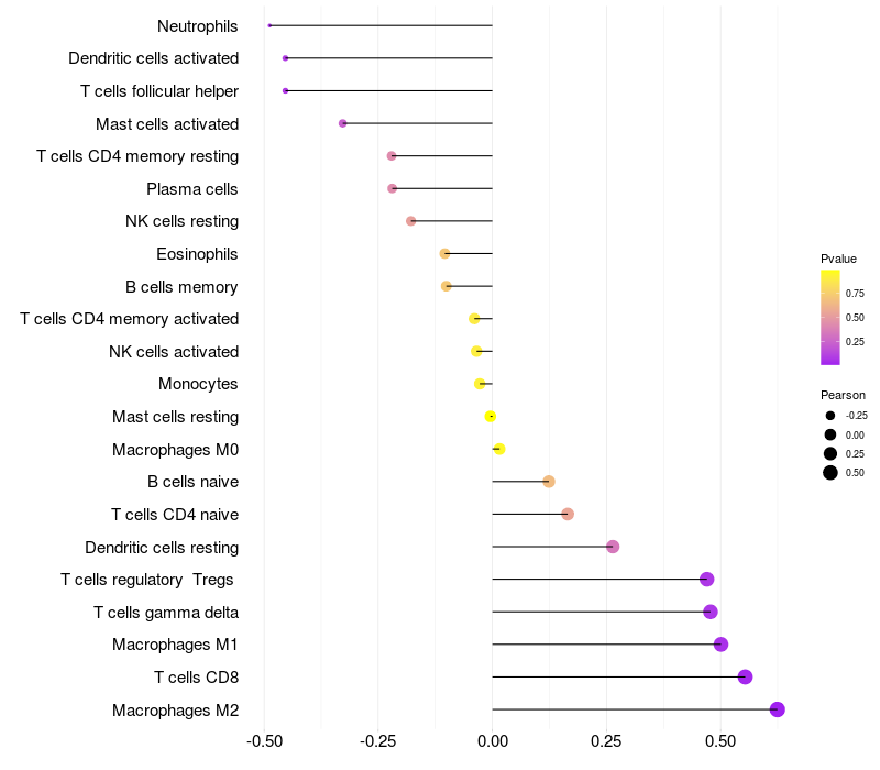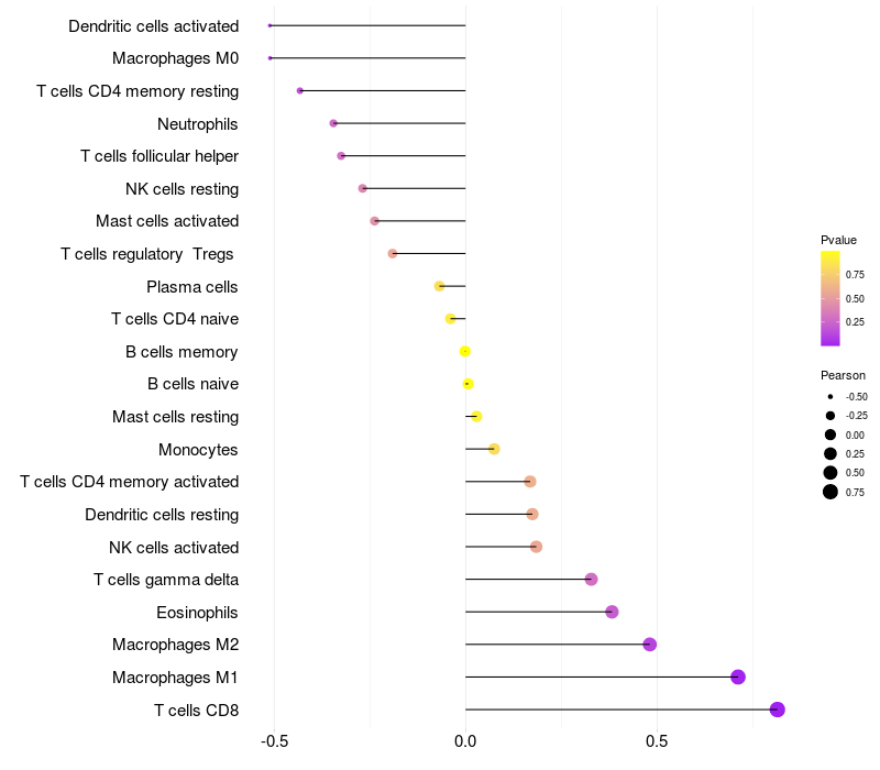 Lollipop of LINC00222 expression and immune infiltrating cell level correlation result in HPV+ samples