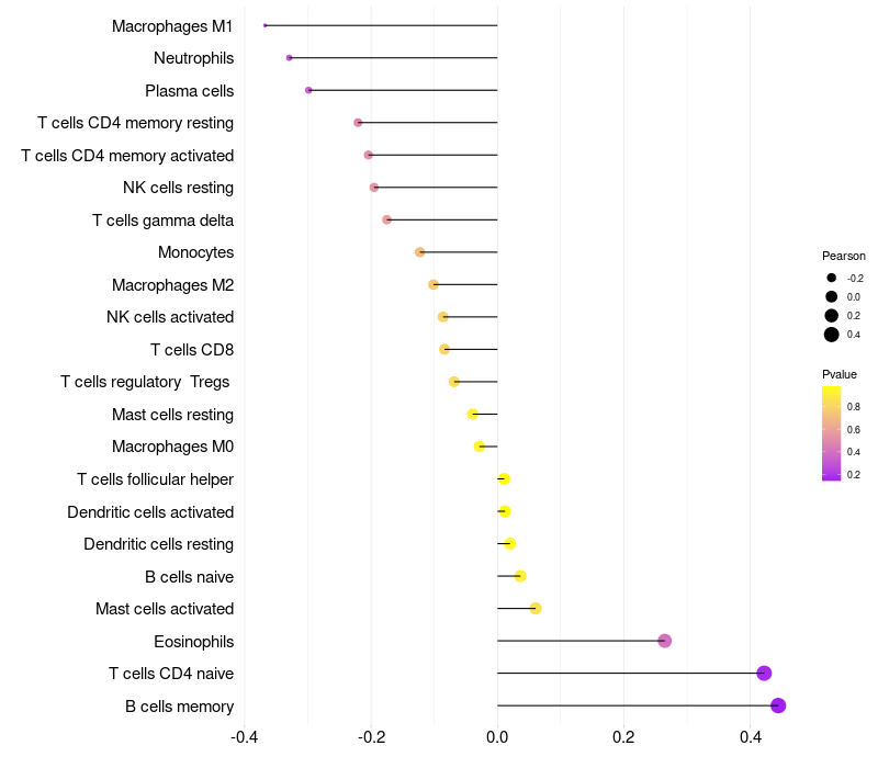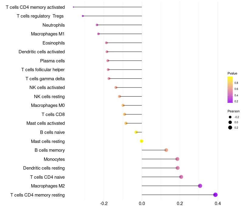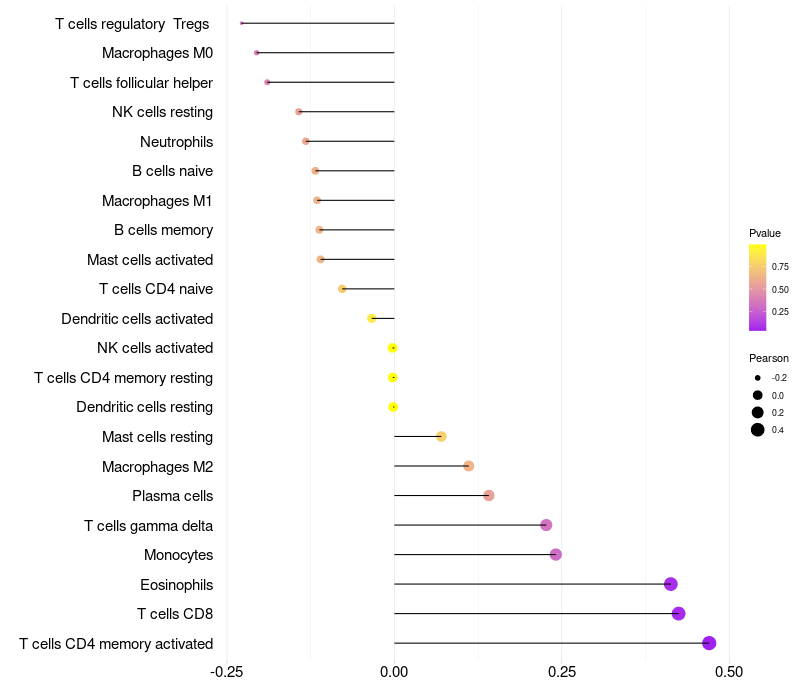 Lollipop of LINC00347 expression and immune infiltrating cell level correlation result in HPV+ samples