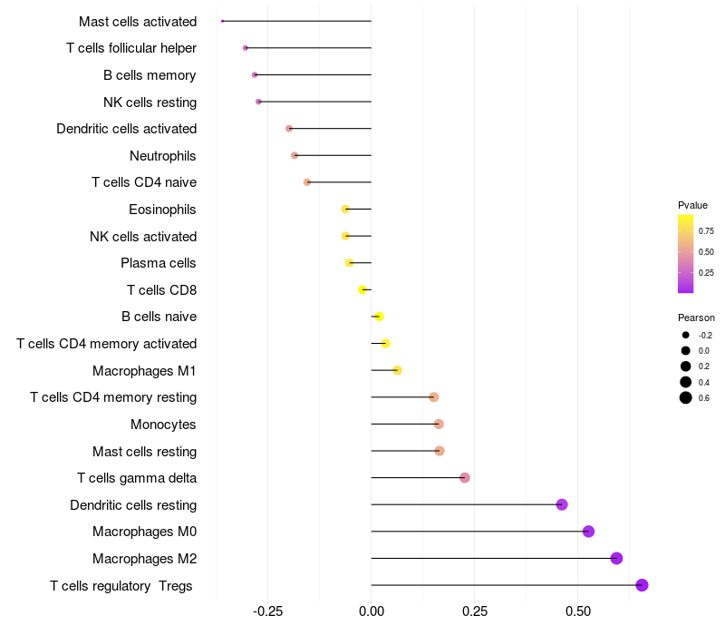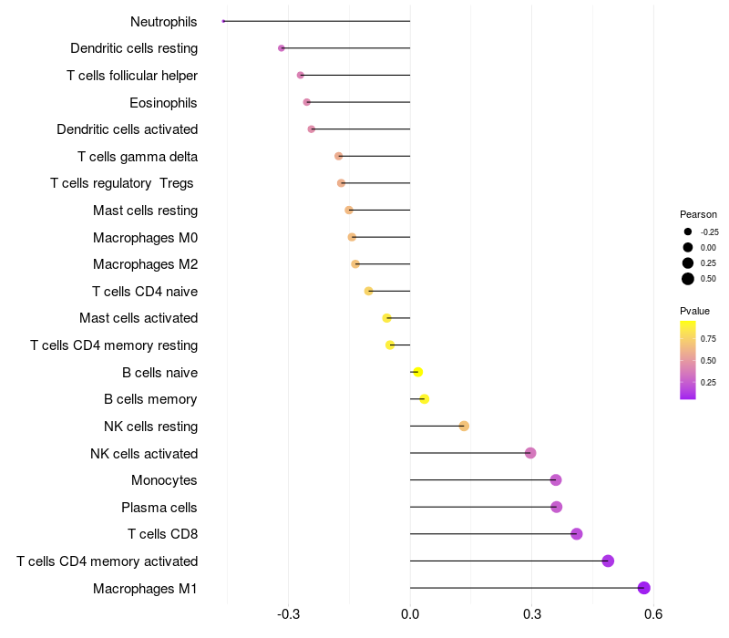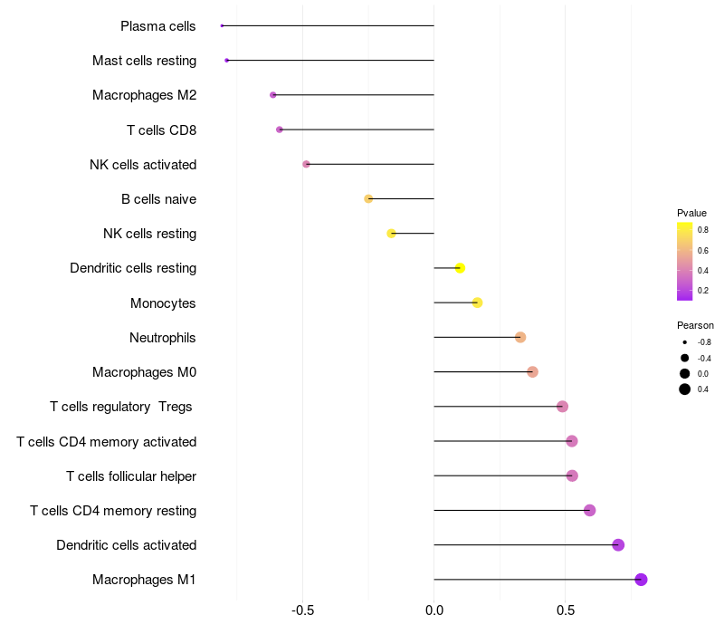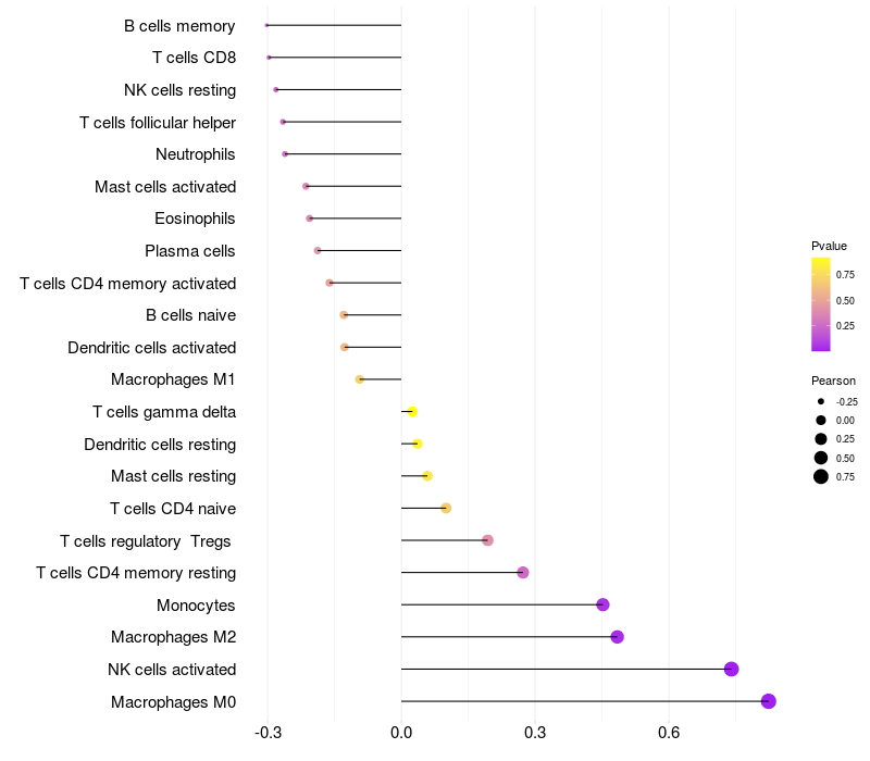 Lollipop of LINC00470 expression and immune infiltrating cell level correlation result in HPV+ samples