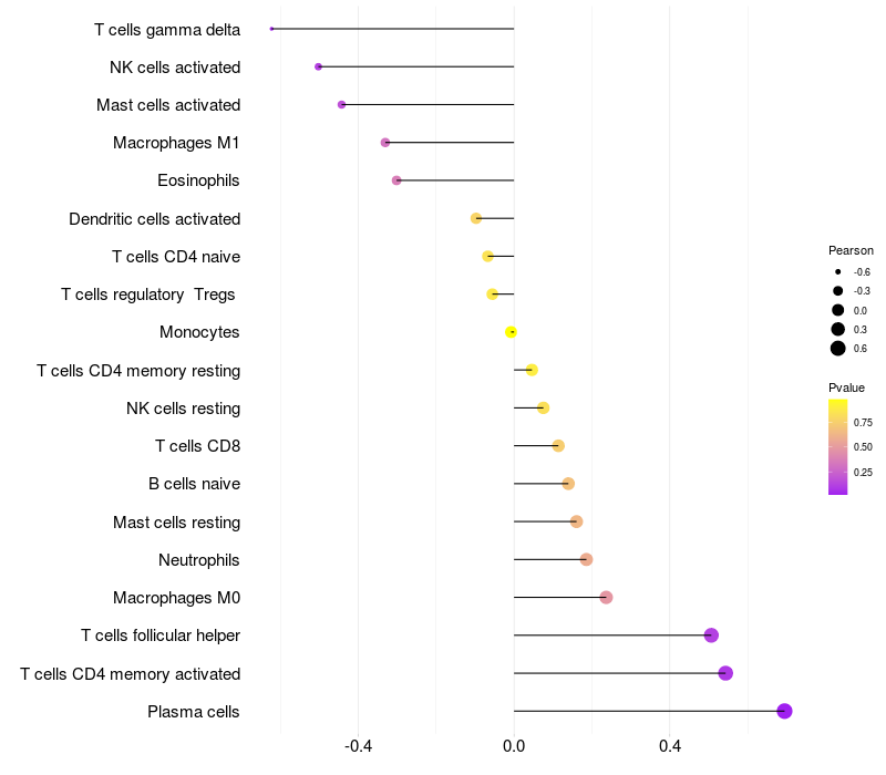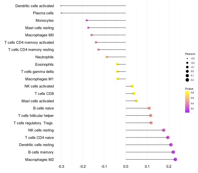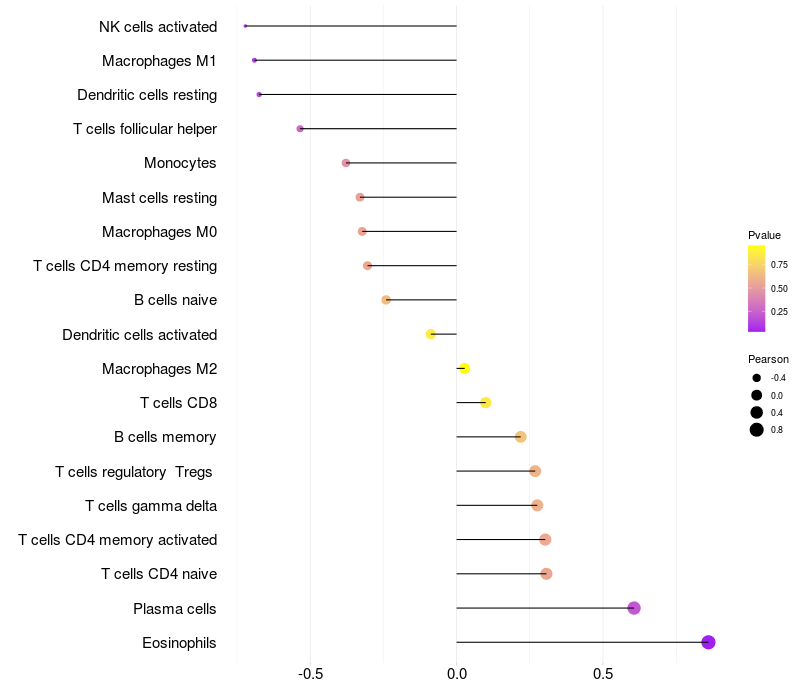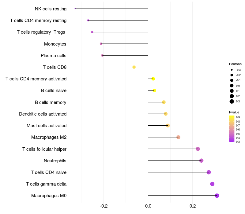 Lollipop of LINC00486 expression and immune infiltrating cell level correlation result in EBV+ samples