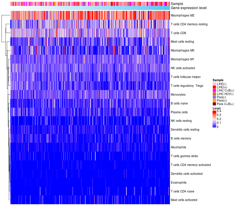 Liver hepatocellular carcinoma HCV (HBV+)(86), Liver hepatocellular carcinoma HCV (HBV-)(19), Liver hepatocellular carcinoma (HBV+)(209), Liver hepatocellular carcinoma (HBV+)(60), Paracancerous HCV (HBV+)(4), Paracancerous (HBV-)(28), Paracancerous (HBV+)(18) |