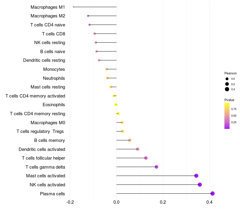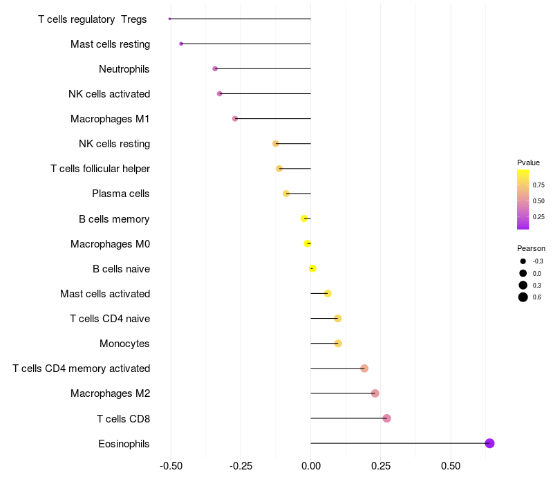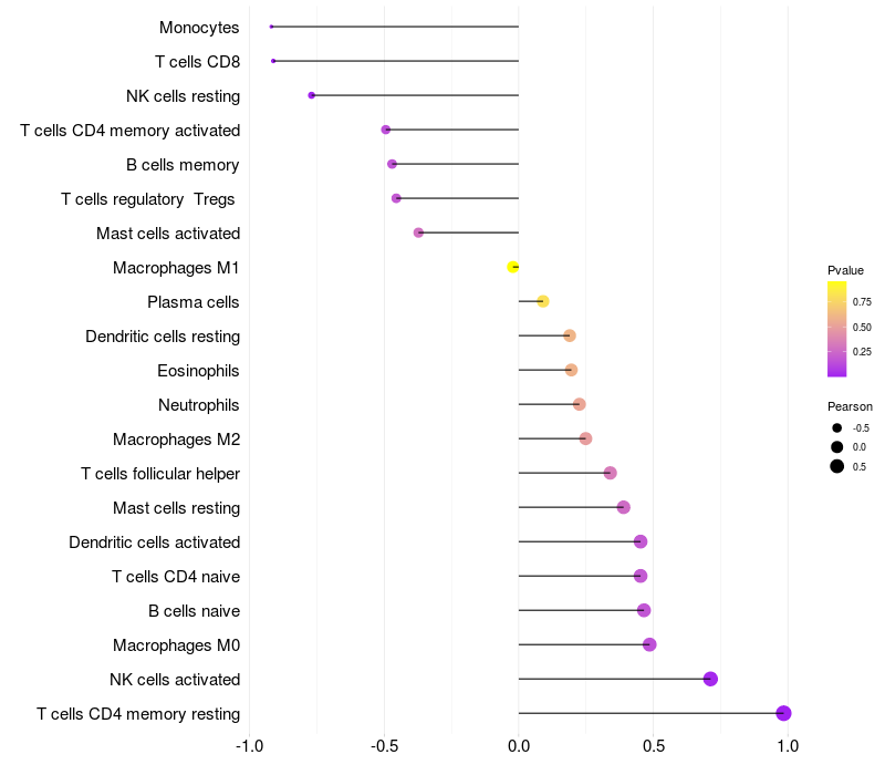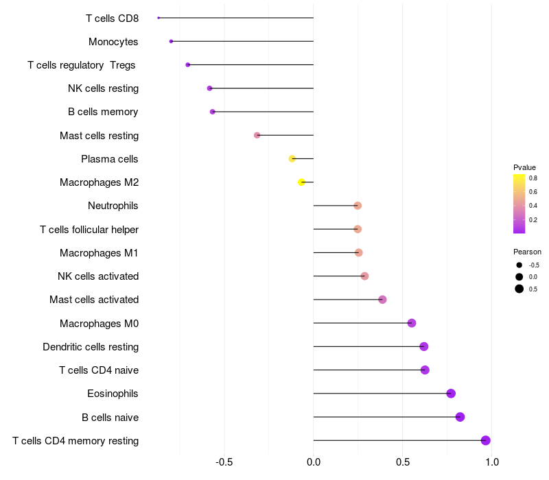 Lollipop of LMCD1 expression and immune infiltrating cell level correlation result in HBV+ Liver cirrhosis samples
