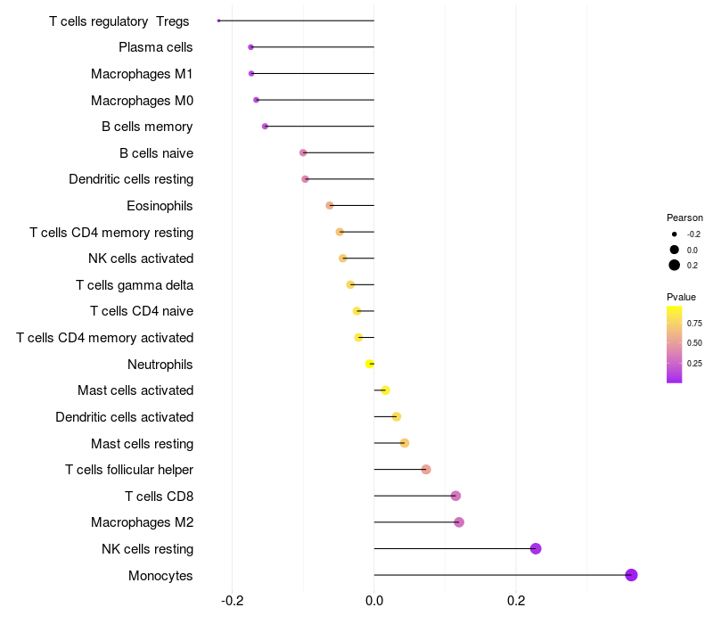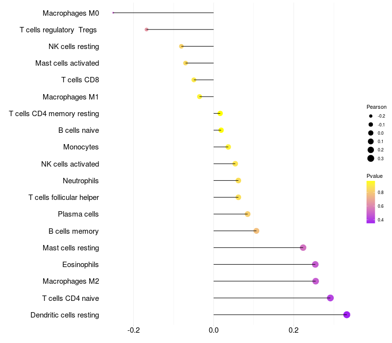 Lollipop of LMLN expression and immune infiltrating cell level correlation result in HBV+ Liver cirrhosis samples