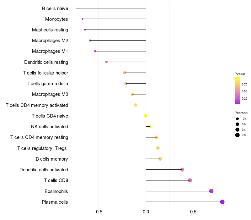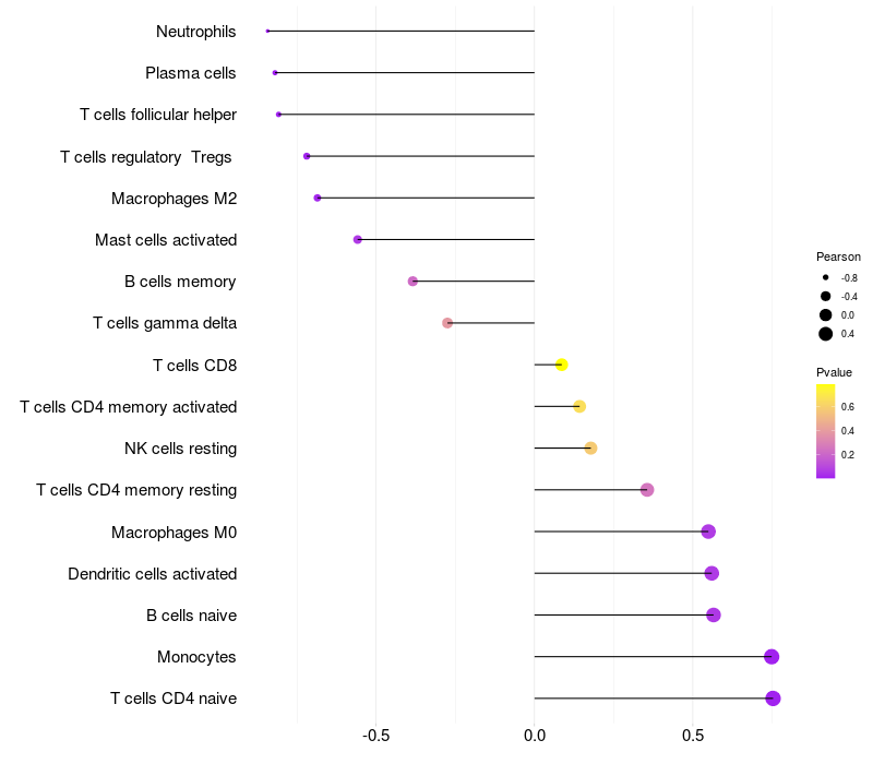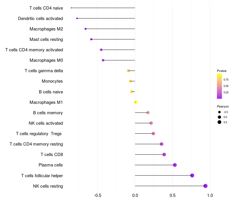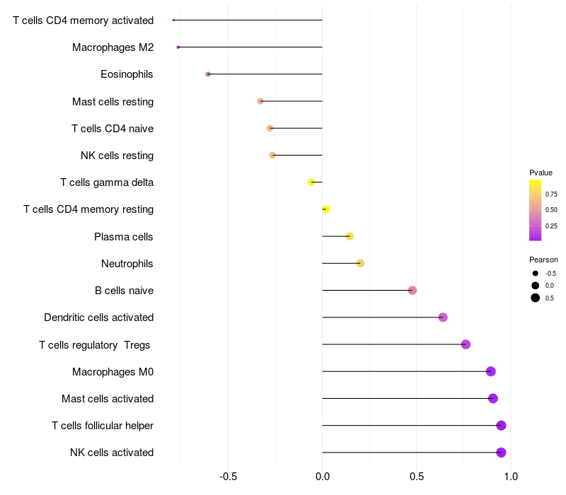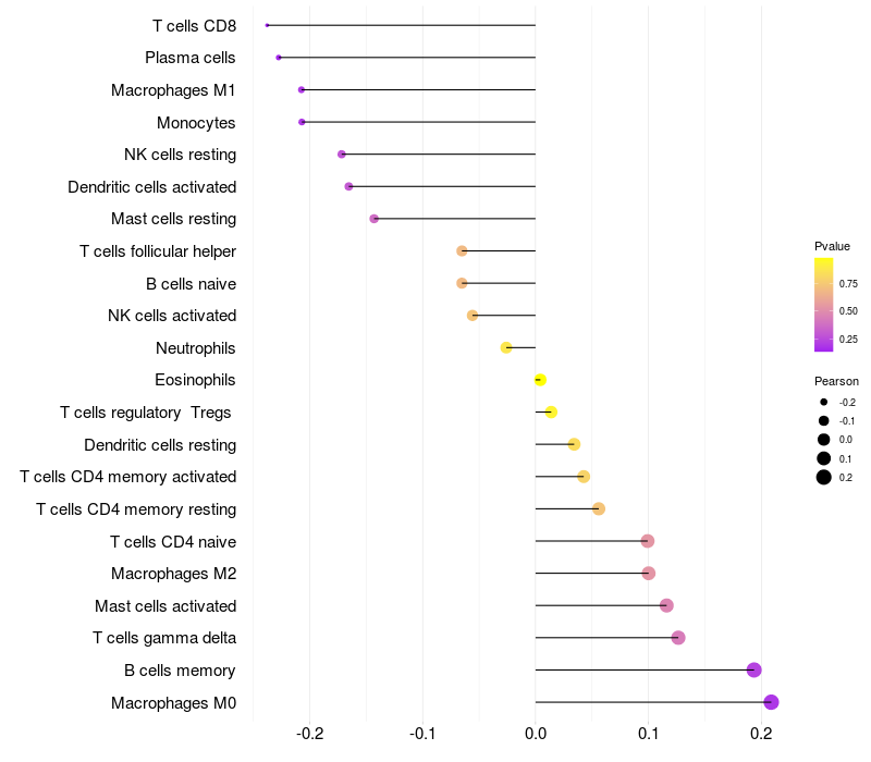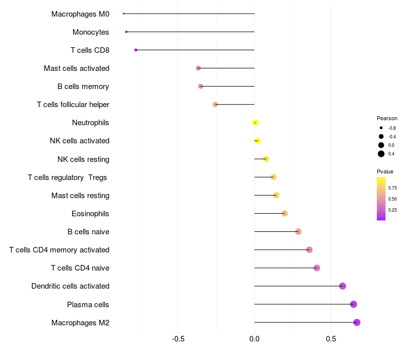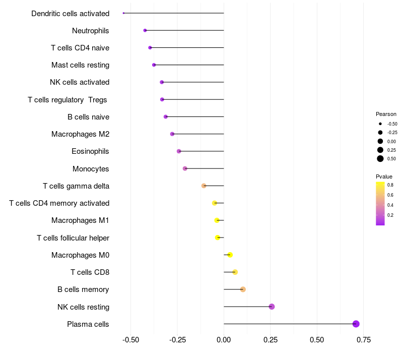 Lollipop of LMO4 expression and immune infiltrating cell level correlation result in EBV+ samples