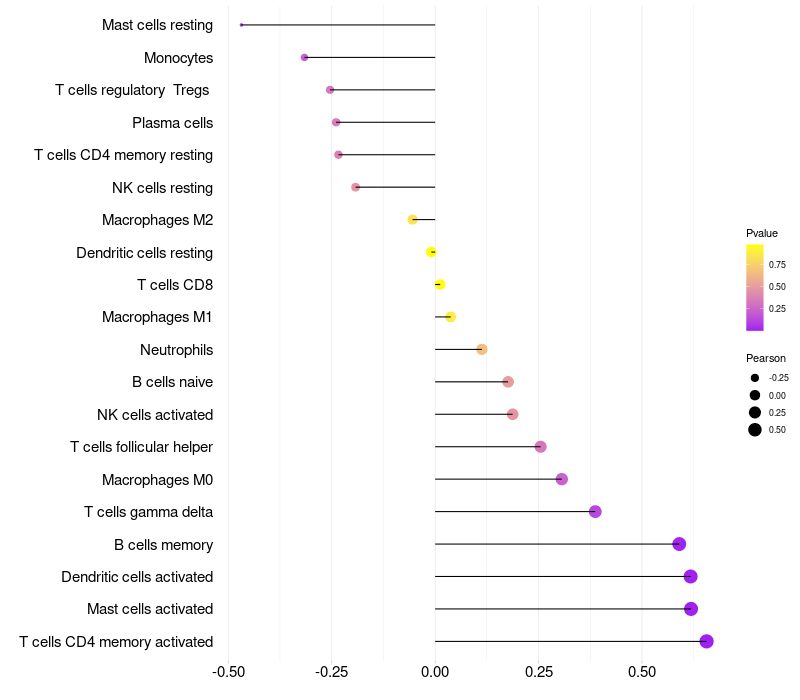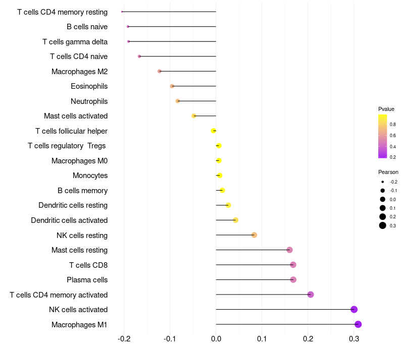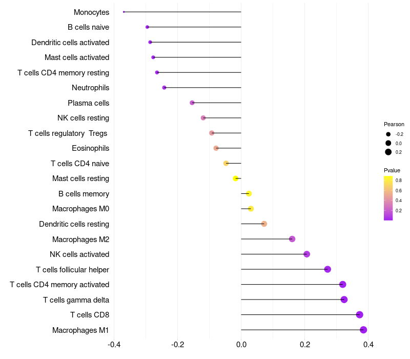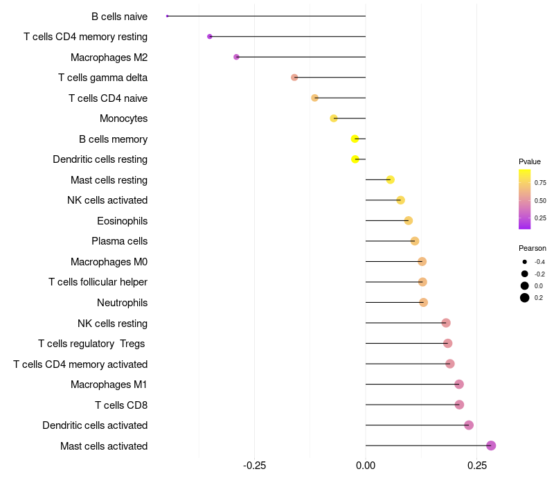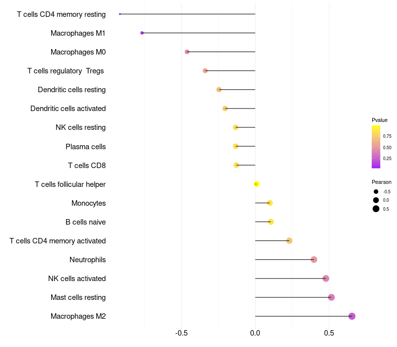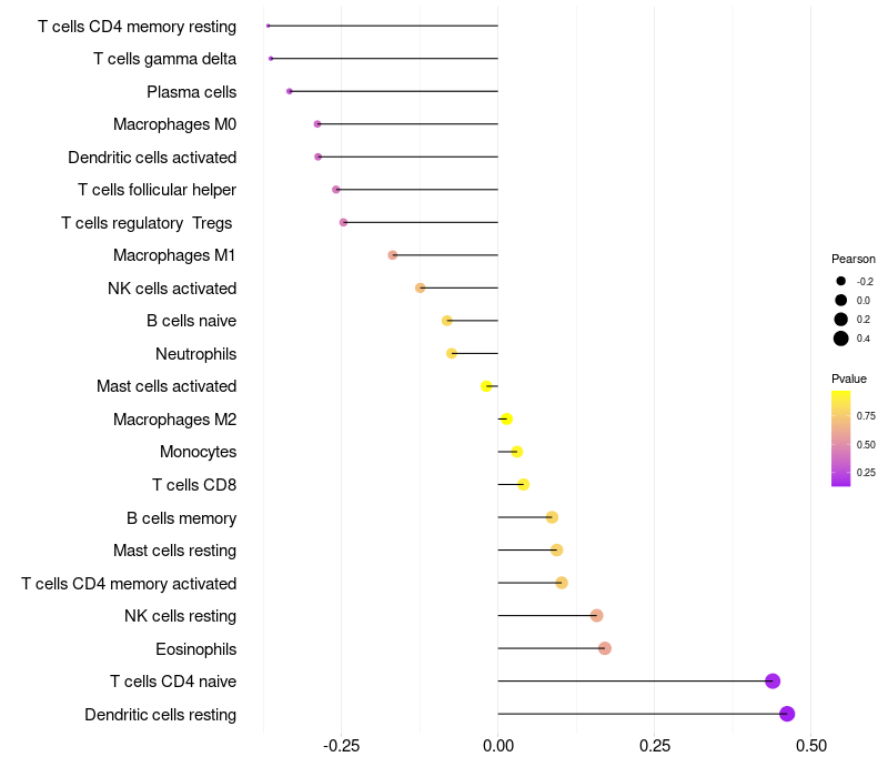 Lollipop of LOC100129148 expression and immune infiltrating cell level correlation result in HPV+ samples