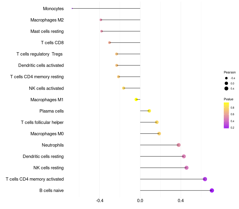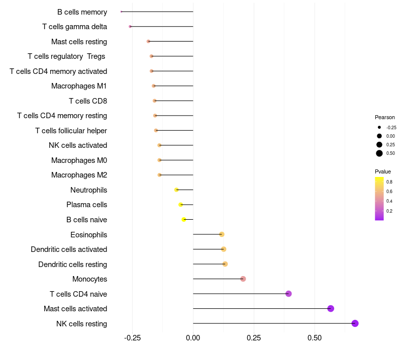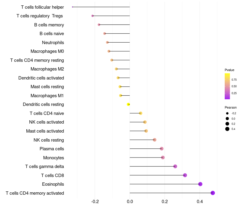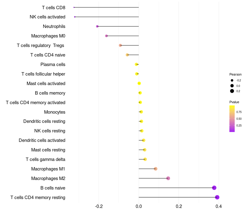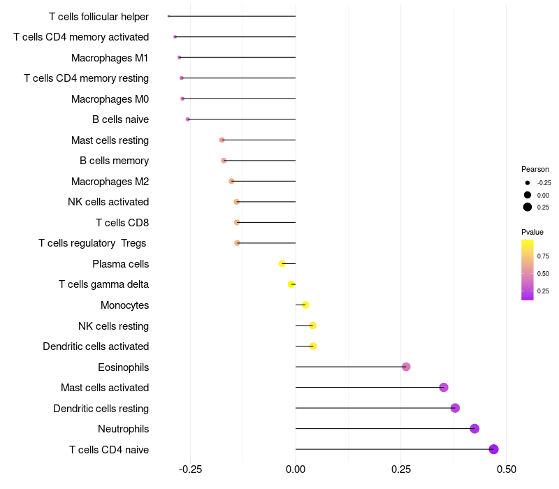Lollipop of LOC100130331 expression and immune infiltrating cell level correlation result in HPV+ samples