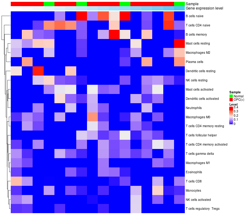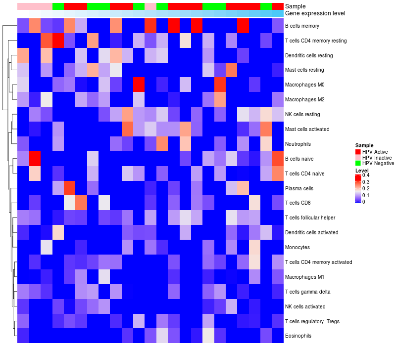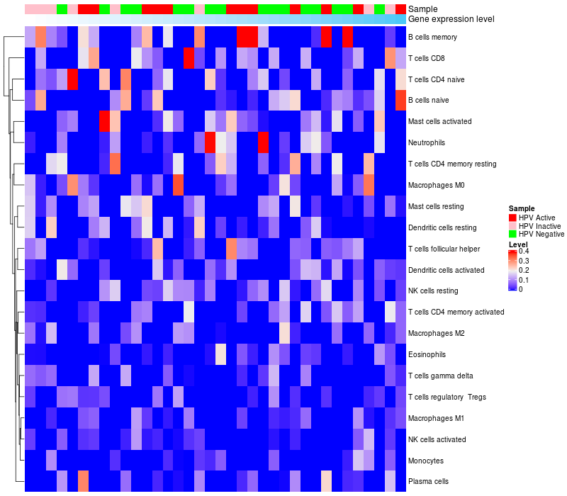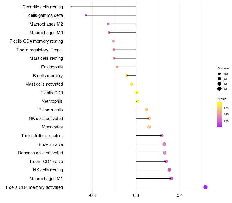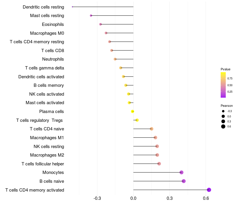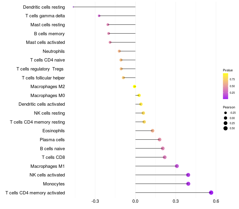Lollipop of LOC100506858 expression and immune infiltrating cell level correlation result in HPV+ samples