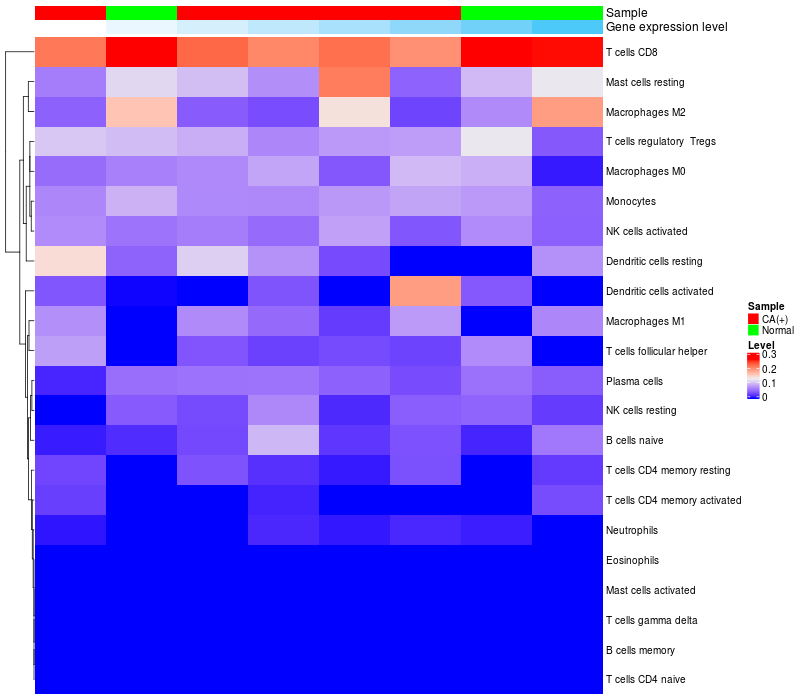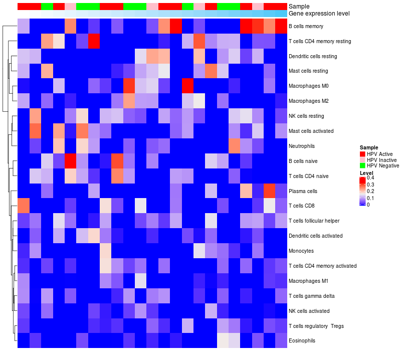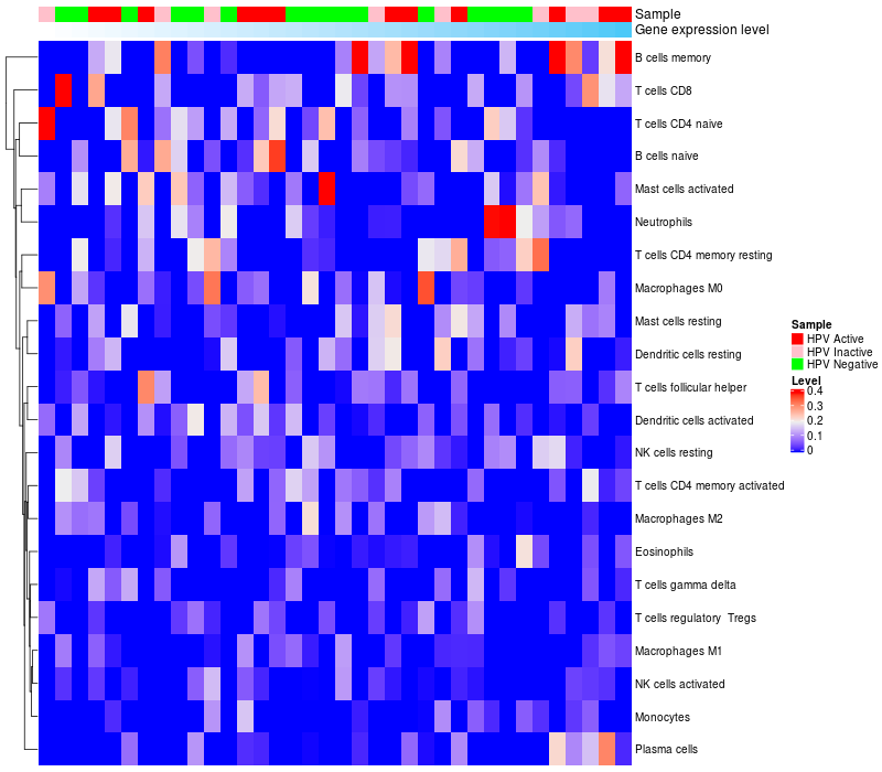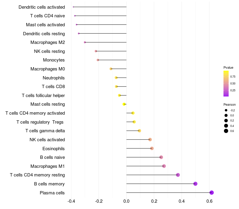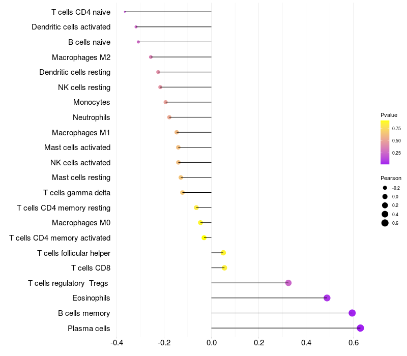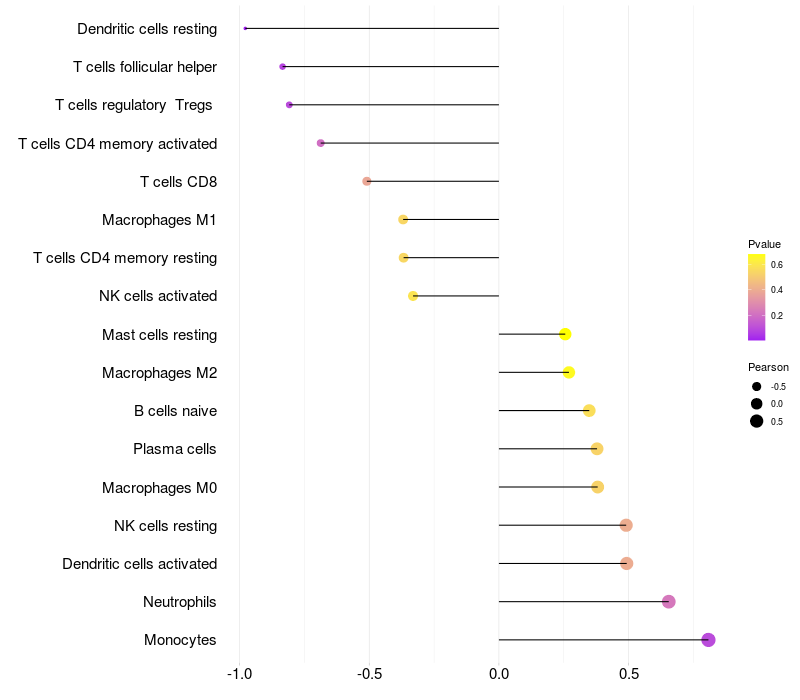 Lollipop of LOC100506869 expression and immune infiltrating cell level correlation result in HPV+ samples