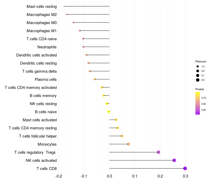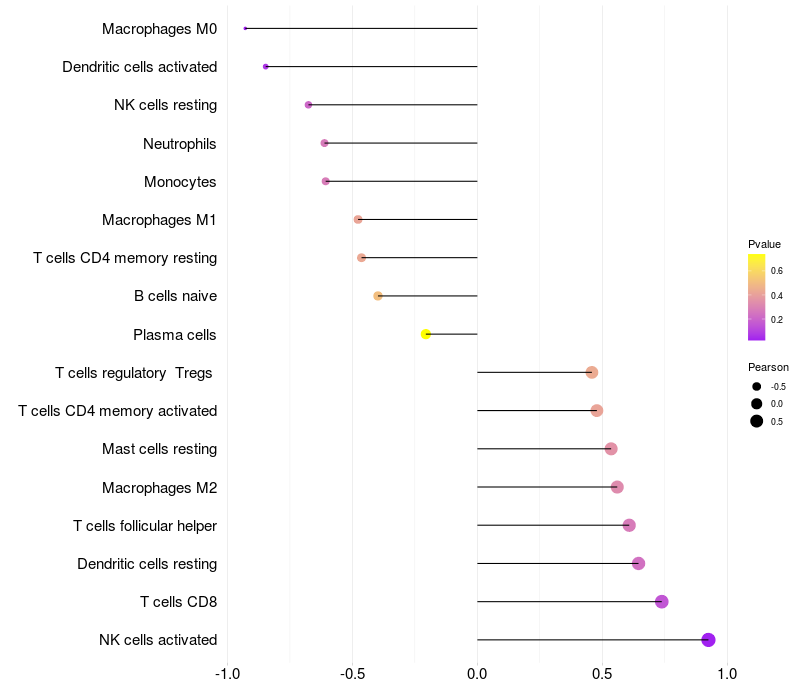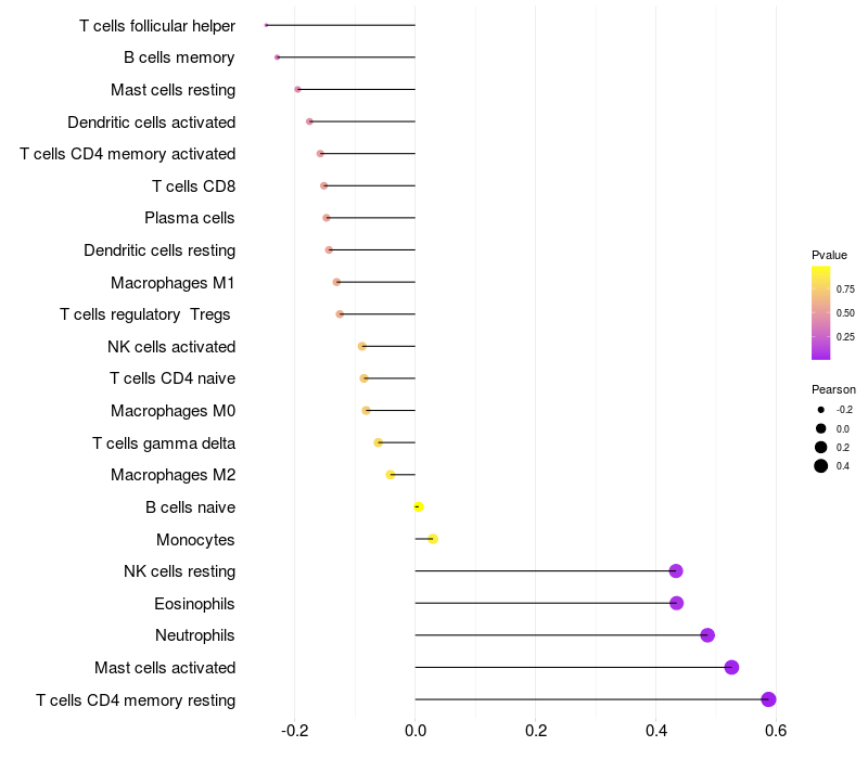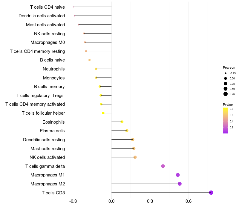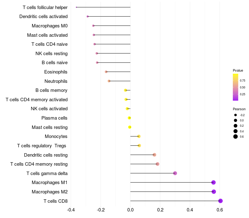 Lollipop of LOC153910 expression and immune infiltrating cell level correlation result in HPV+ samples