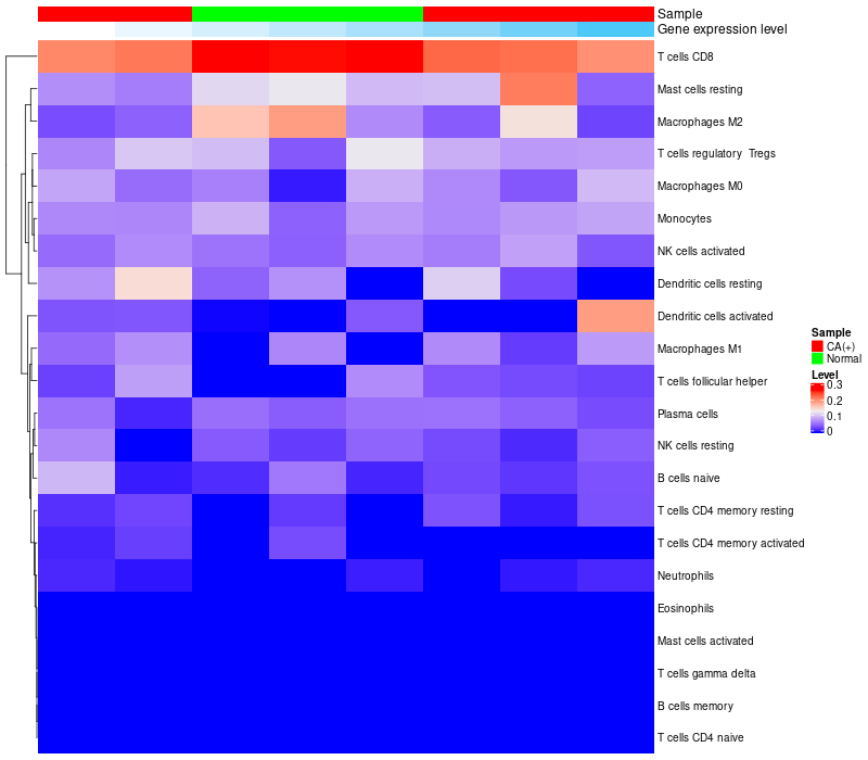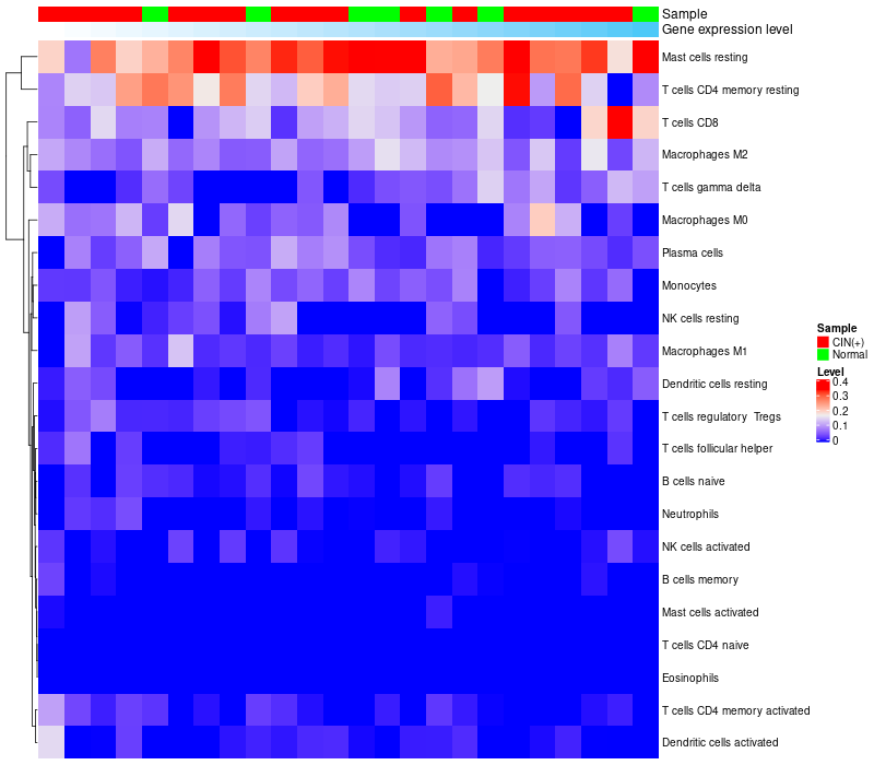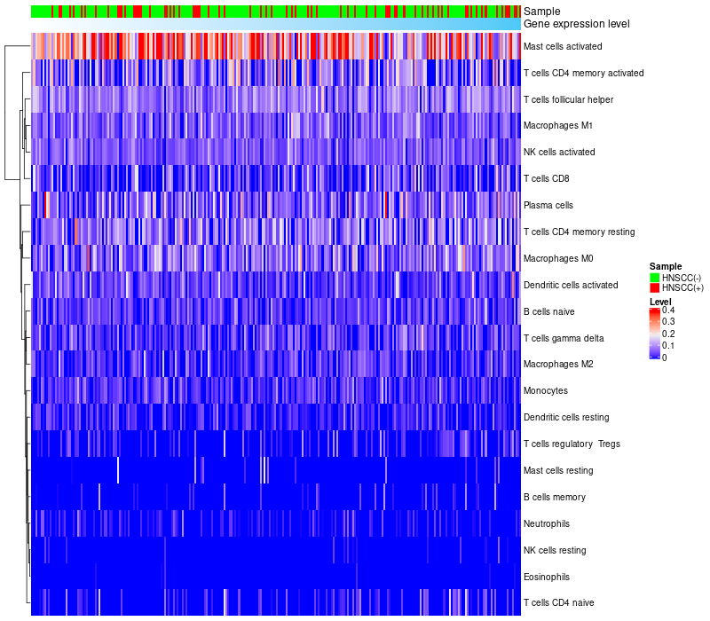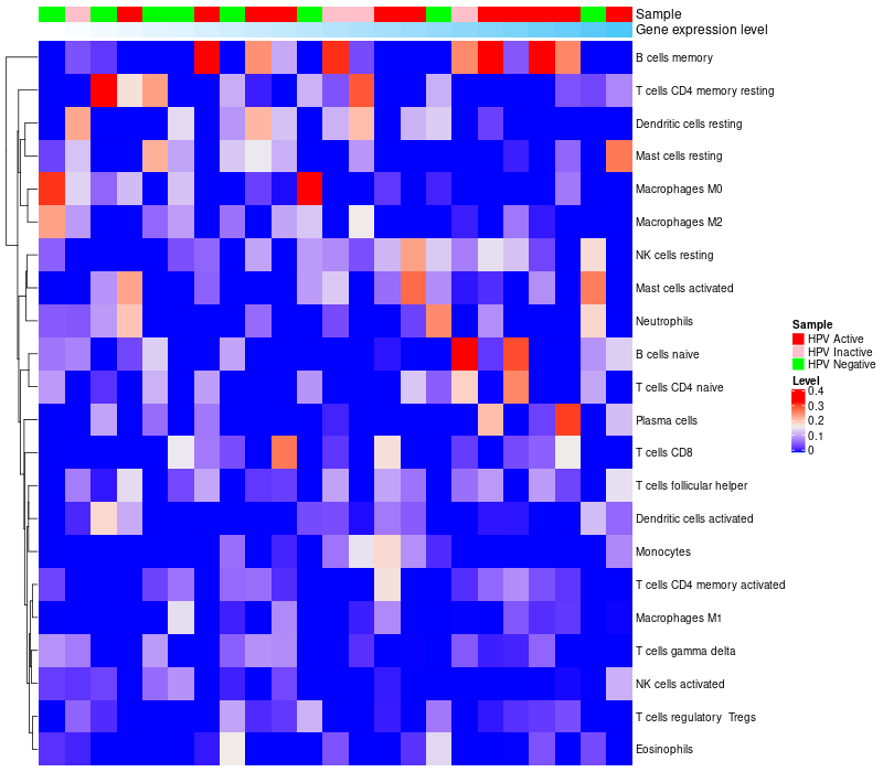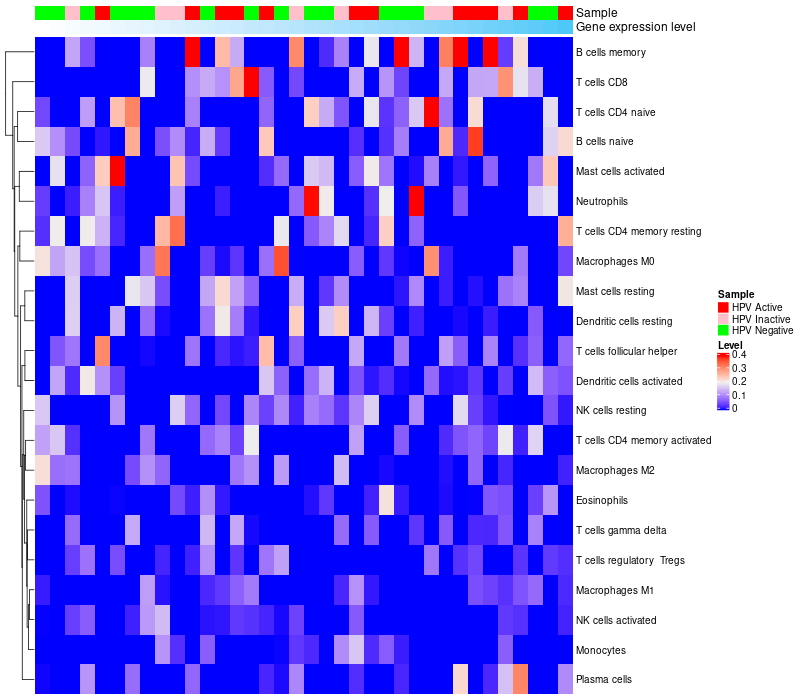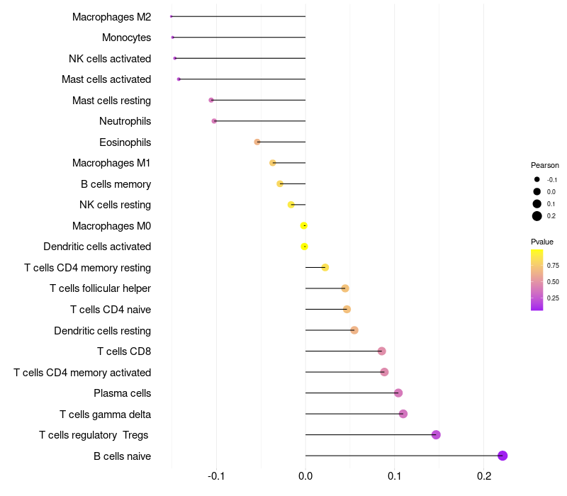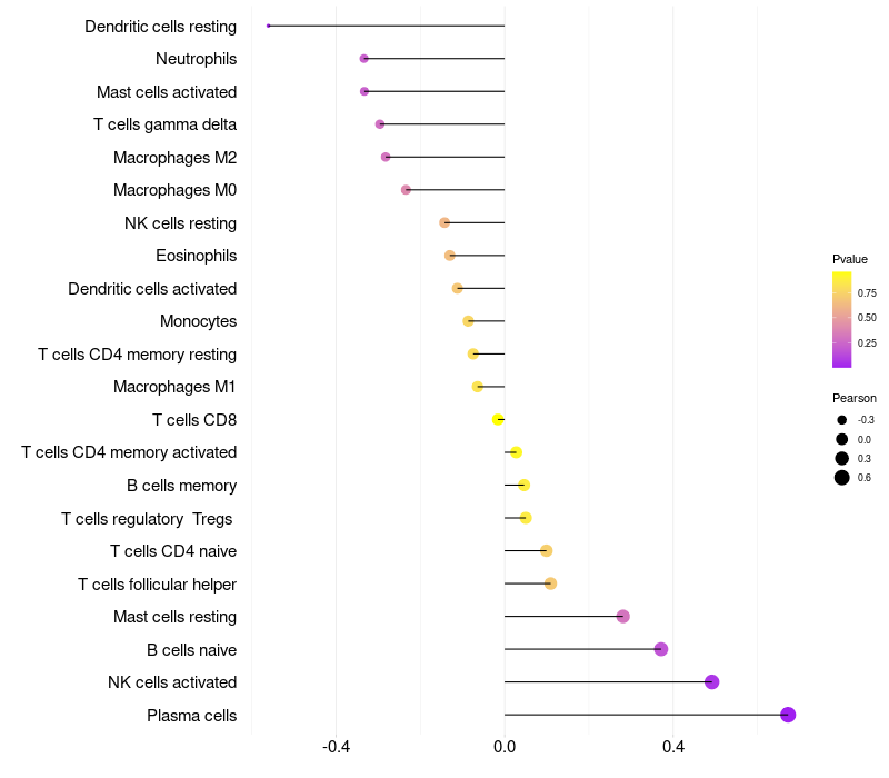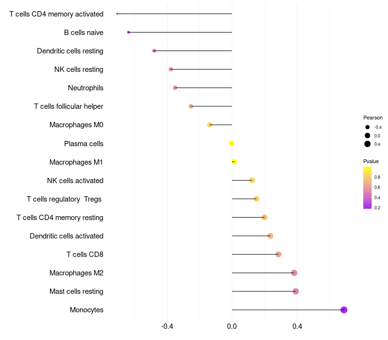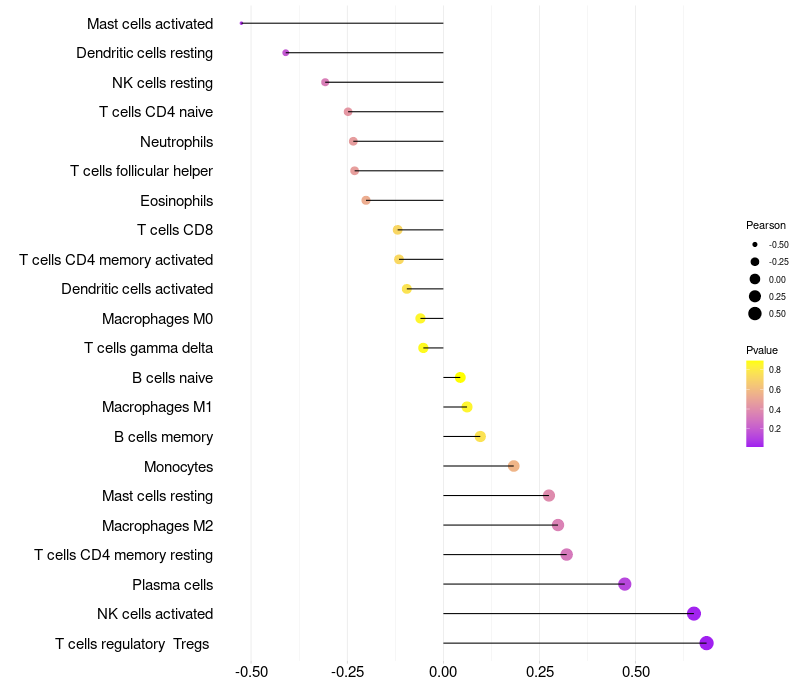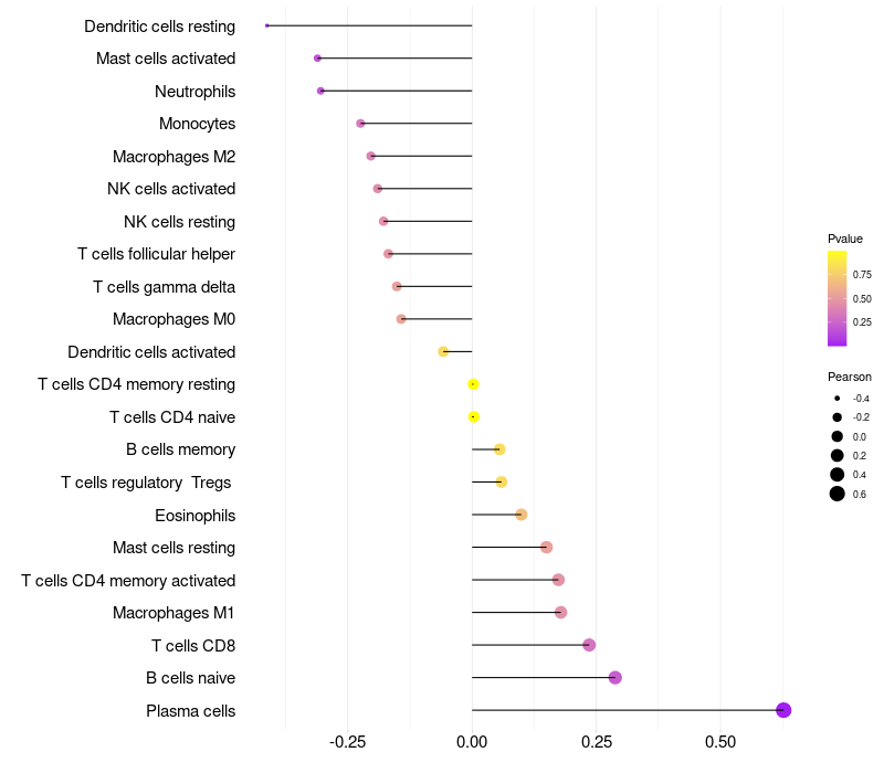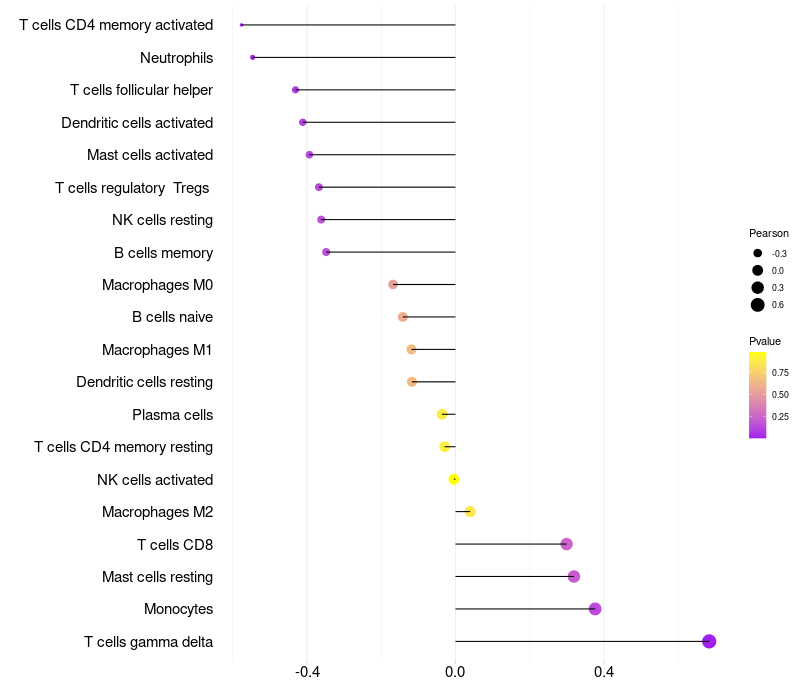Lollipop of LOC283683 expression and immune infiltrating cell level correlation result in HPV+ samples