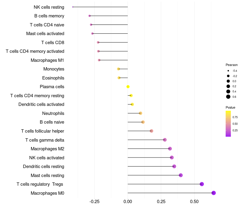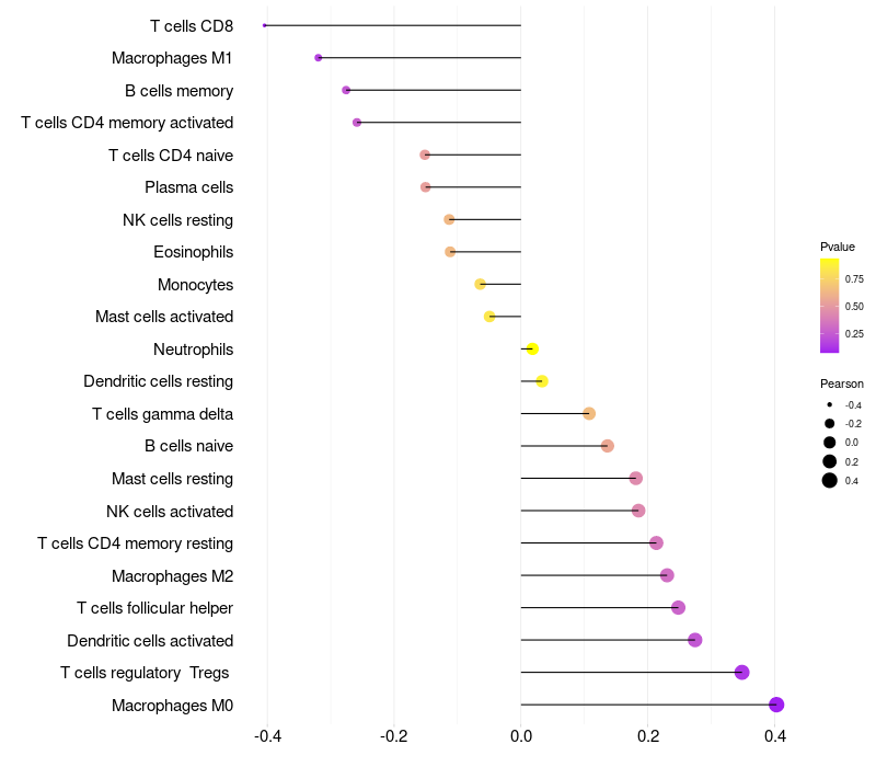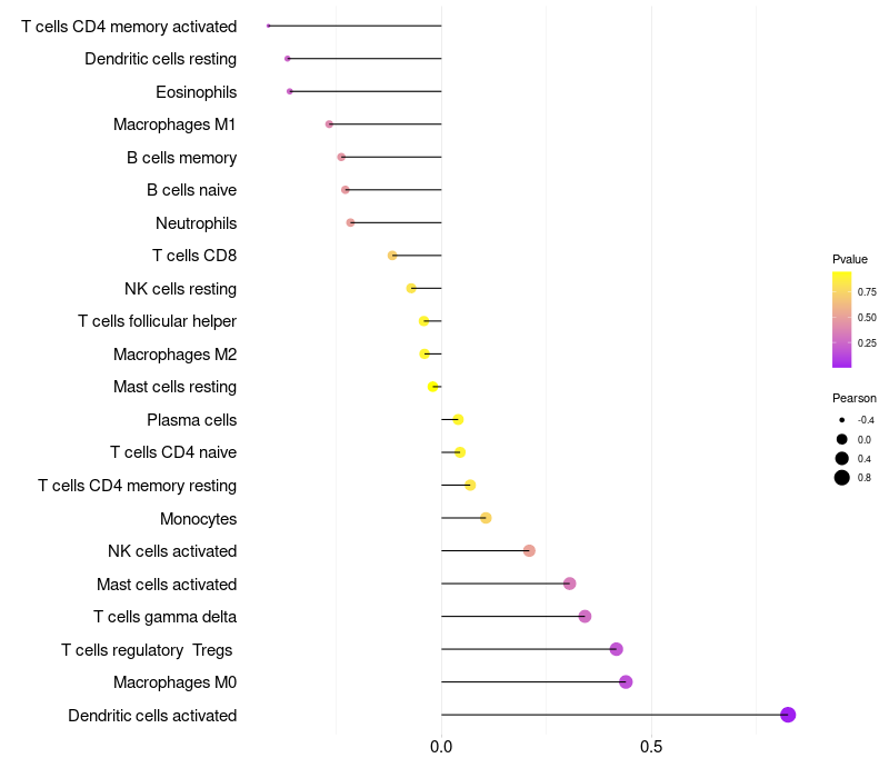 Lollipop of LOC339685 expression and immune infiltrating cell level correlation result in HPV+ samples