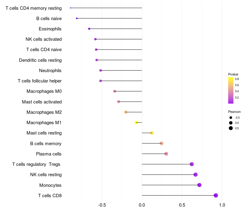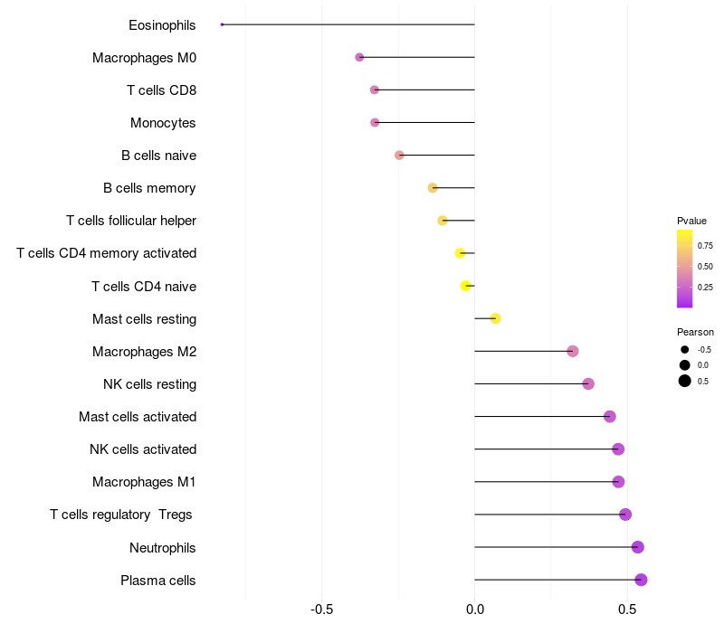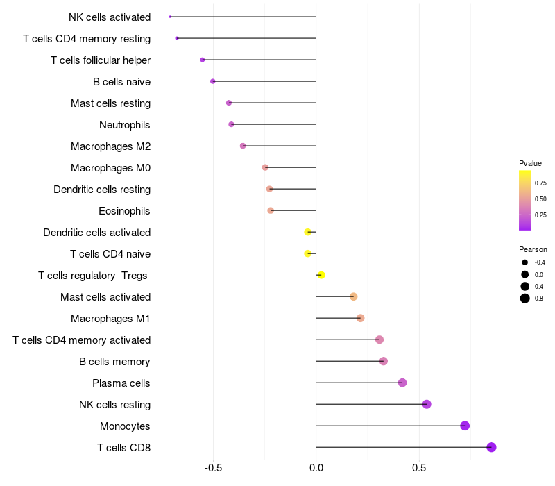 Lollipop of LOC388572 expression and immune infiltrating cell level correlation result in HBV+ Liver cirrhosis samples