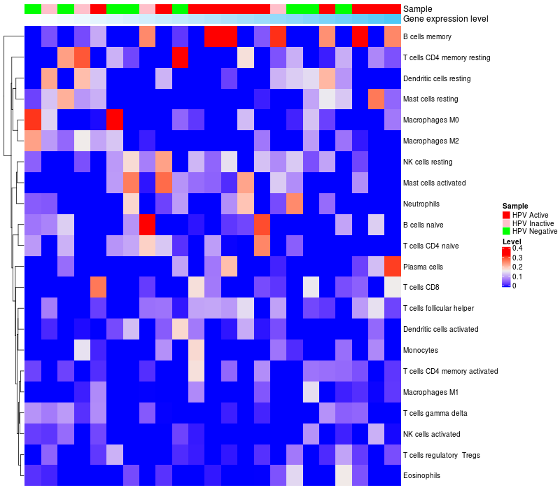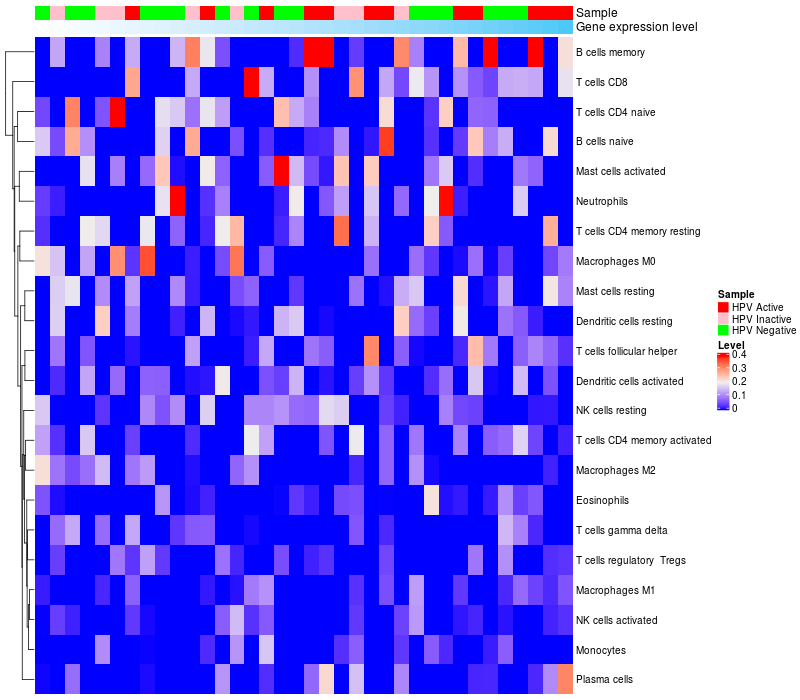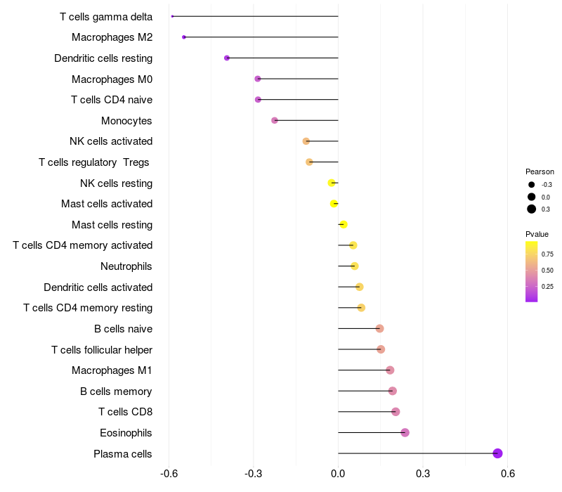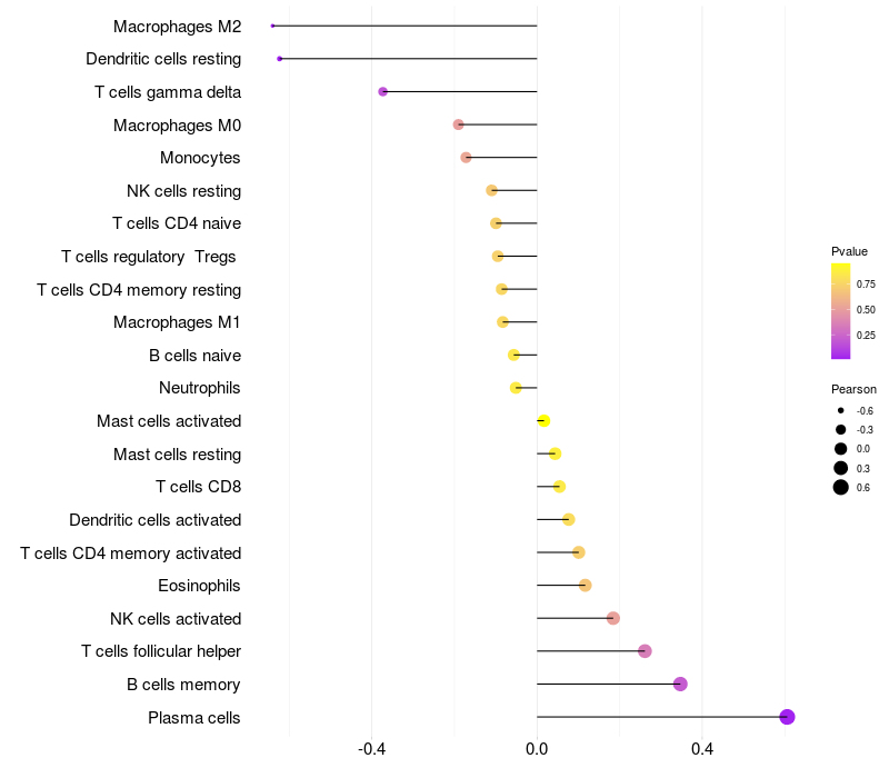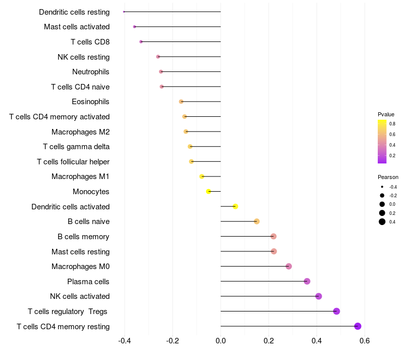 Lollipop of LOC389602 expression and immune infiltrating cell level correlation result in HPV+ samples