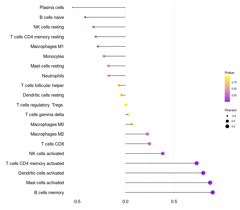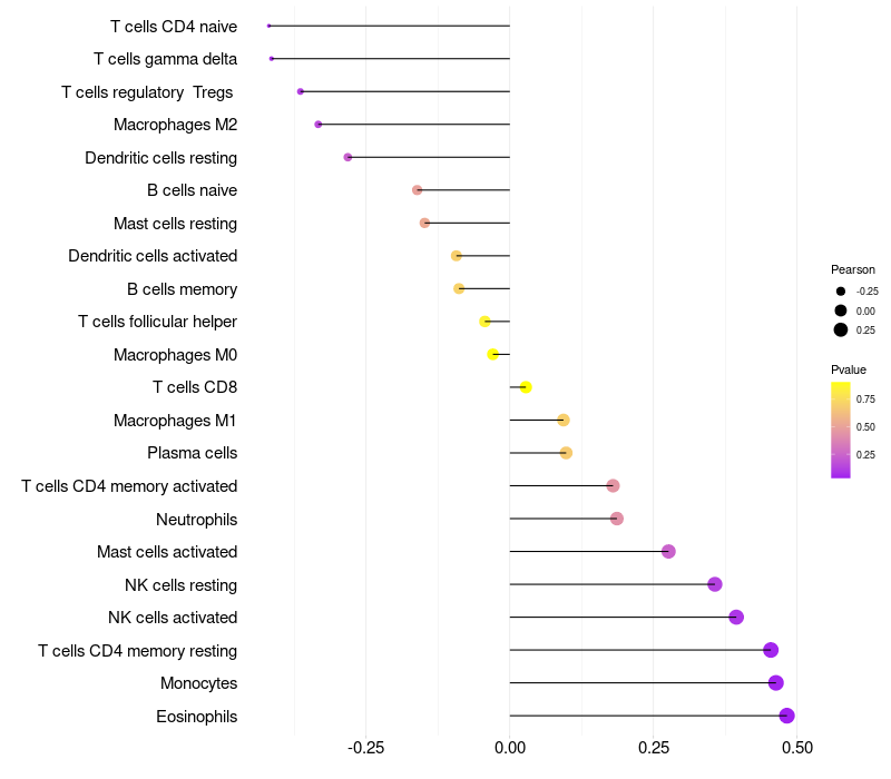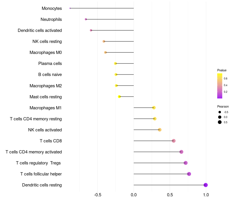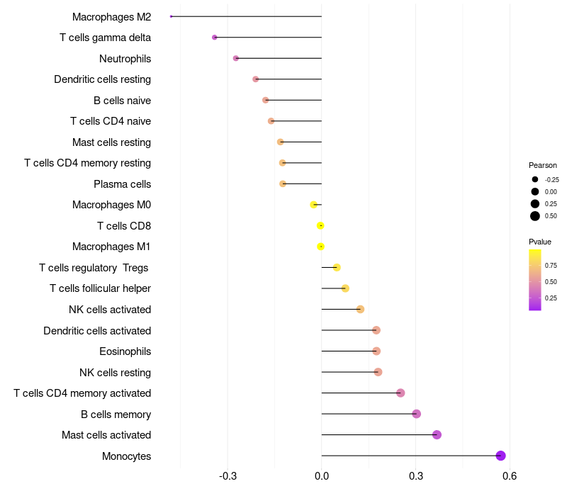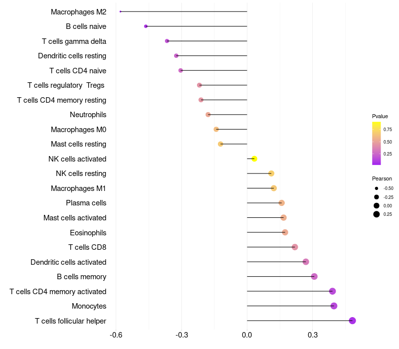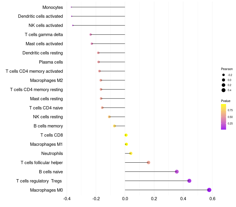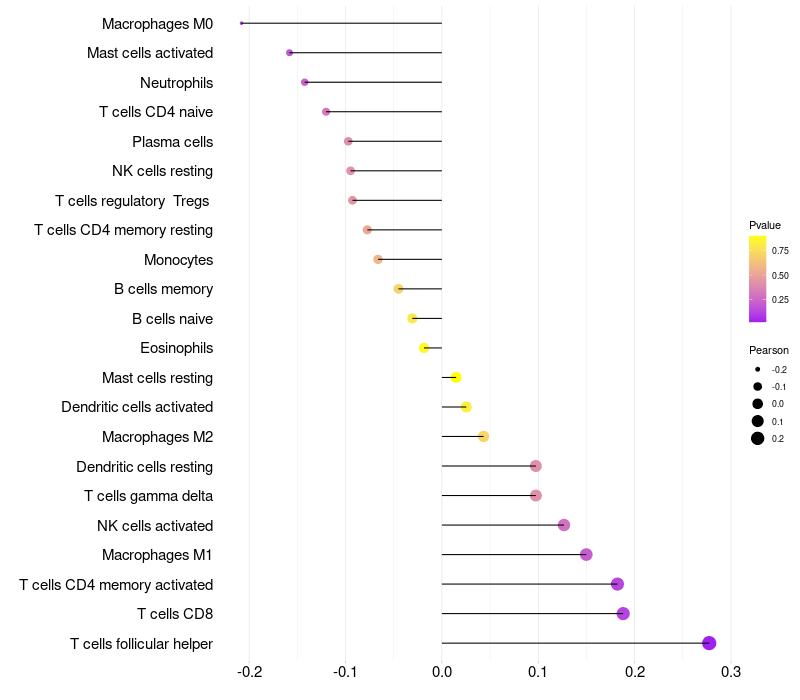 Lollipop of LOC390705 expression and immune infiltrating cell level correlation result in HPV+ samples