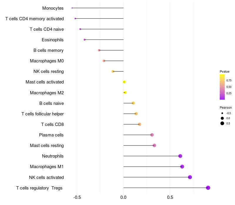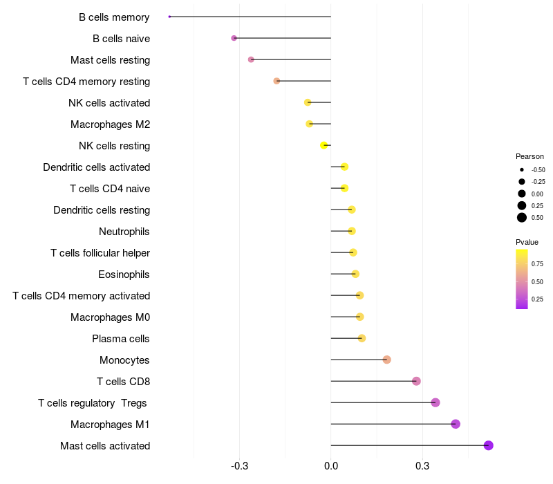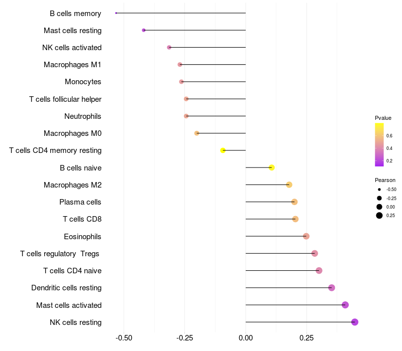 Lollipop of LOC400499 expression and immune infiltrating cell level correlation result in HBV+ Liver cirrhosis samples