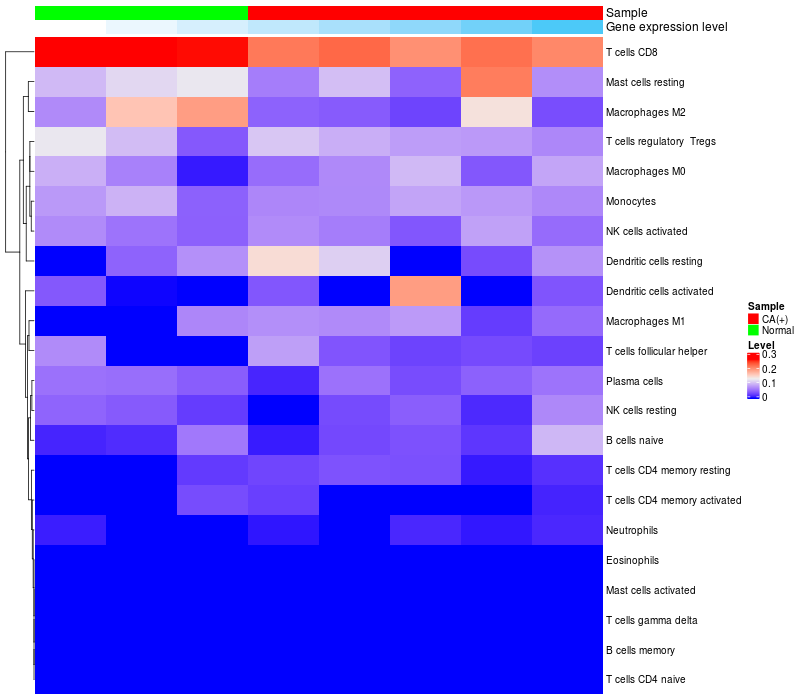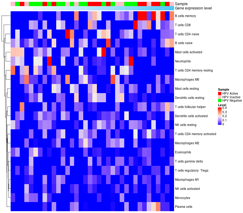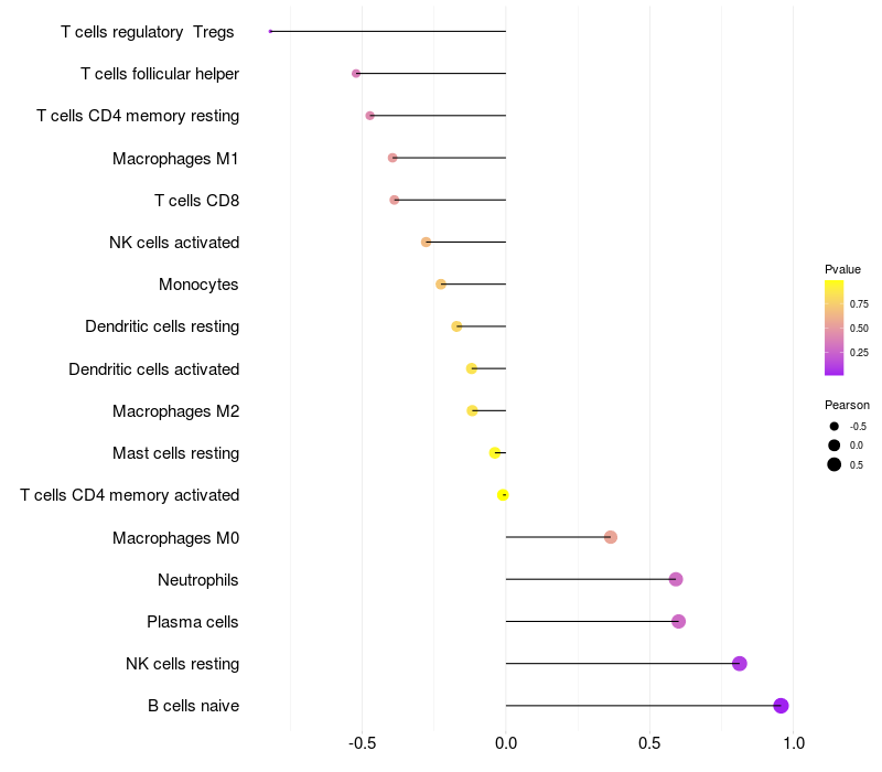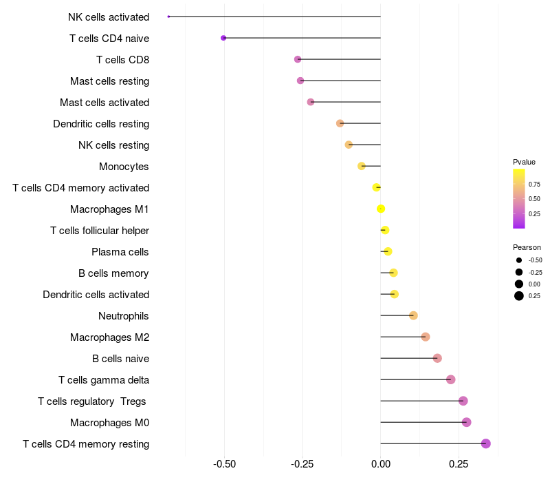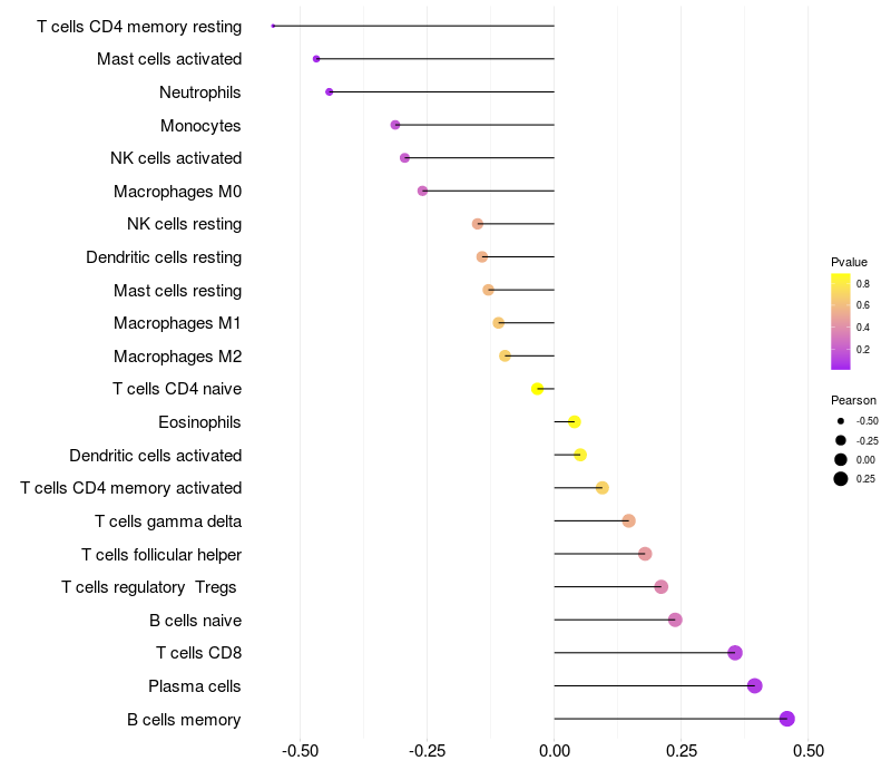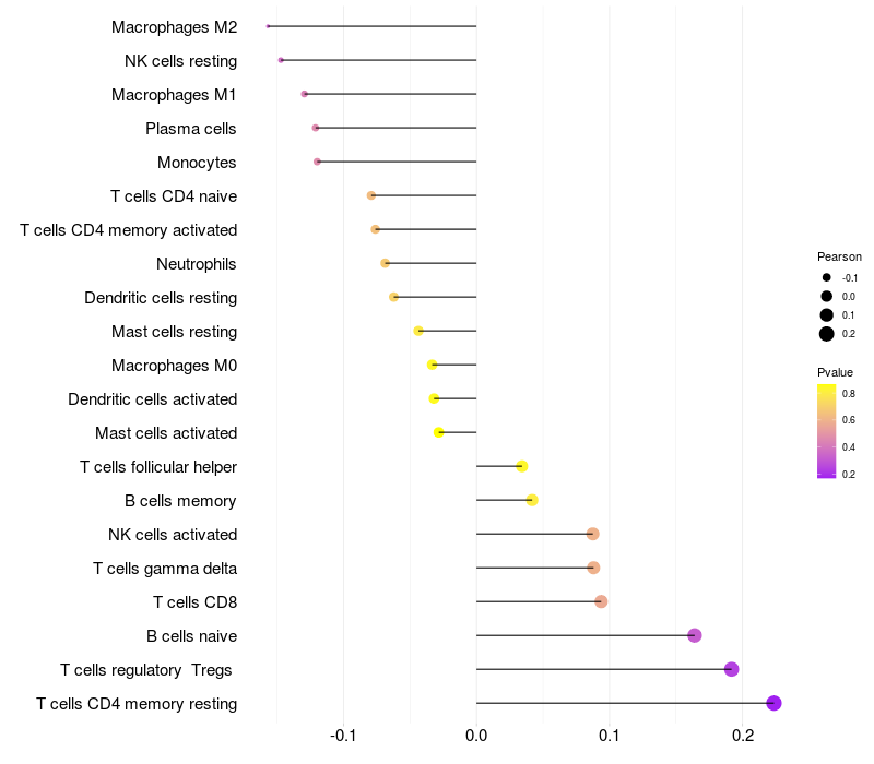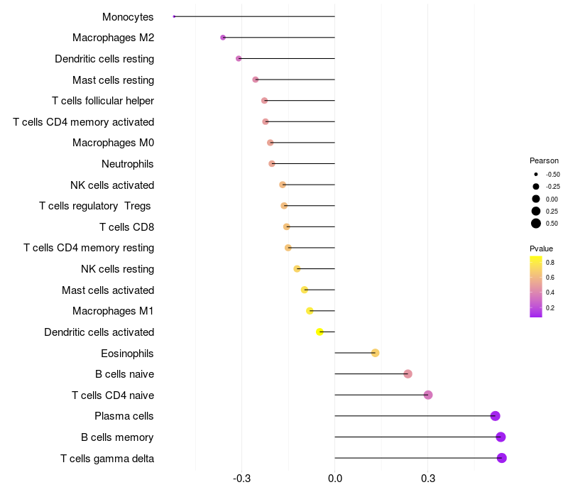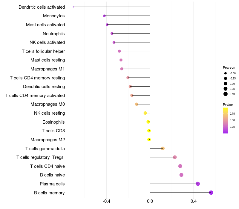 Lollipop of LOC441666 expression and immune infiltrating cell level correlation result in HPV+ samples