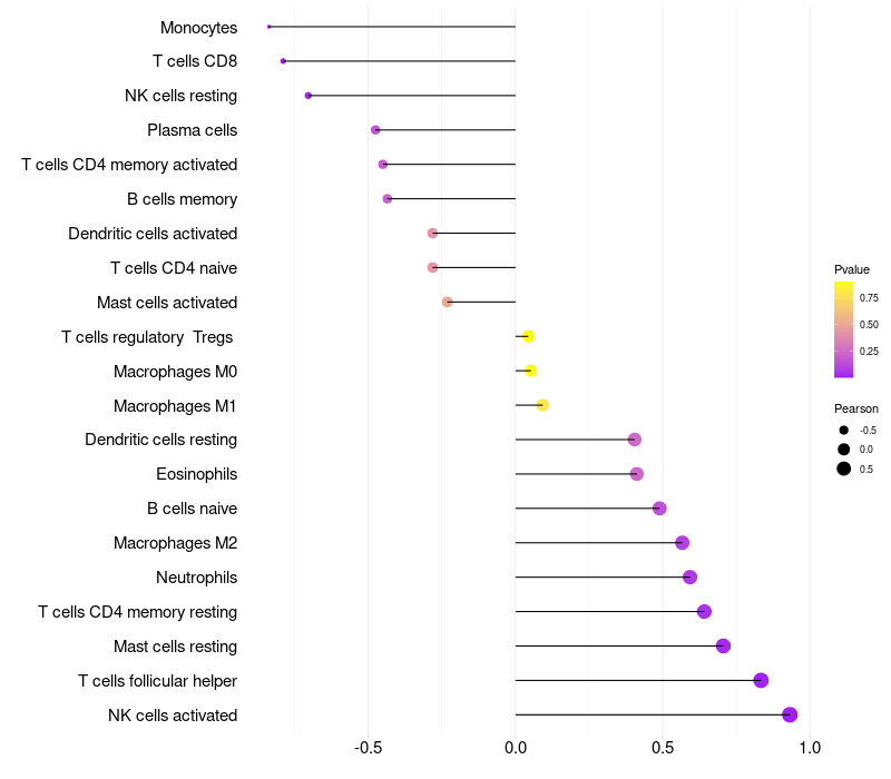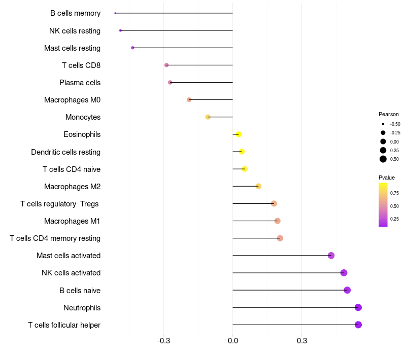 Lollipop of LOC642361 expression and immune infiltrating cell level correlation result in HBV+ Liver cirrhosis samples