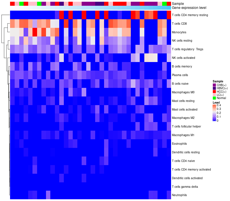 Chronic hepatitis B patients (HBV+)(10),Hepatocellular carcinoma (HBV+)(10),Liver cirrhosis(HBV+)(10),Normal(3),HBV carriers (3) |