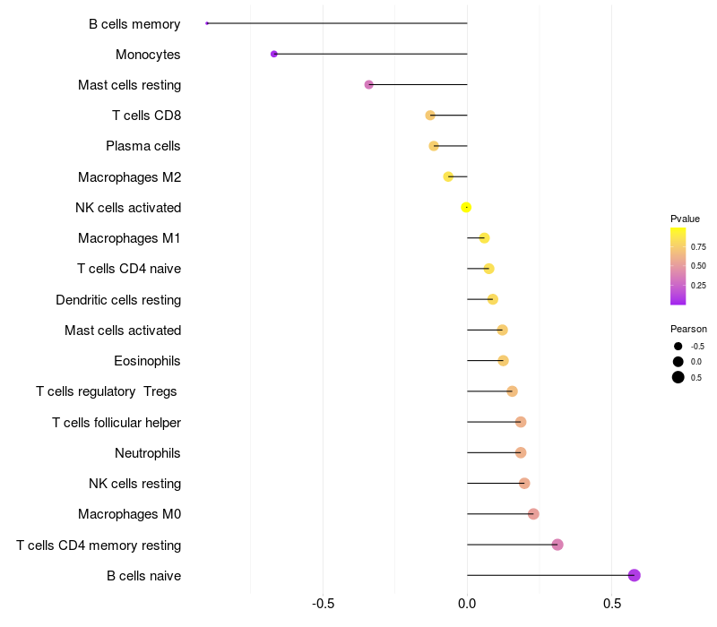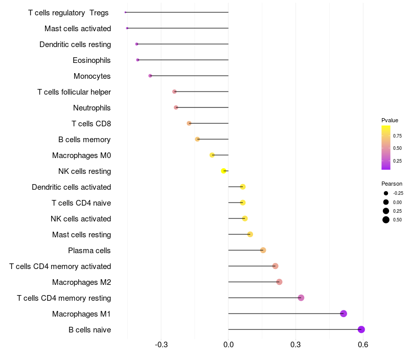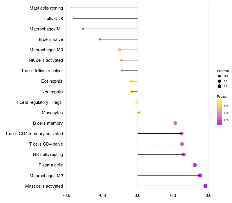 Lollipop of LOC643339 expression and immune infiltrating cell level correlation result in HBV+ Liver cirrhosis samples