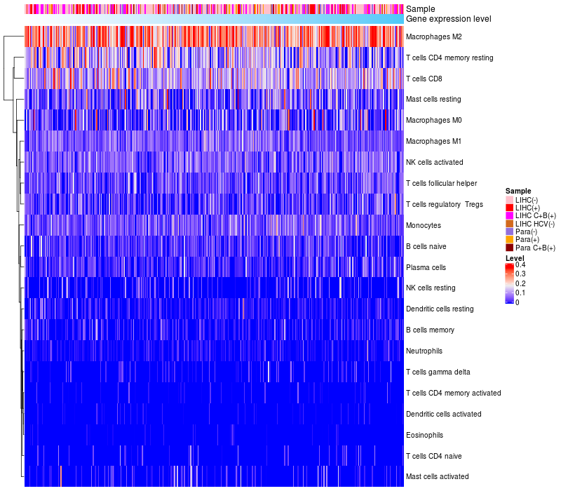 Liver hepatocellular carcinoma HCV (HBV+)(86), Liver hepatocellular carcinoma HCV (HBV-)(19), Liver hepatocellular carcinoma (HBV+)(209), Liver hepatocellular carcinoma (HBV+)(60), Paracancerous HCV (HBV+)(4), Paracancerous (HBV-)(28), Paracancerous (HBV+)(18) |