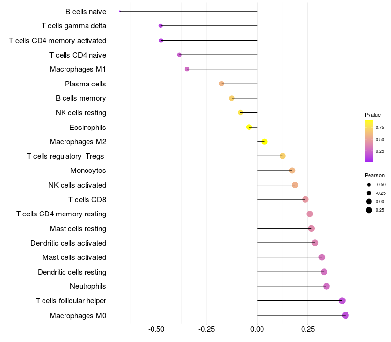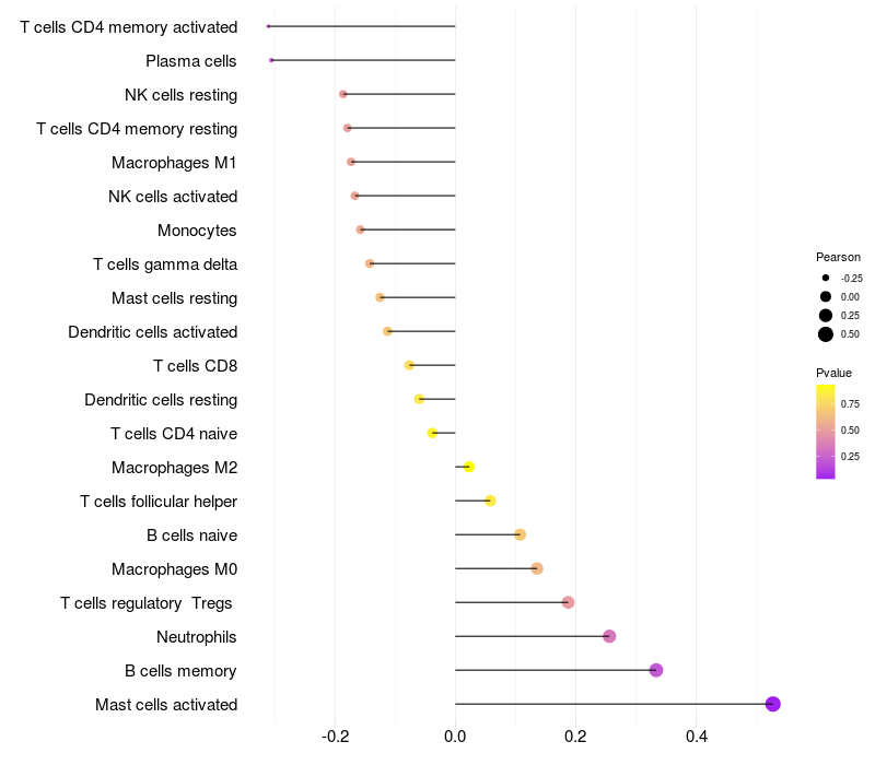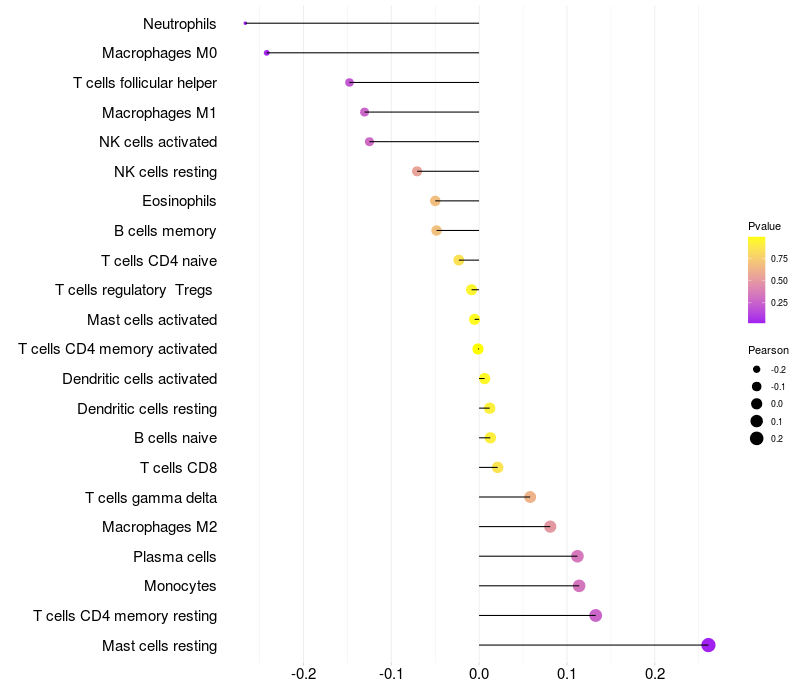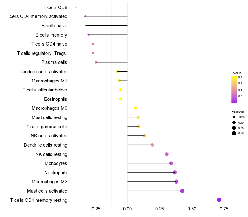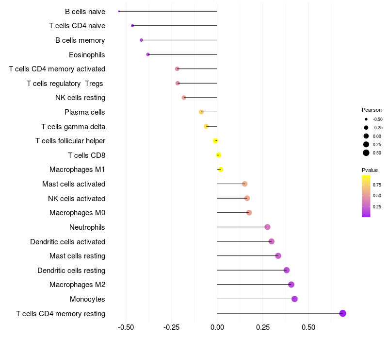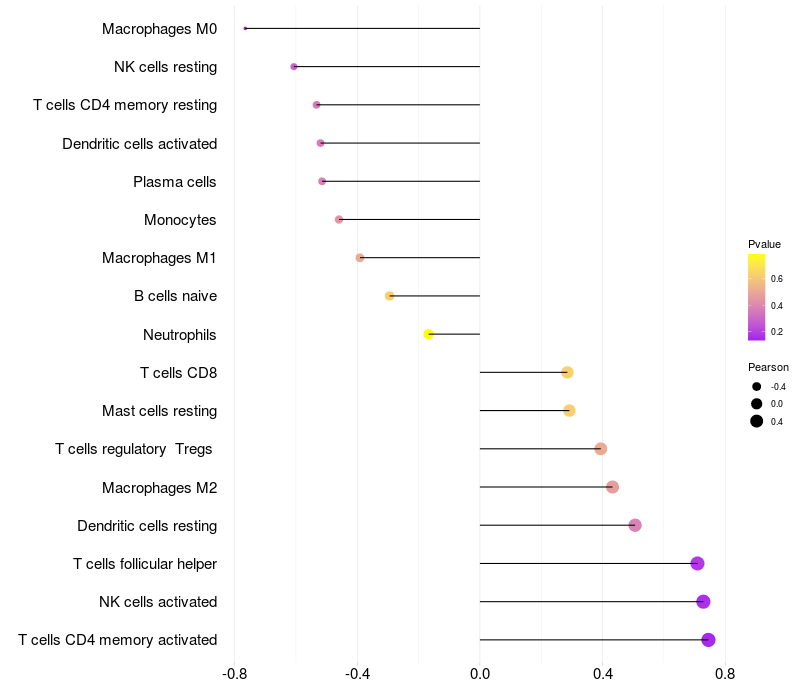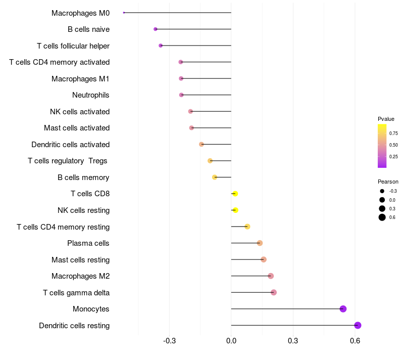 Lollipop of LOXL4 expression and immune infiltrating cell level correlation result in HPV+ samples