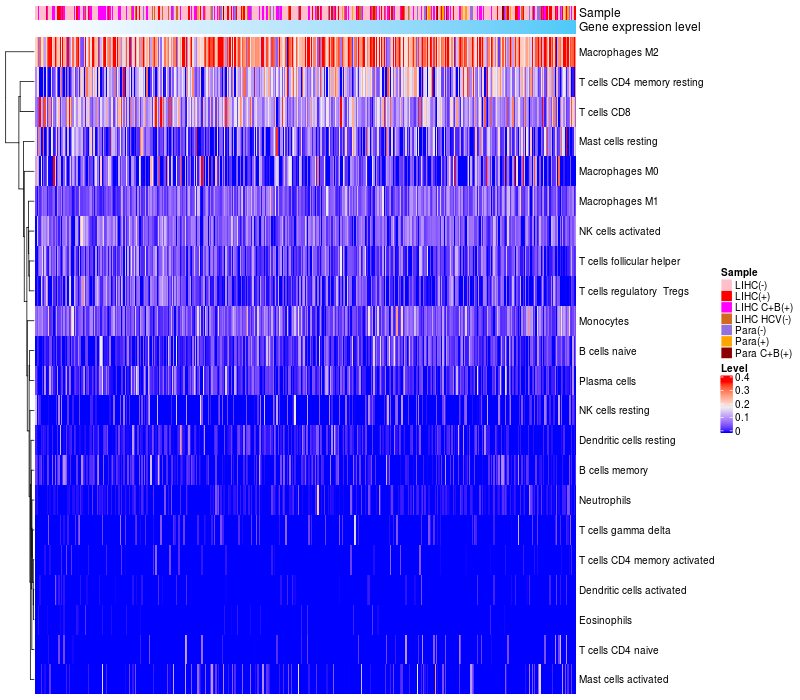 Liver hepatocellular carcinoma HCV (HBV+)(86), Liver hepatocellular carcinoma HCV (HBV-)(19), Liver hepatocellular carcinoma (HBV+)(209), Liver hepatocellular carcinoma (HBV+)(60), Paracancerous HCV (HBV+)(4), Paracancerous (HBV-)(28), Paracancerous (HBV+)(18) |