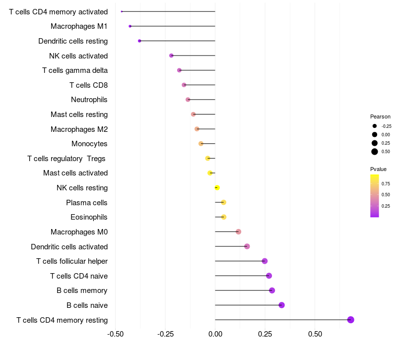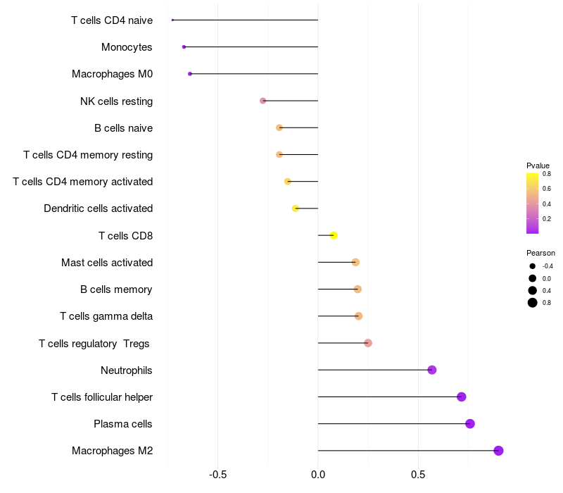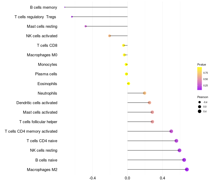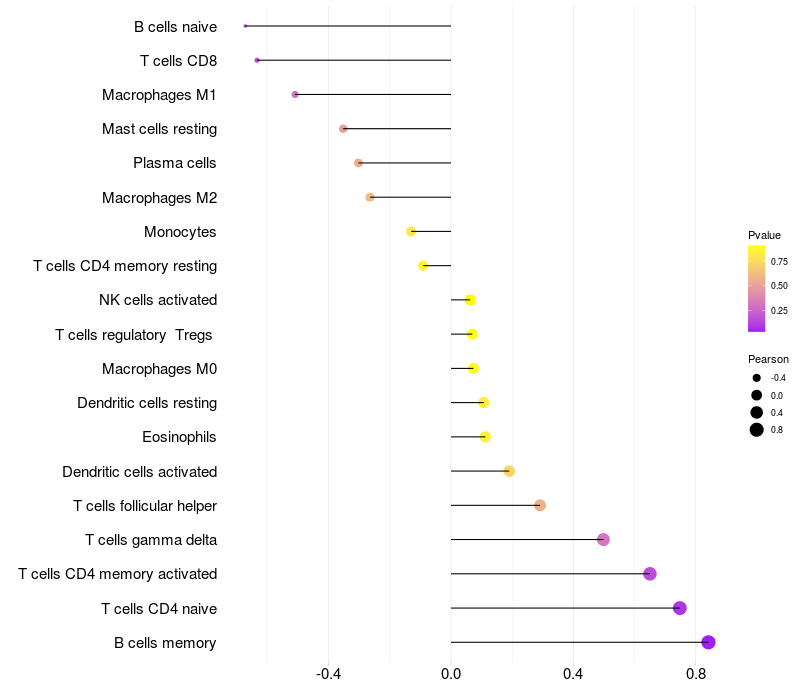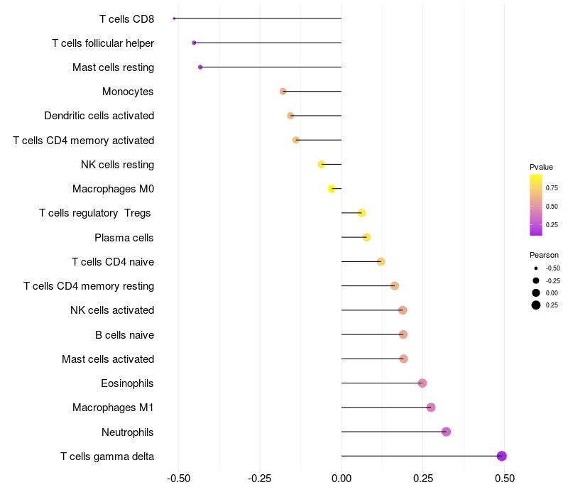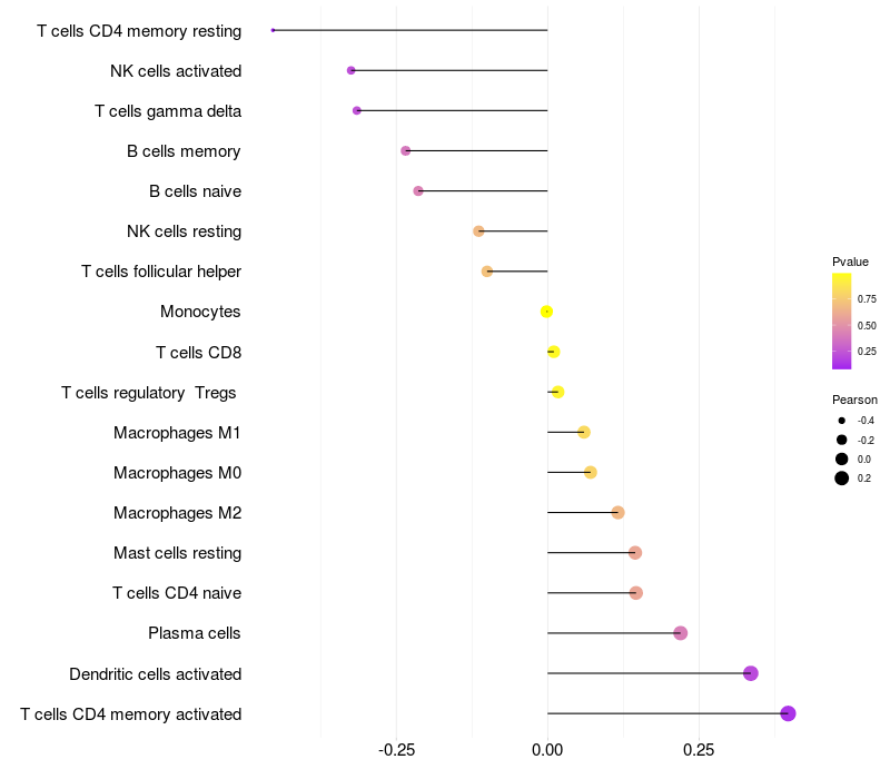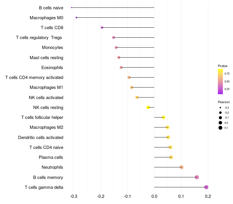 Lollipop of LRP11 expression and immune infiltrating cell level correlation result in EBV+ samples