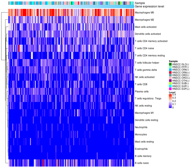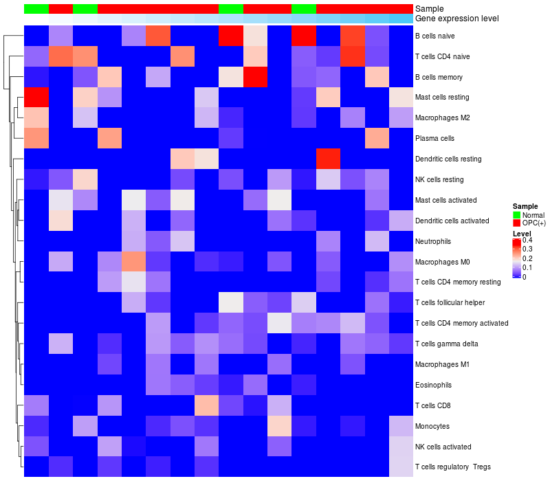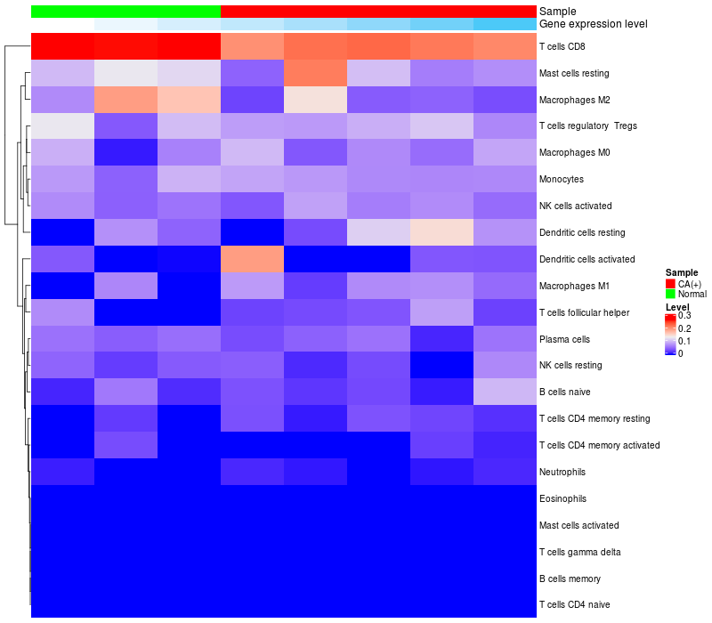 • Left: Heatmap of target gene expression and the level of various types of immune cells (cell type fractions) in all samples based on CIBERSORT method.