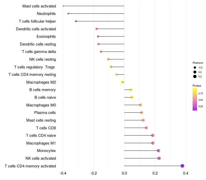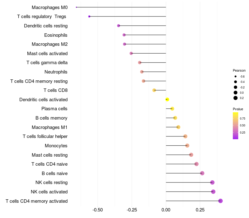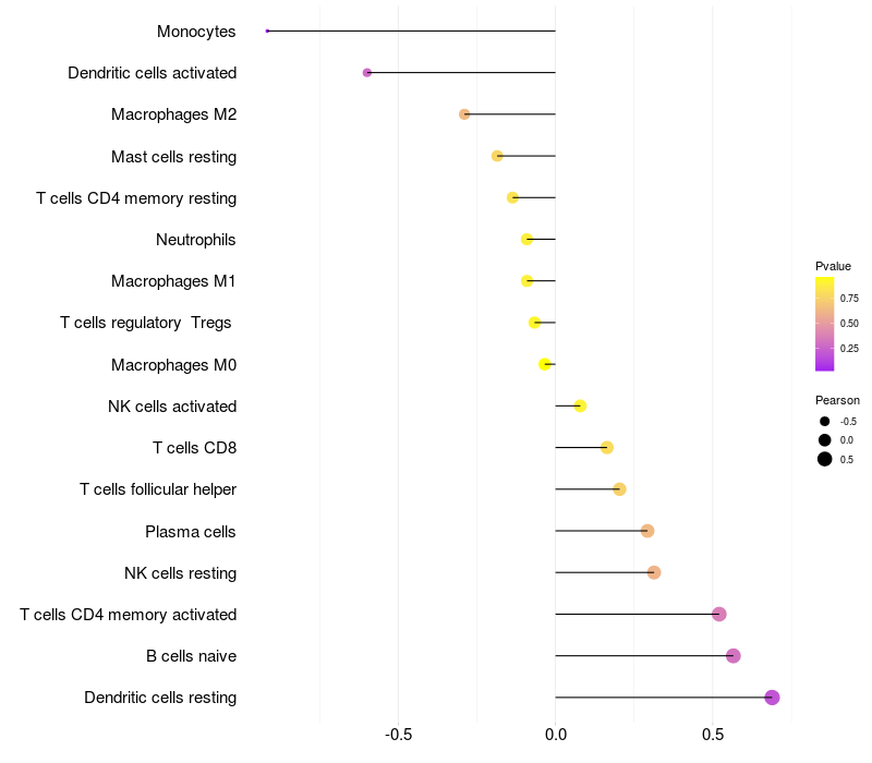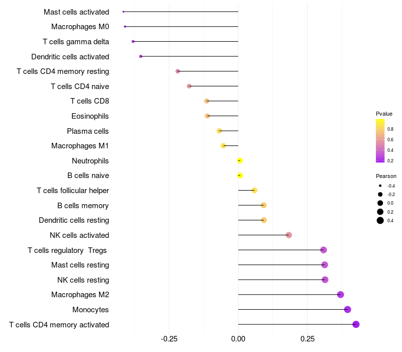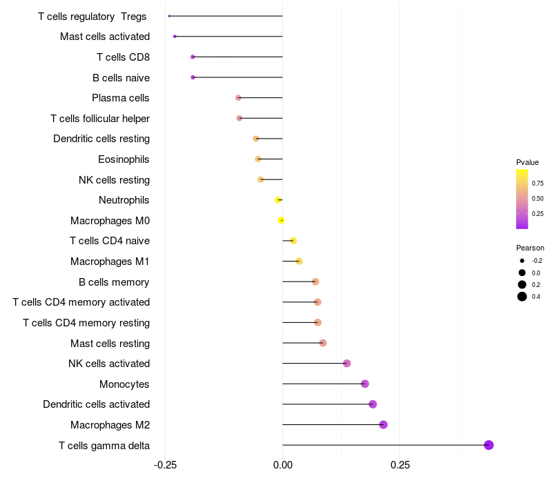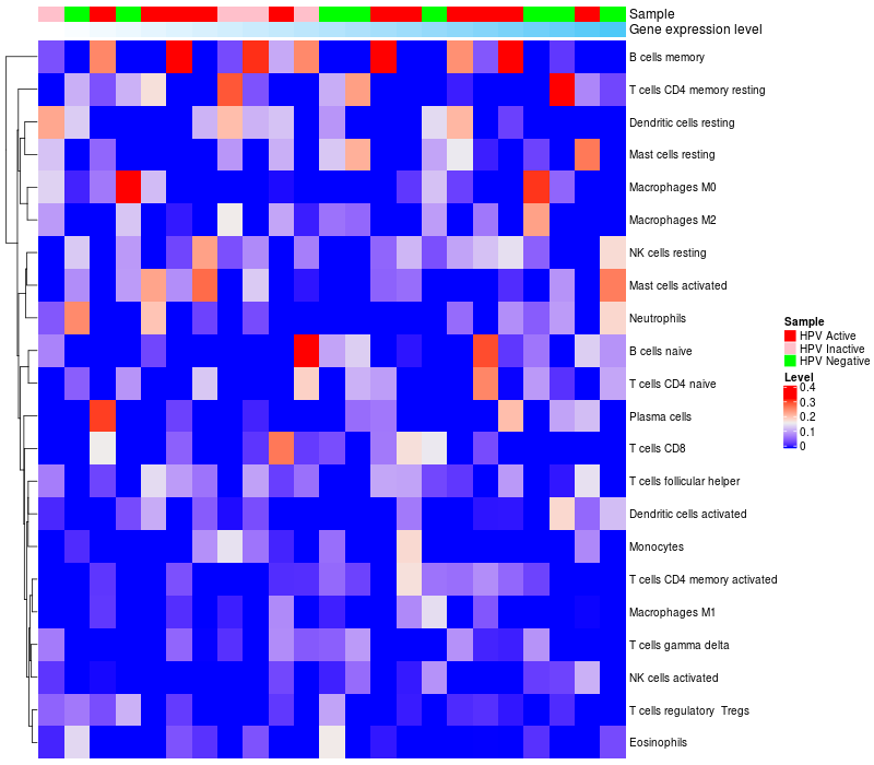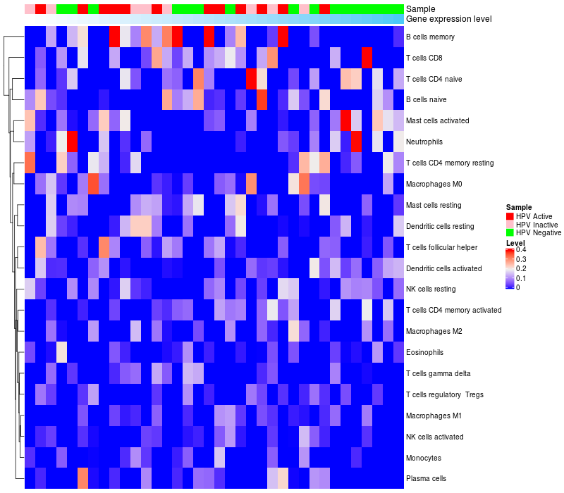 HeatMap of cell type fractions in all samples Lollipop of LRR1 expression and immune infiltrating cell level correlation result in HPV+ samples