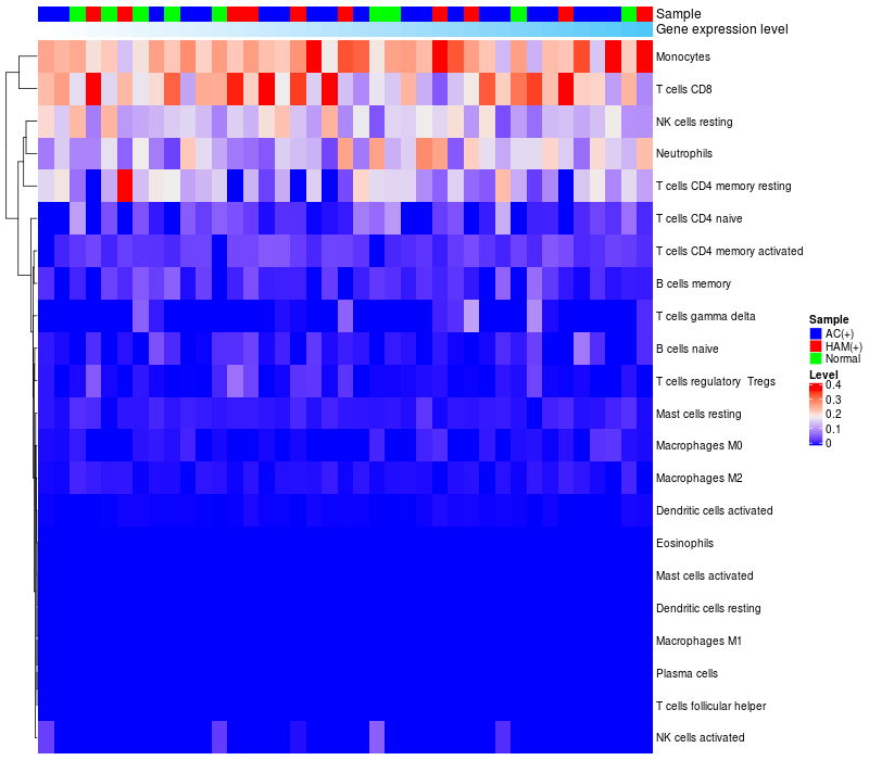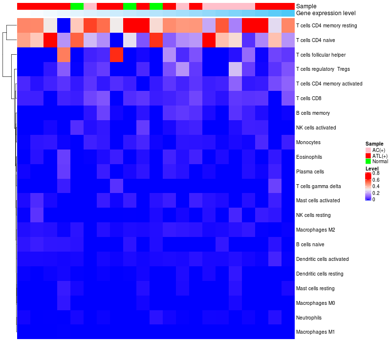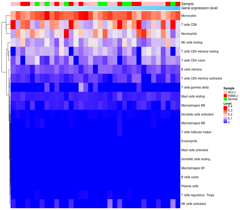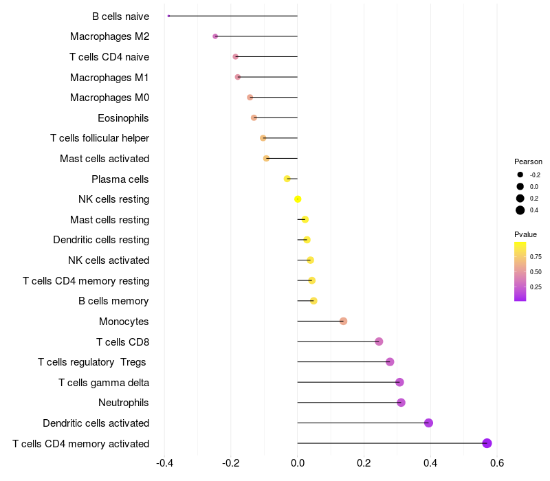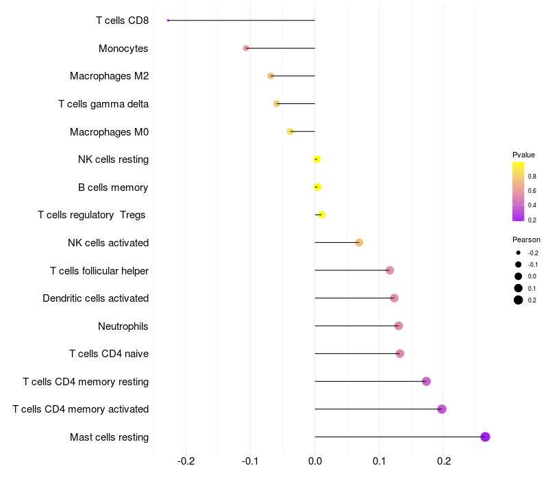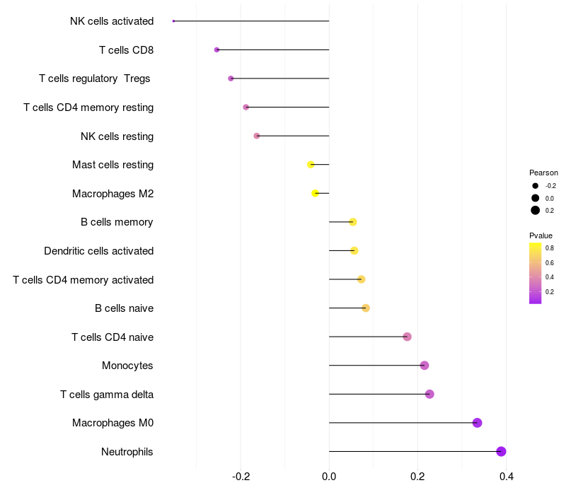 Lollipop of LRRC30 expression and immune infiltrating cell level correlation result in HTLV1+ samples