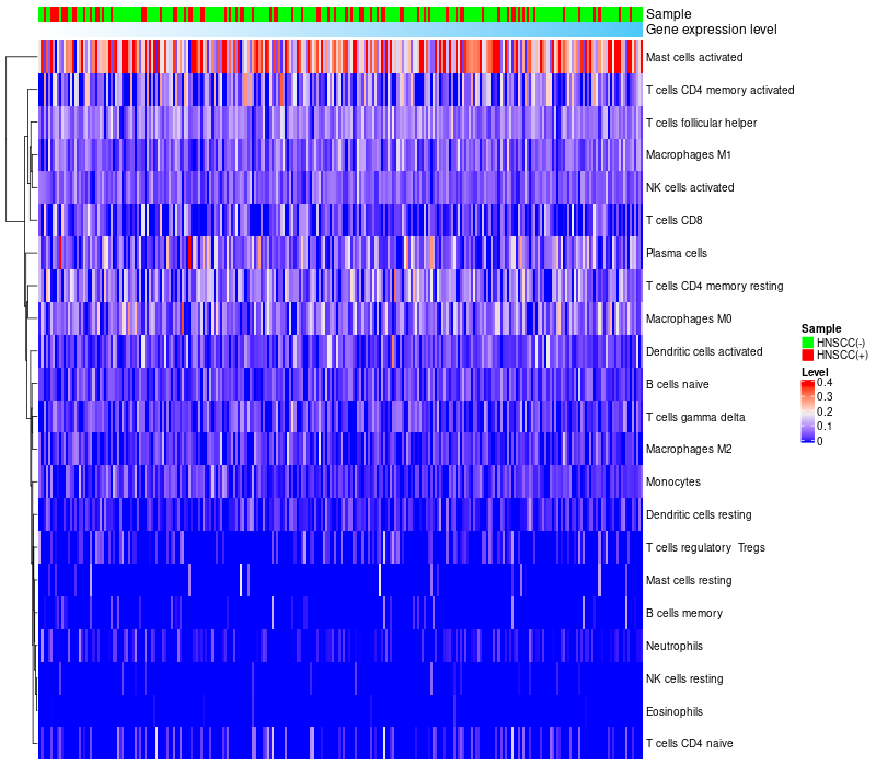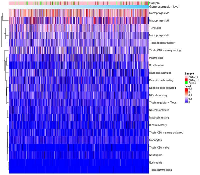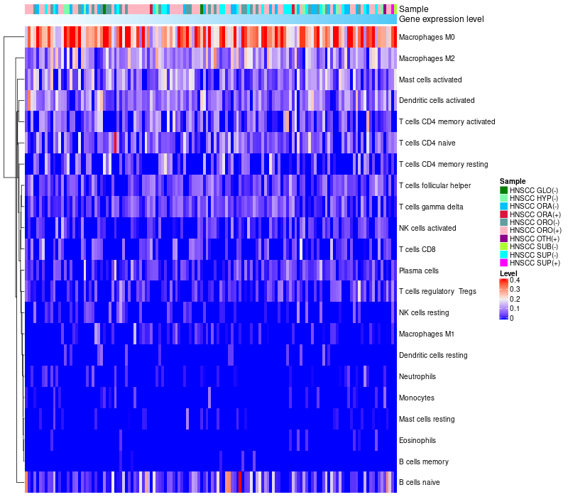 • Left: Heatmap of target gene expression and the level of various types of immune cells (cell type fractions) in all samples based on CIBERSORT method.