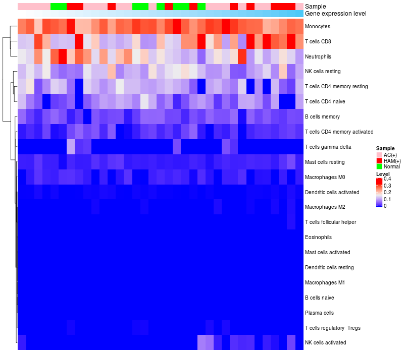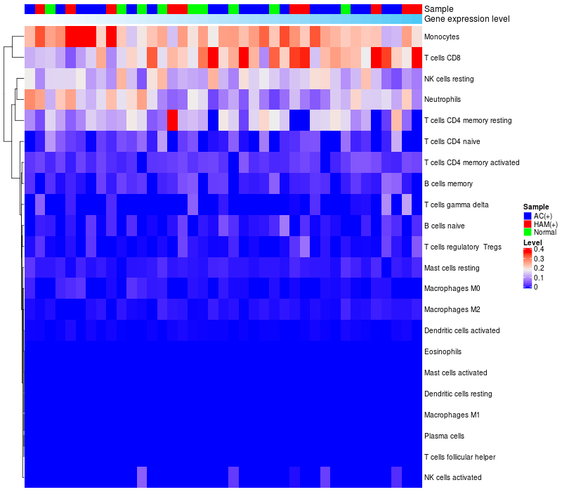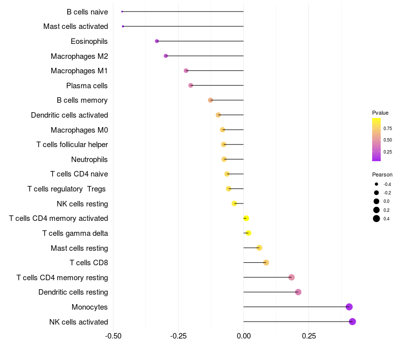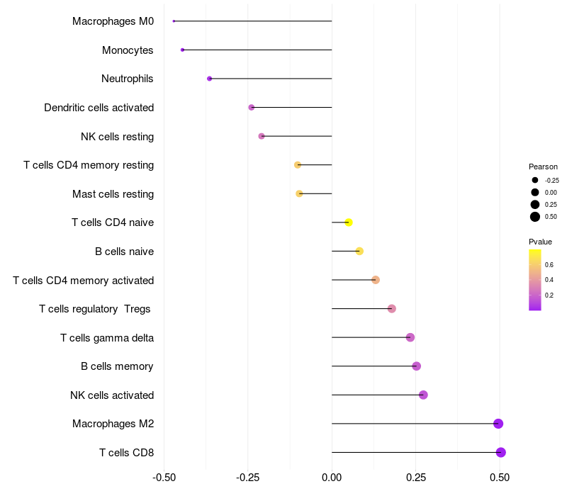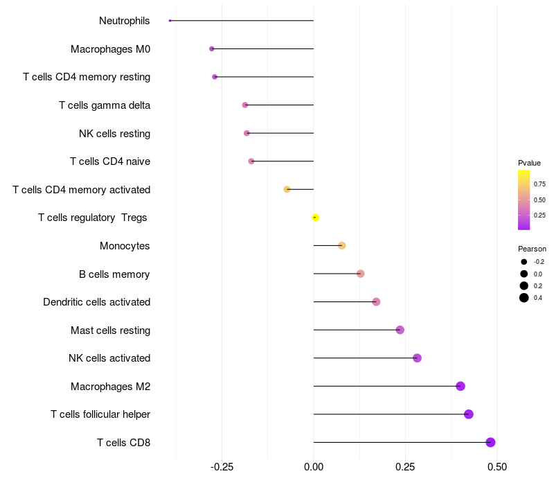 Lollipop of LRRC45 expression and immune infiltrating cell level correlation result in HTLV1+ samples