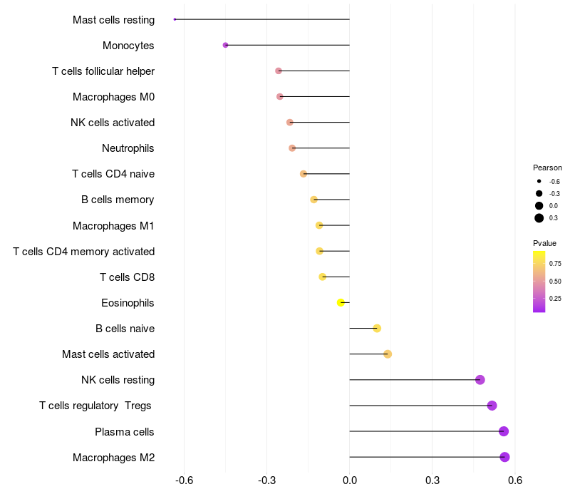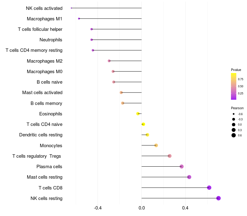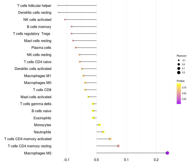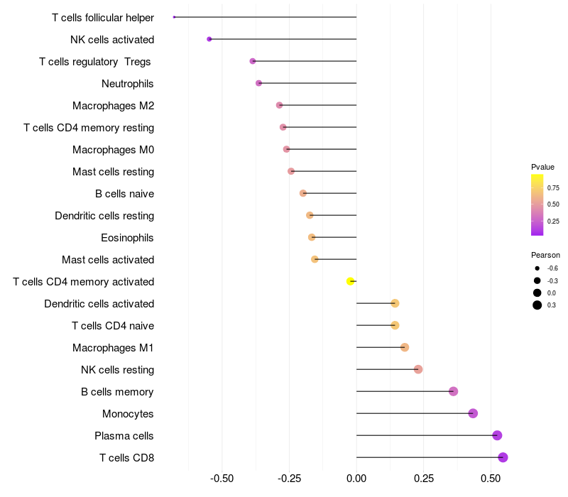 Lollipop of LRRC7 expression and immune infiltrating cell level correlation result in HBV+ Hepatocellular carcinoma samples