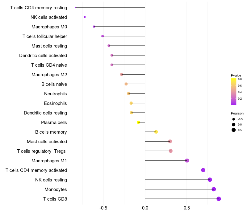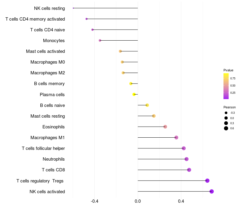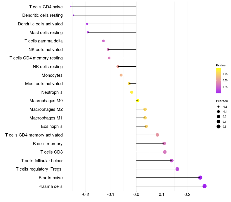 Lollipop of LSR expression and immune infiltrating cell level correlation result in HBV+ Liver cirrhosis samples